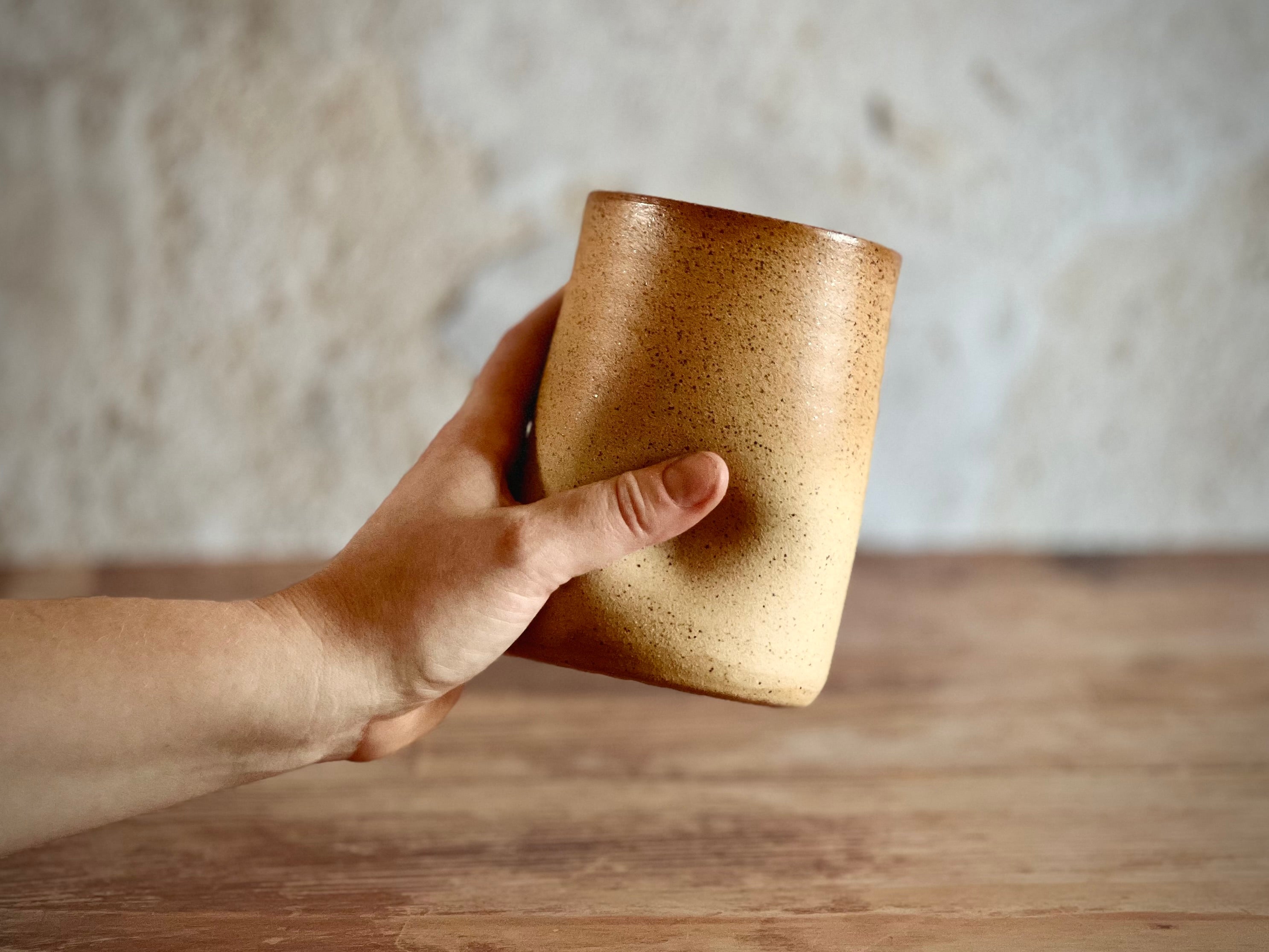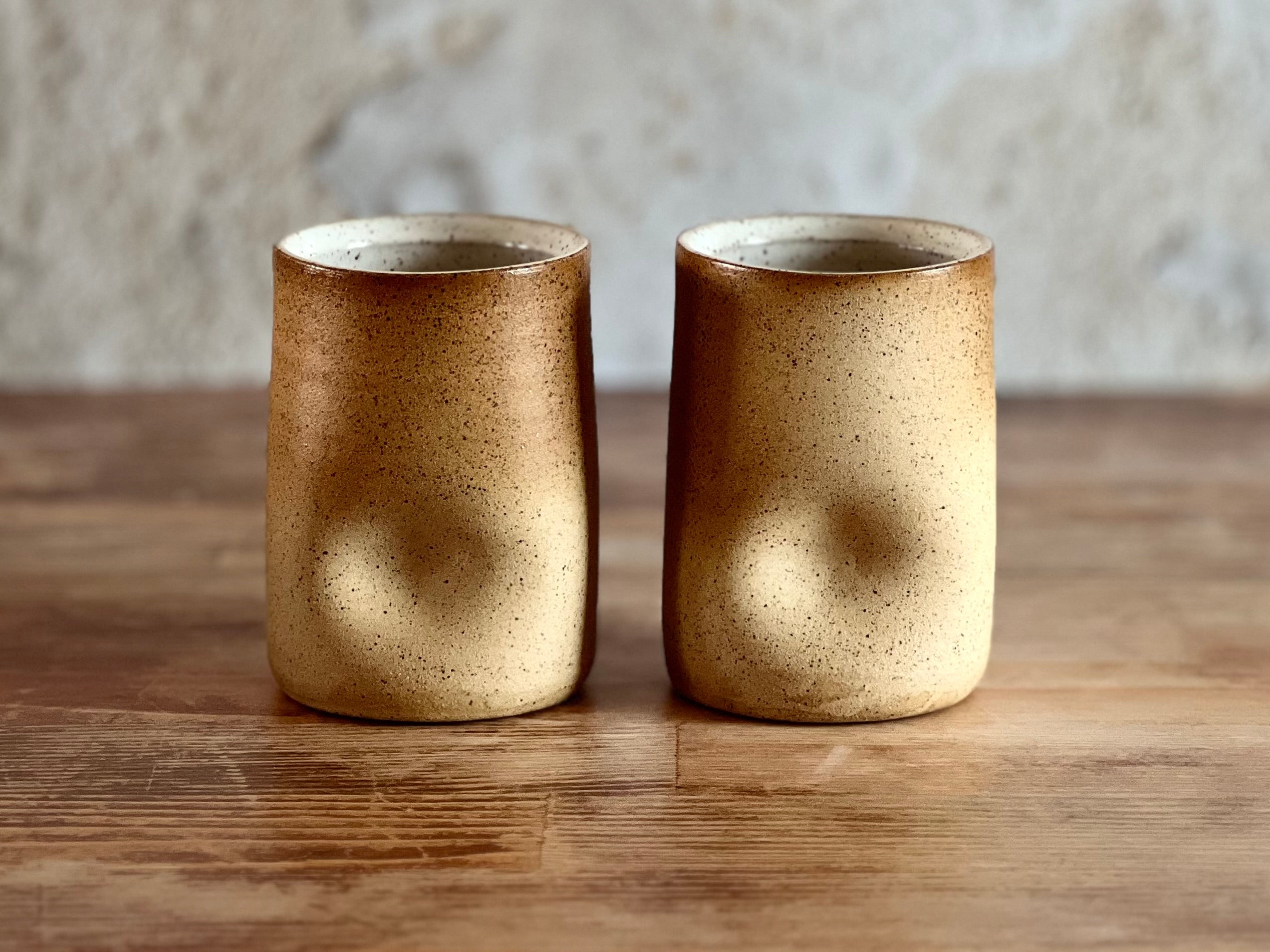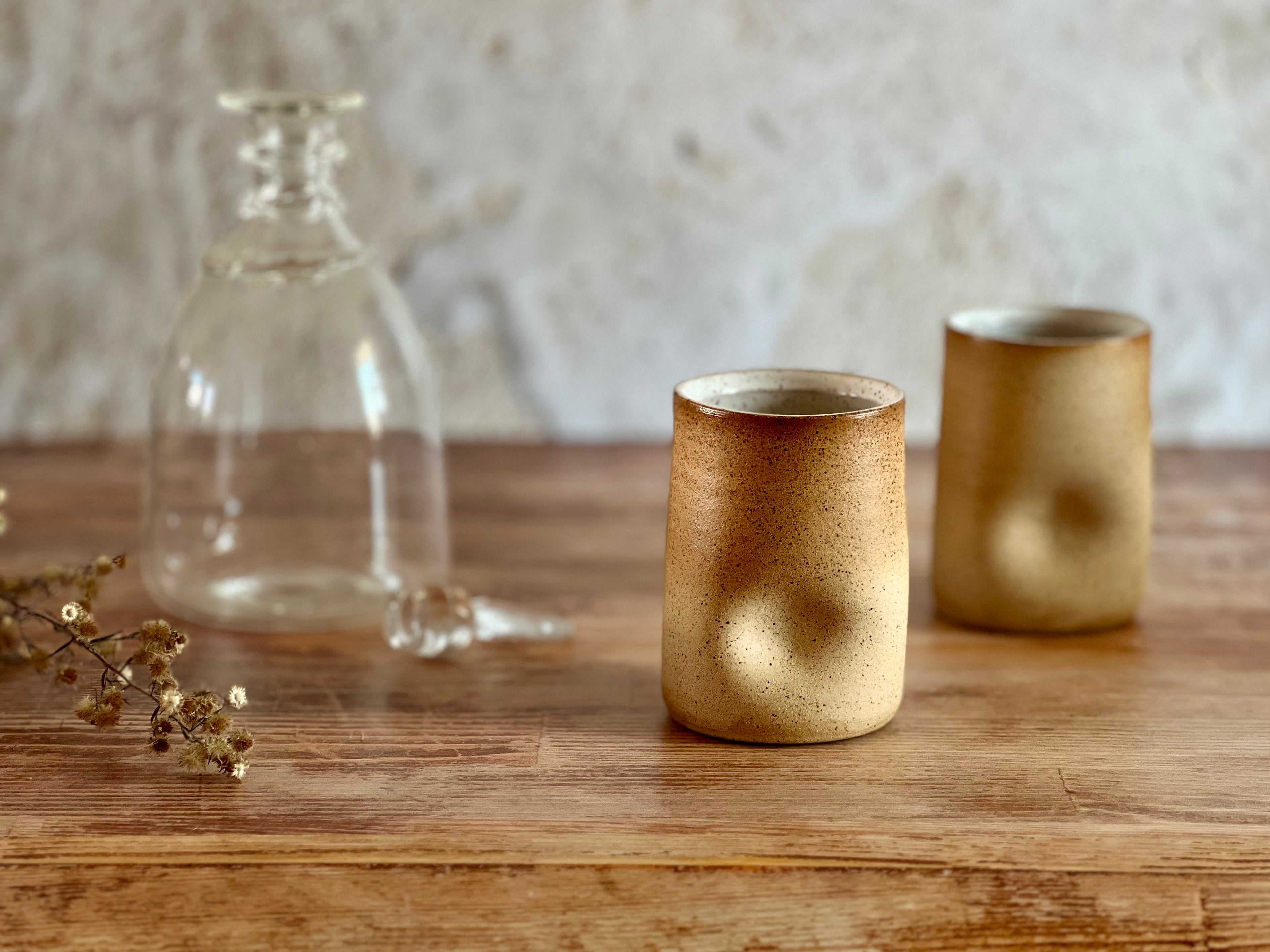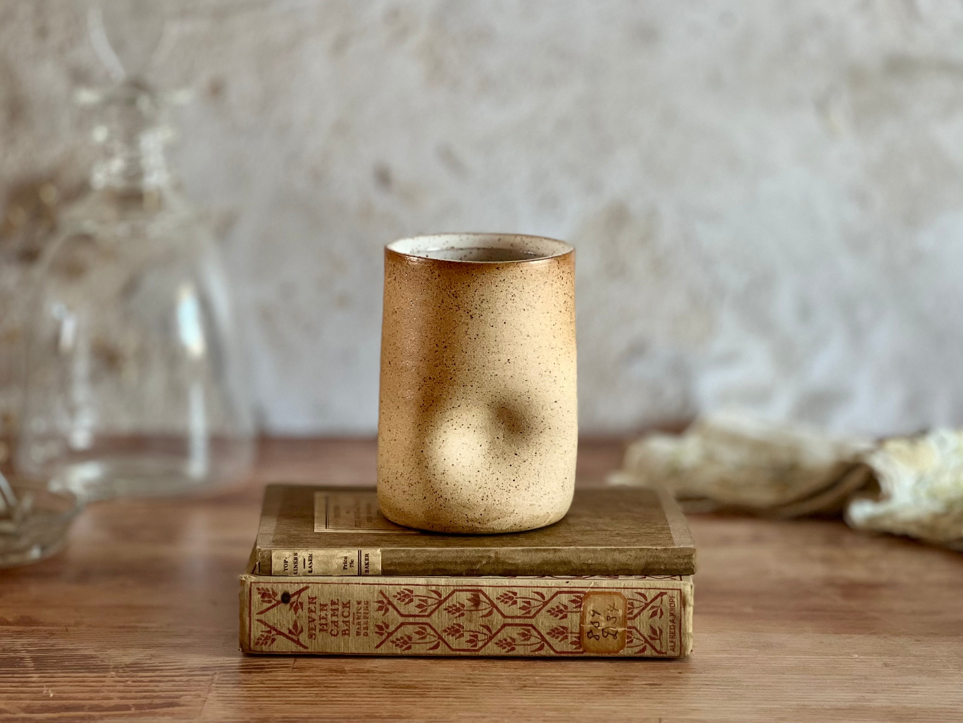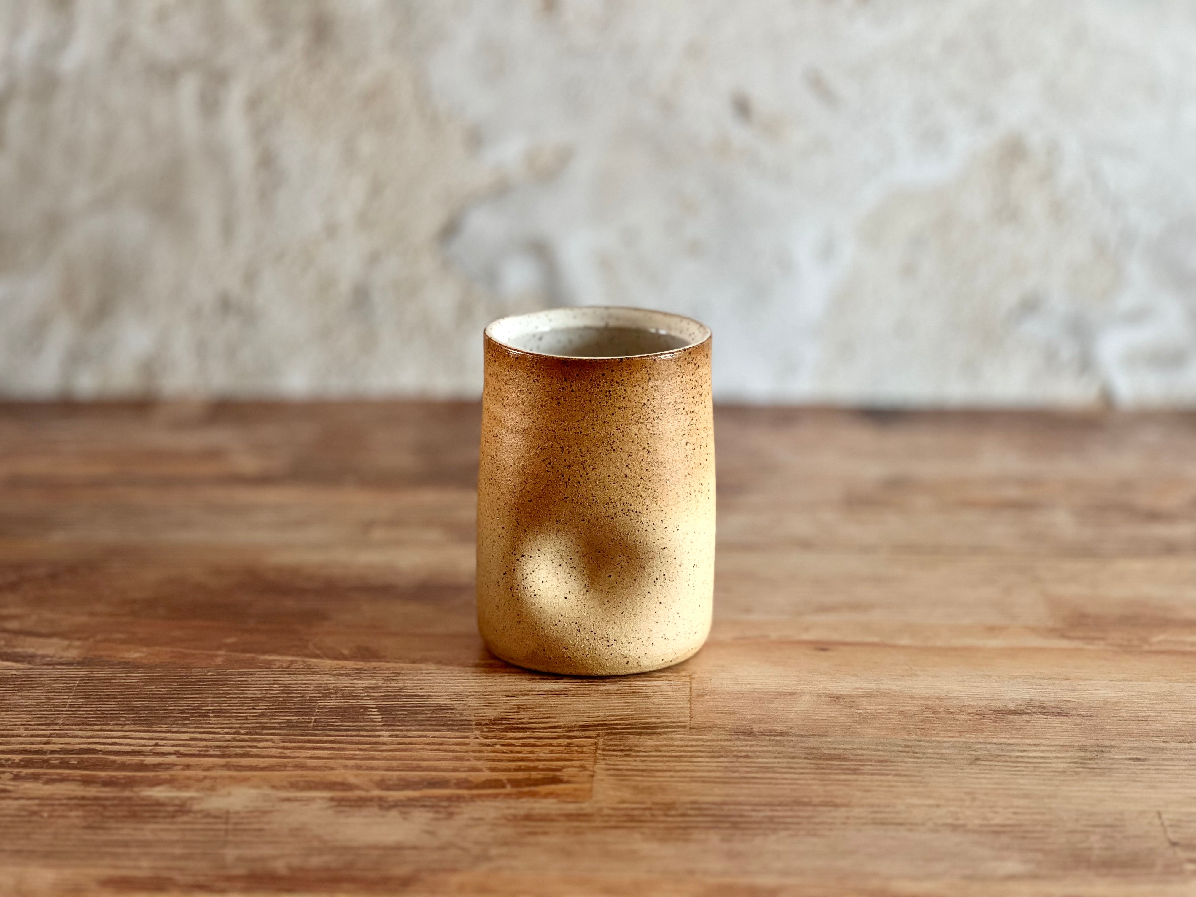 Crafted from warm, toasty stoneware, this larger thumb cup offers the same familiar comfort in a more generous size. The raw, unglazed exterior invites you to experience the natural texture of the clay, while a smooth white glaze inside ensures a functional, food-safe finish. Simple, tactile, and timeless—no two are ever alike.