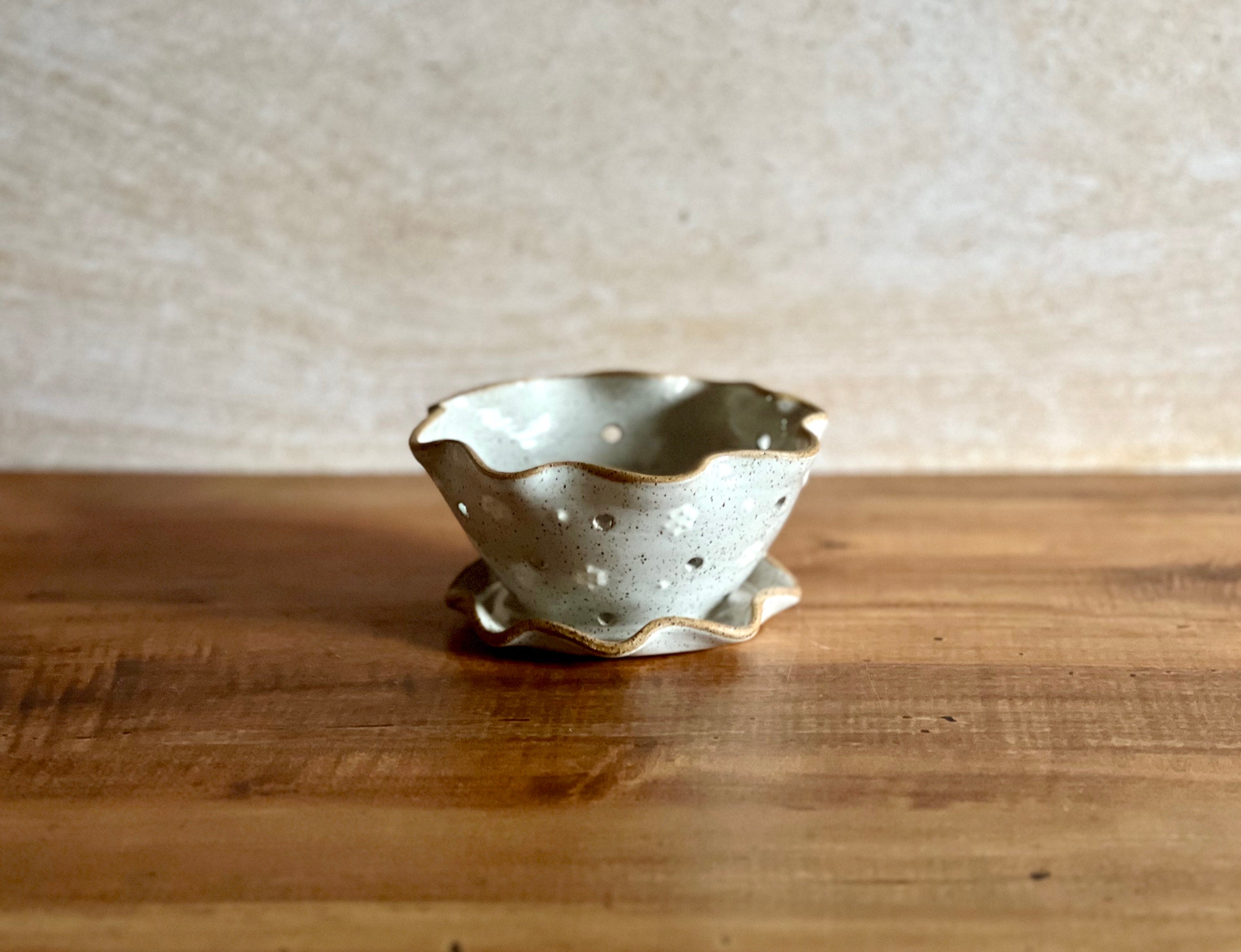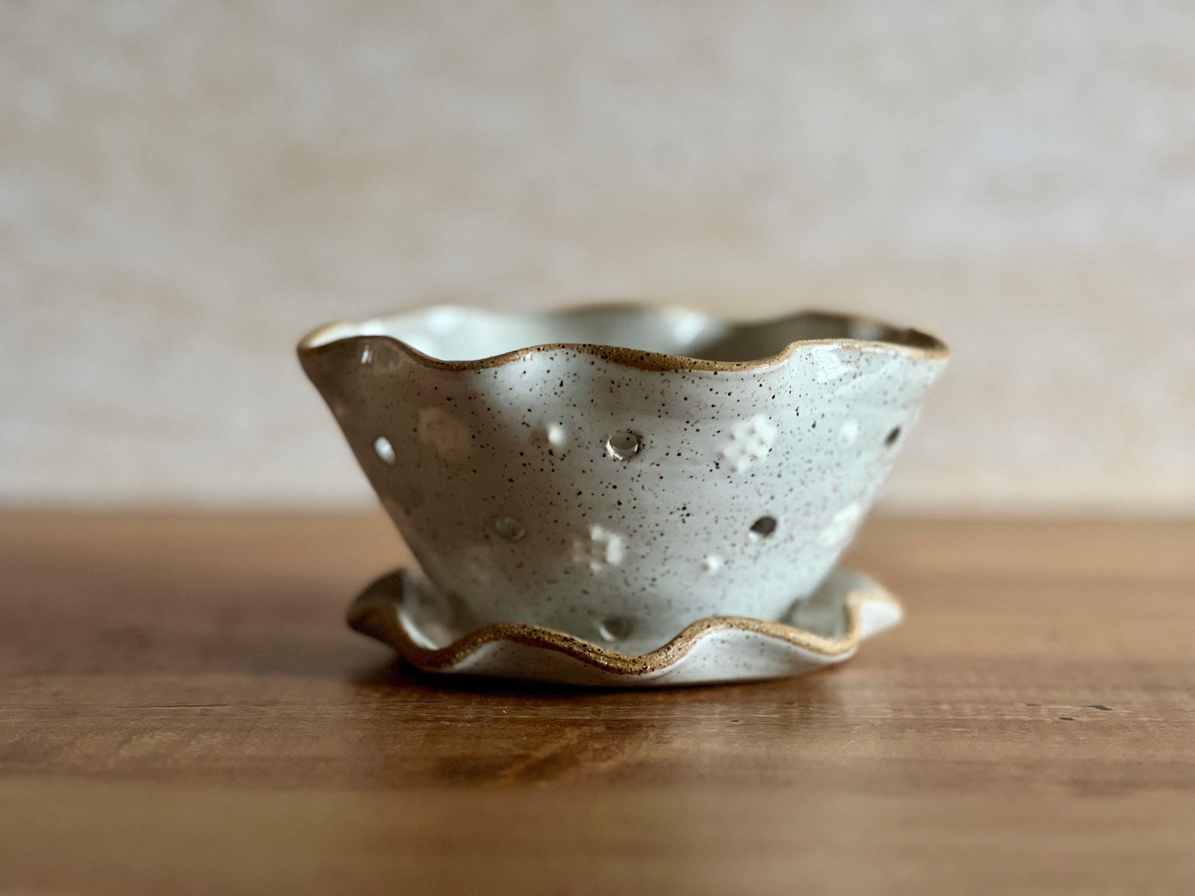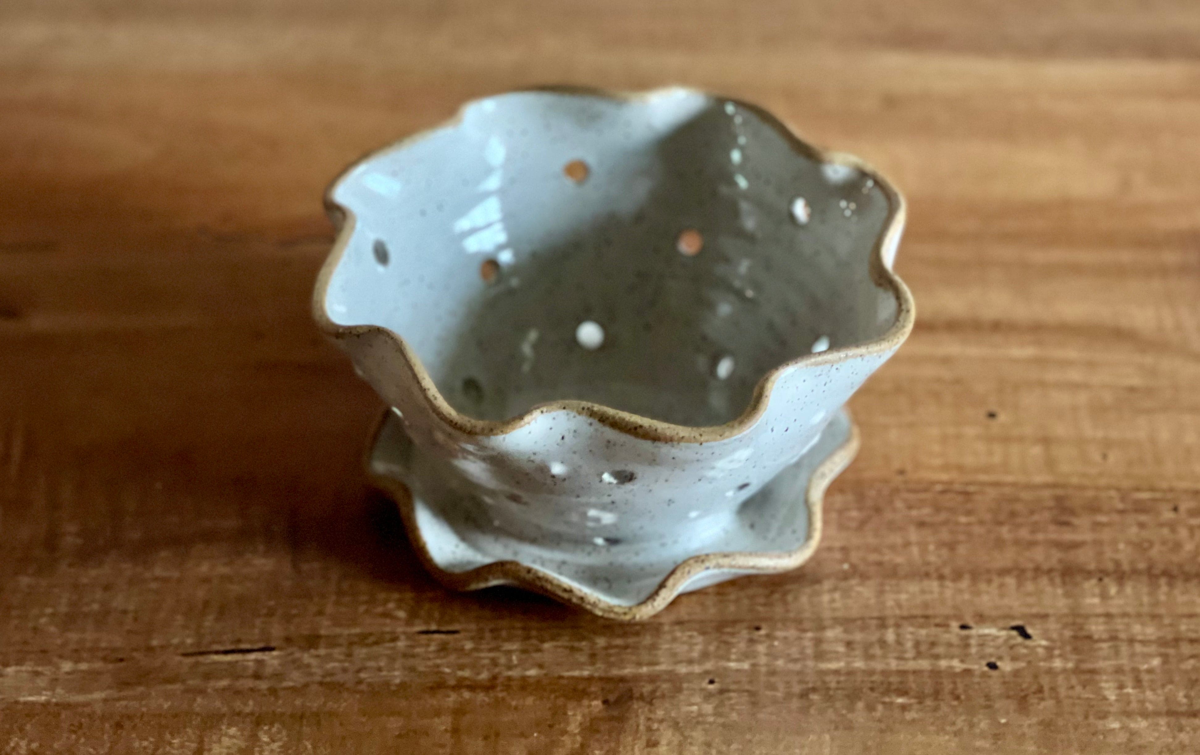 Stoneware Berry Bowl with integrated drainage tray. Ruffled rims and floating flowers give this kitchen helper a stylistic boost. Also makes a great display bowl for fruits and veg! Holds roughly 1lb of fruit.