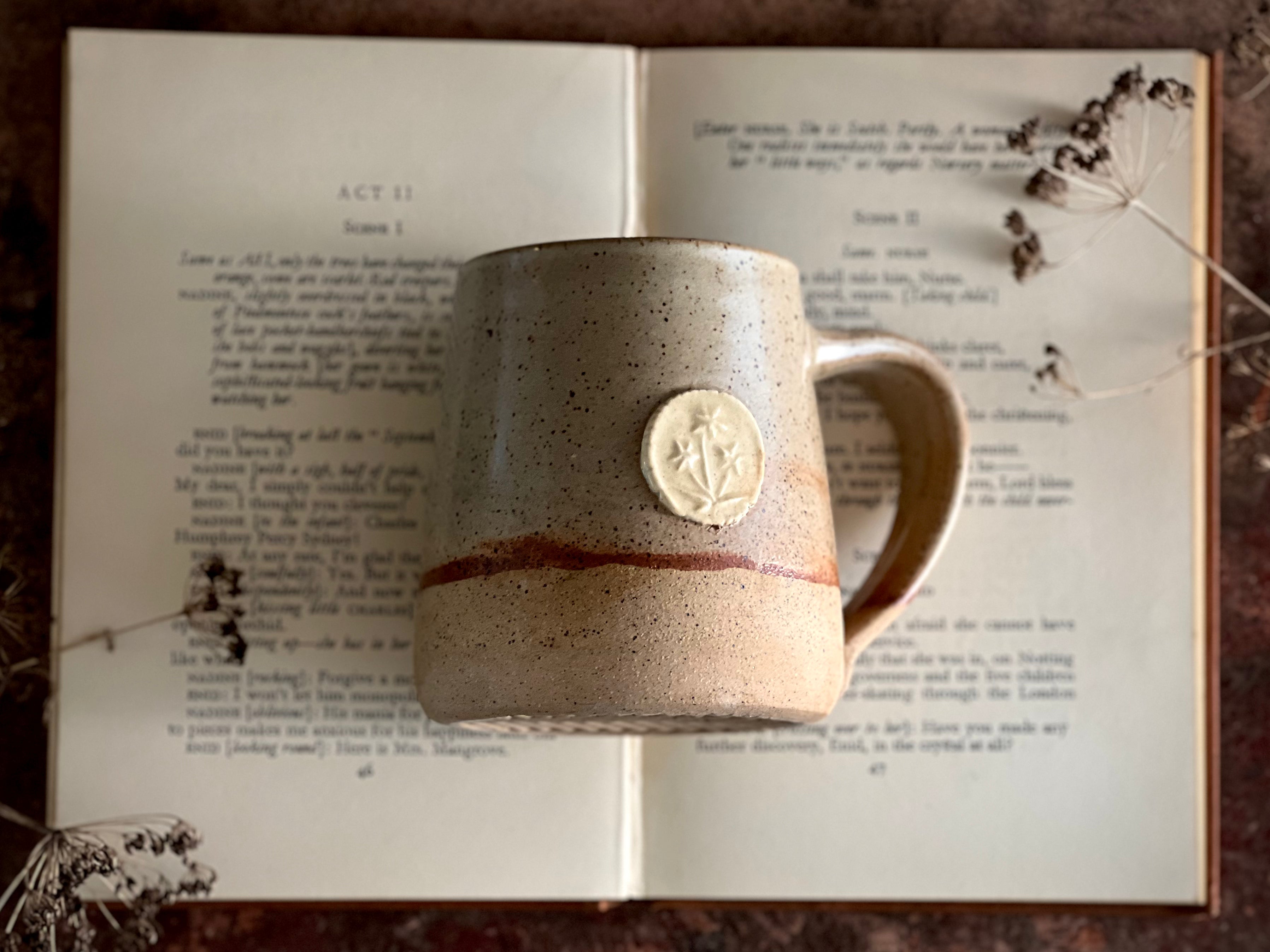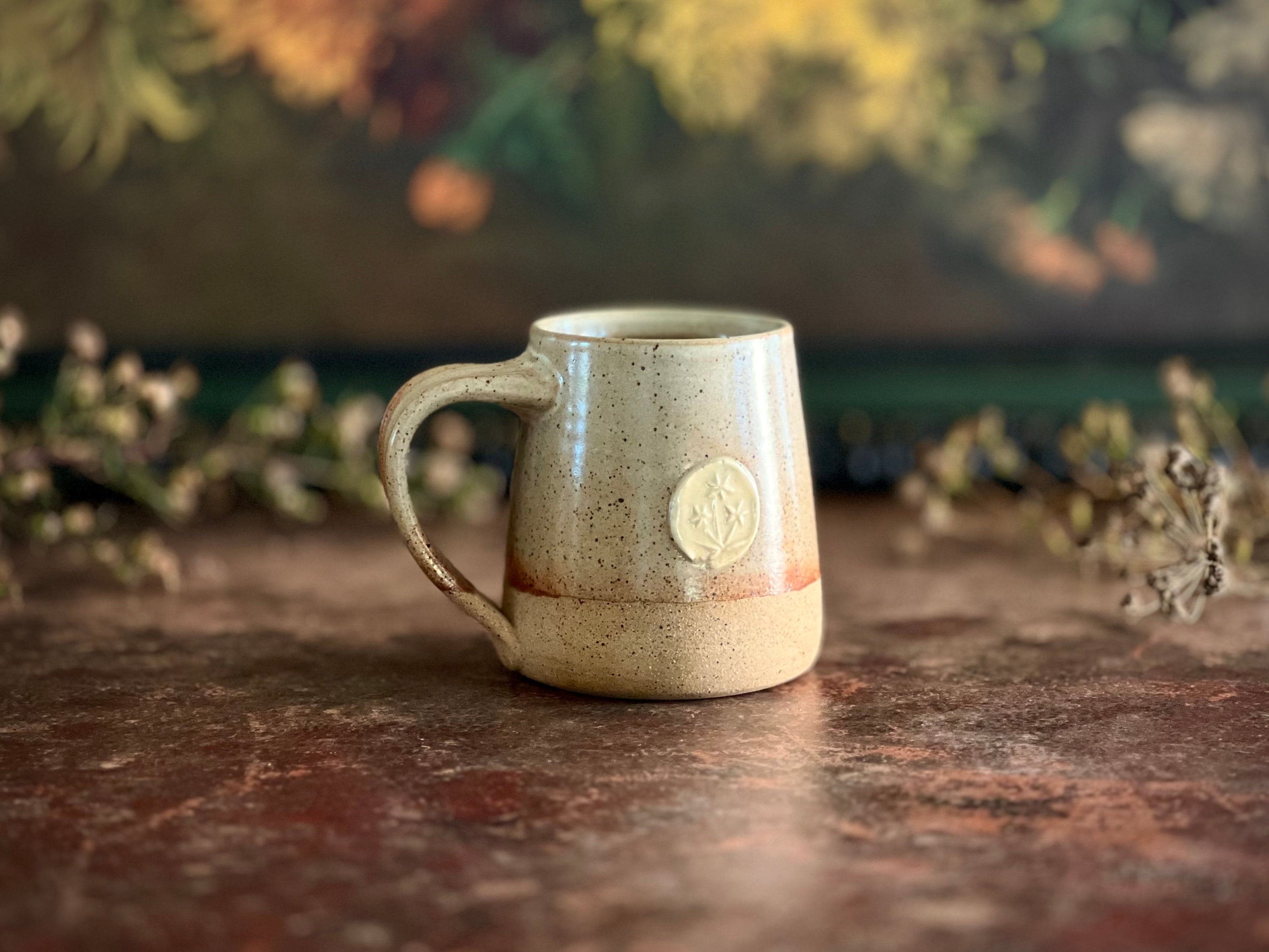 A memento of summer, sealed in clay and impressed with a tiny imagined, ephemeral blossom. This mug is a reminder of hope and growth that will stay with you all year.