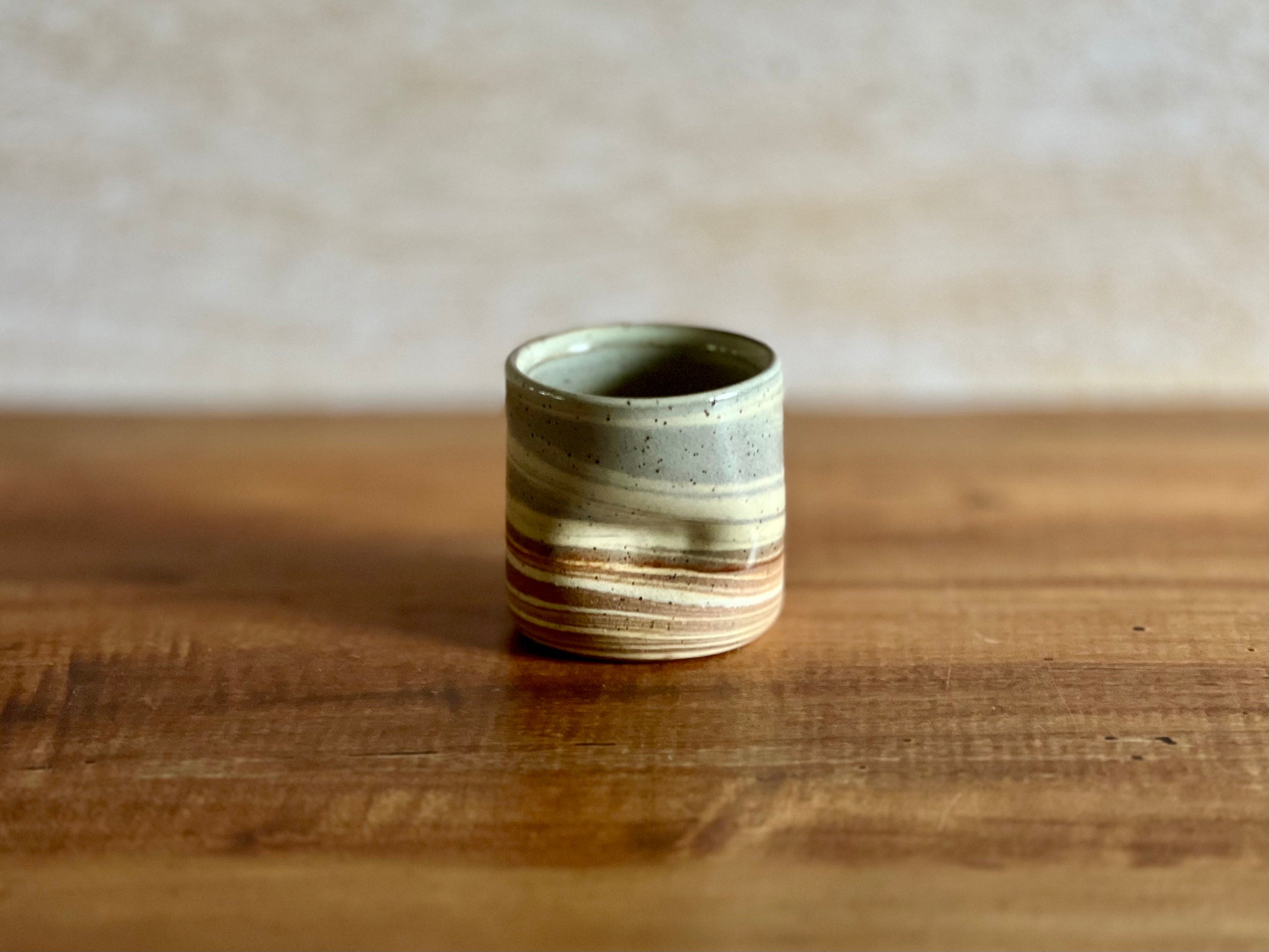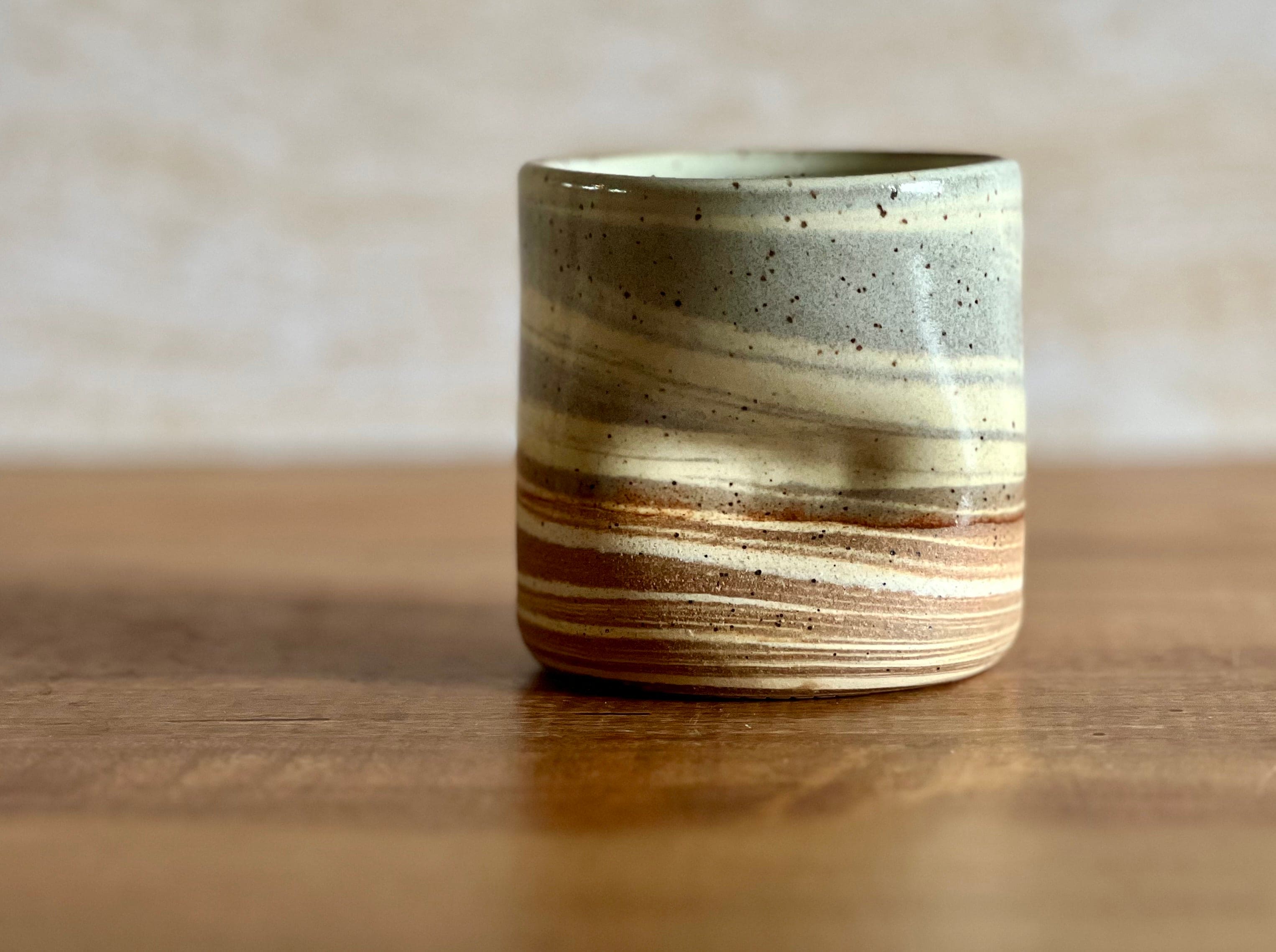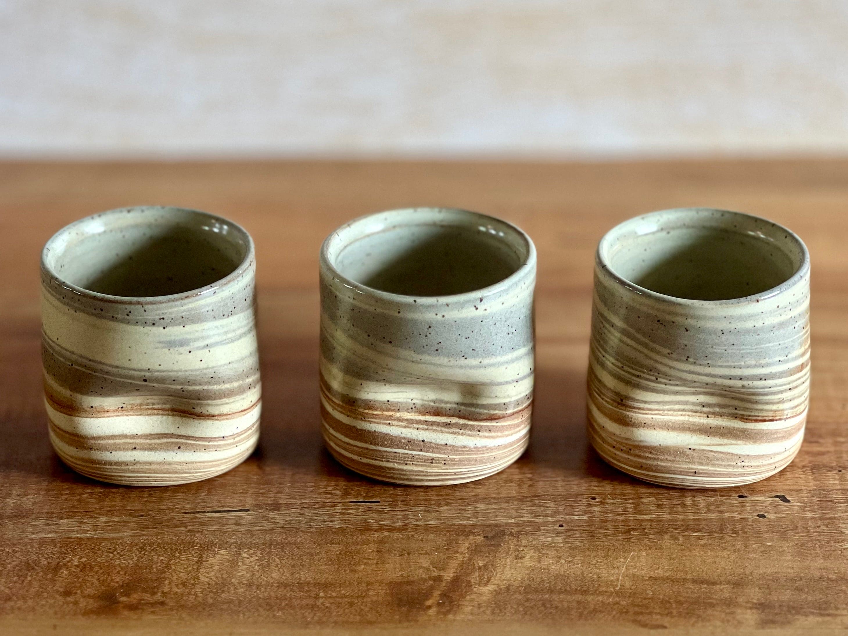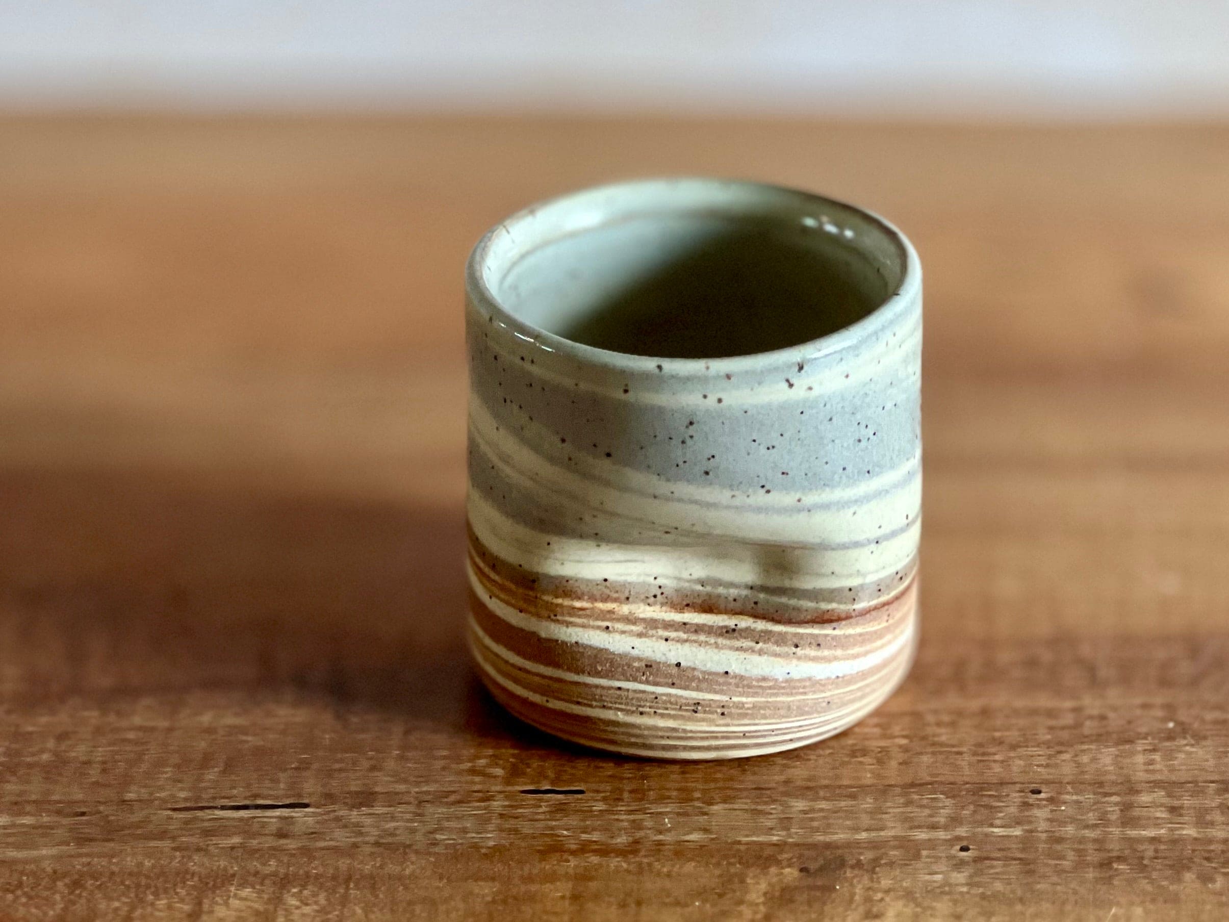 Warm red and white clay swirl together in a marbled pattern that is unique to each cup. Just as the patterns found in wood grain, stone, and human fingerprints are never repeated, no two of these cups are alike.