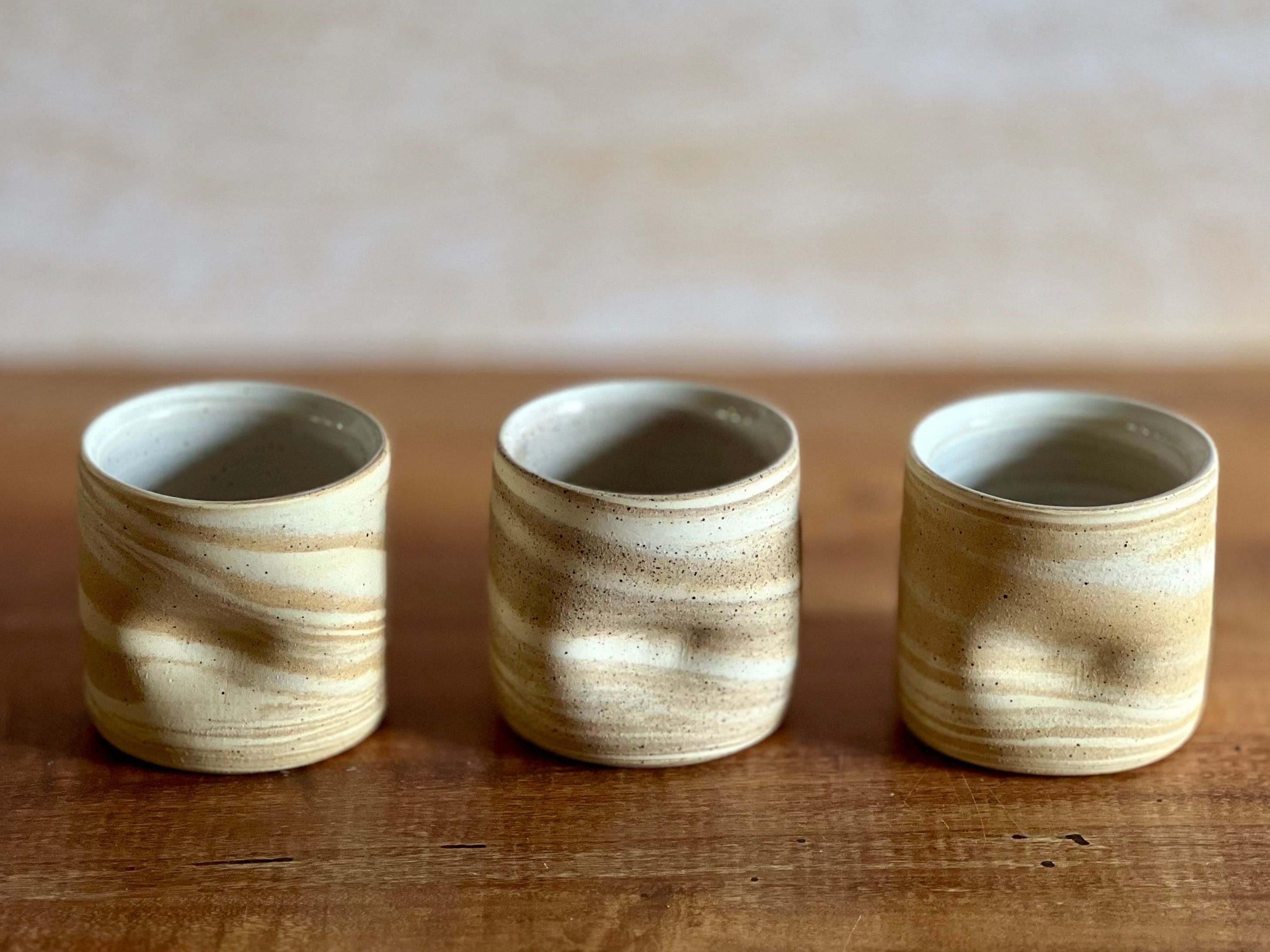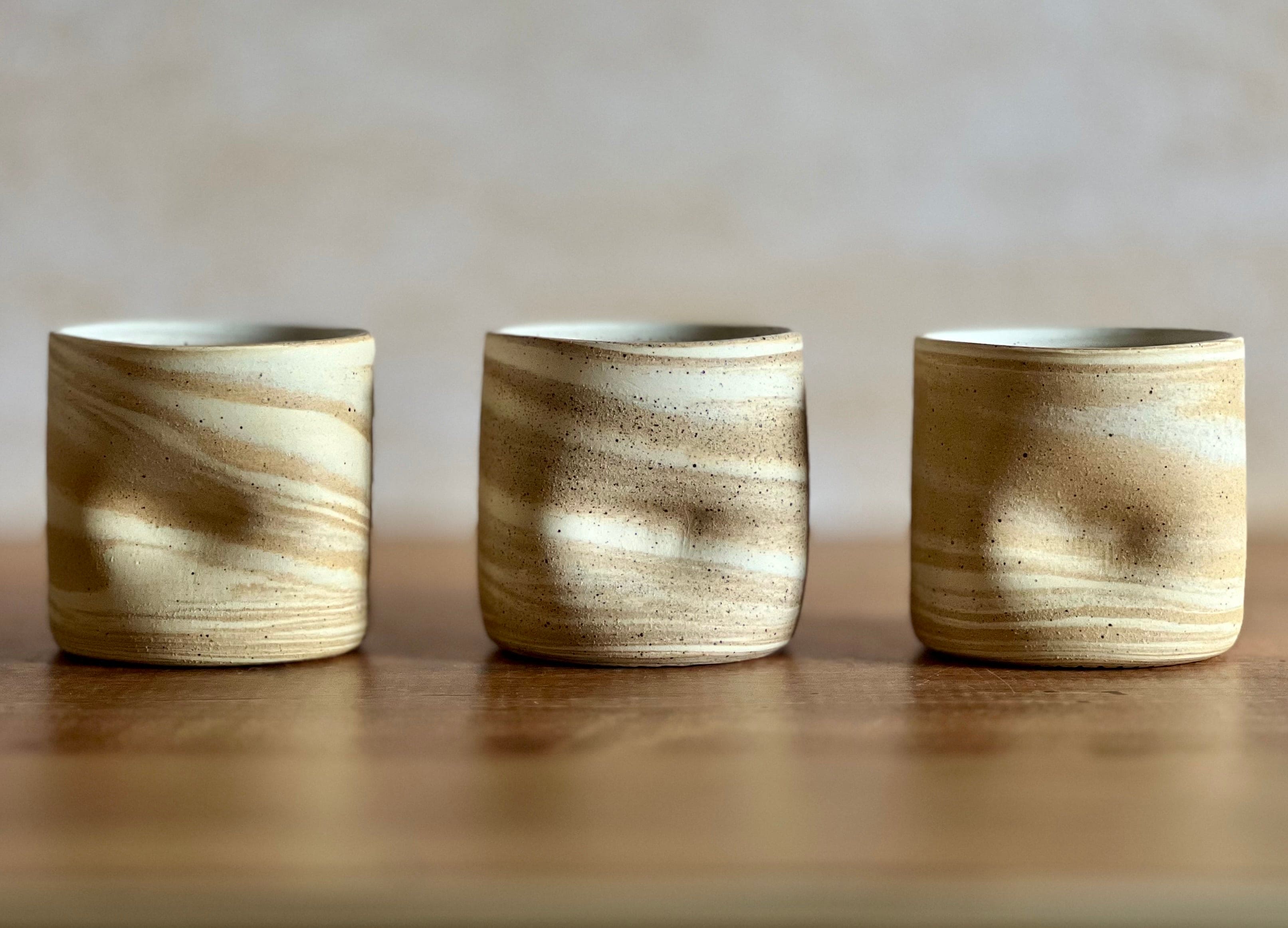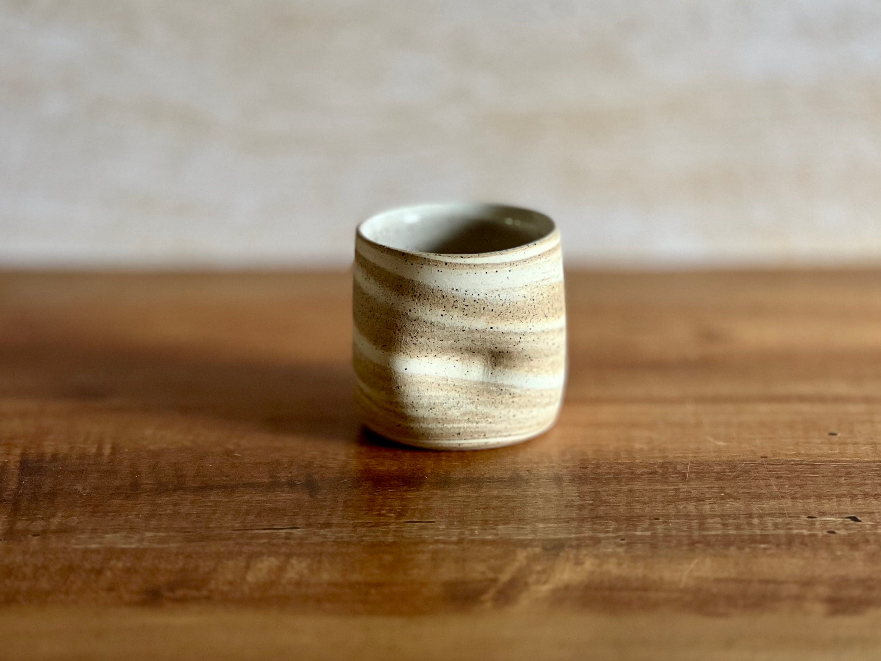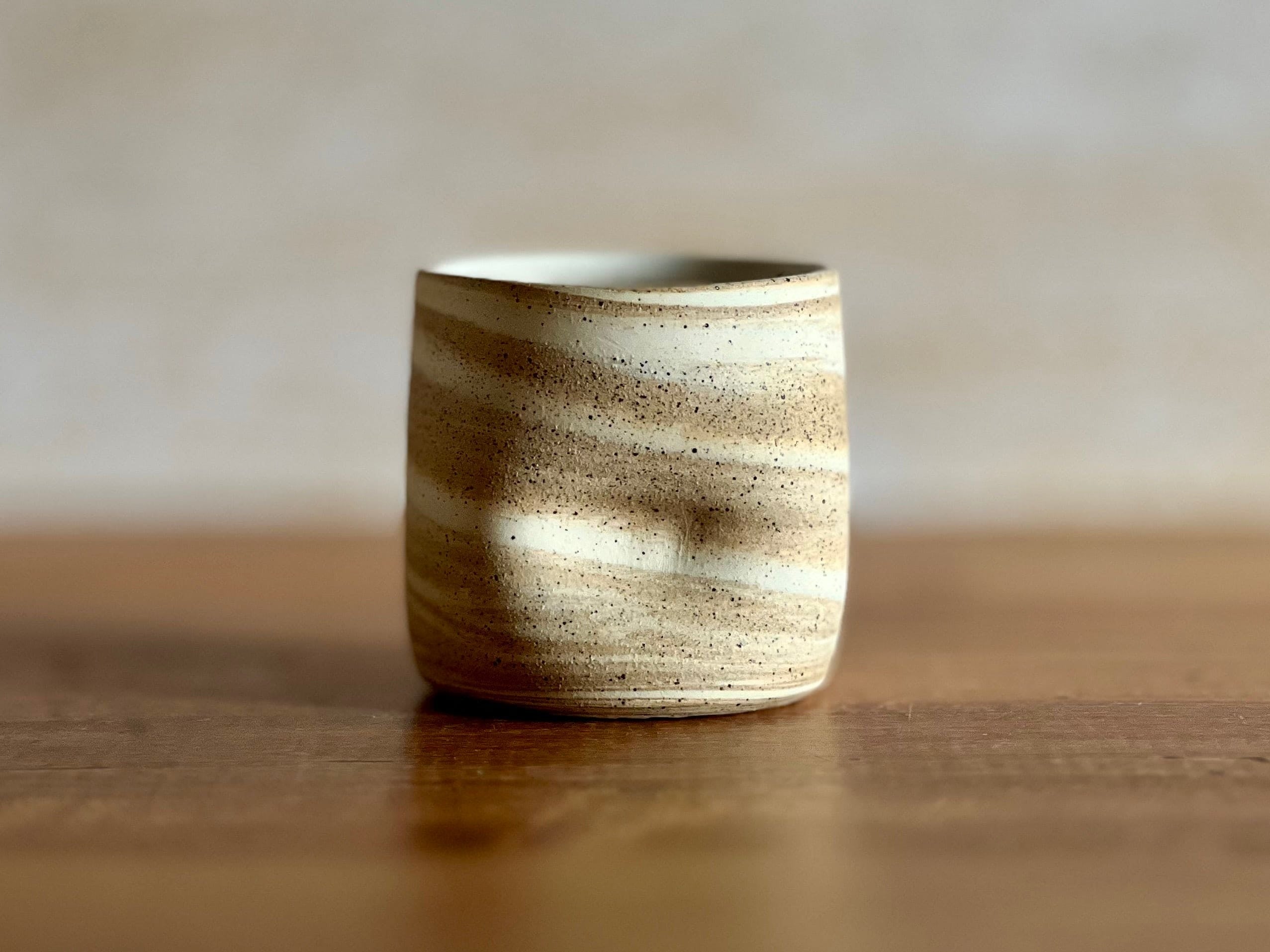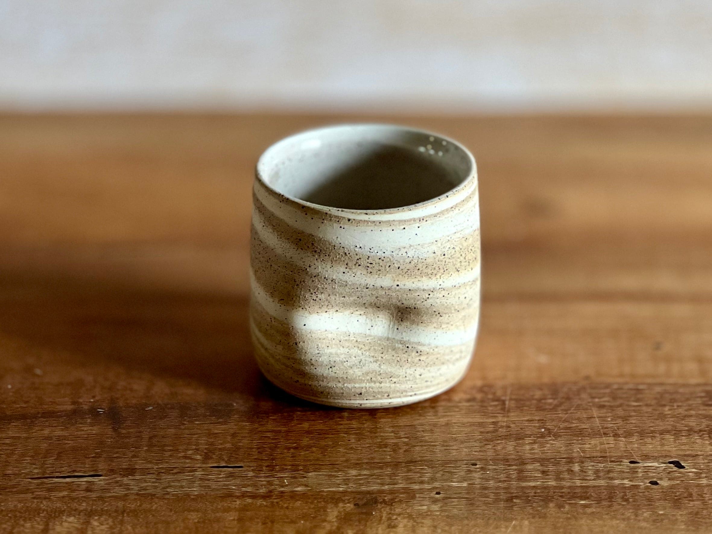 Warm beige and white clay swirl together in a marbled pattern that is unique to each cup. Just as the patterns found in wood grain, stone, and human fingerprints are never repeated, no two of these cups are alike.