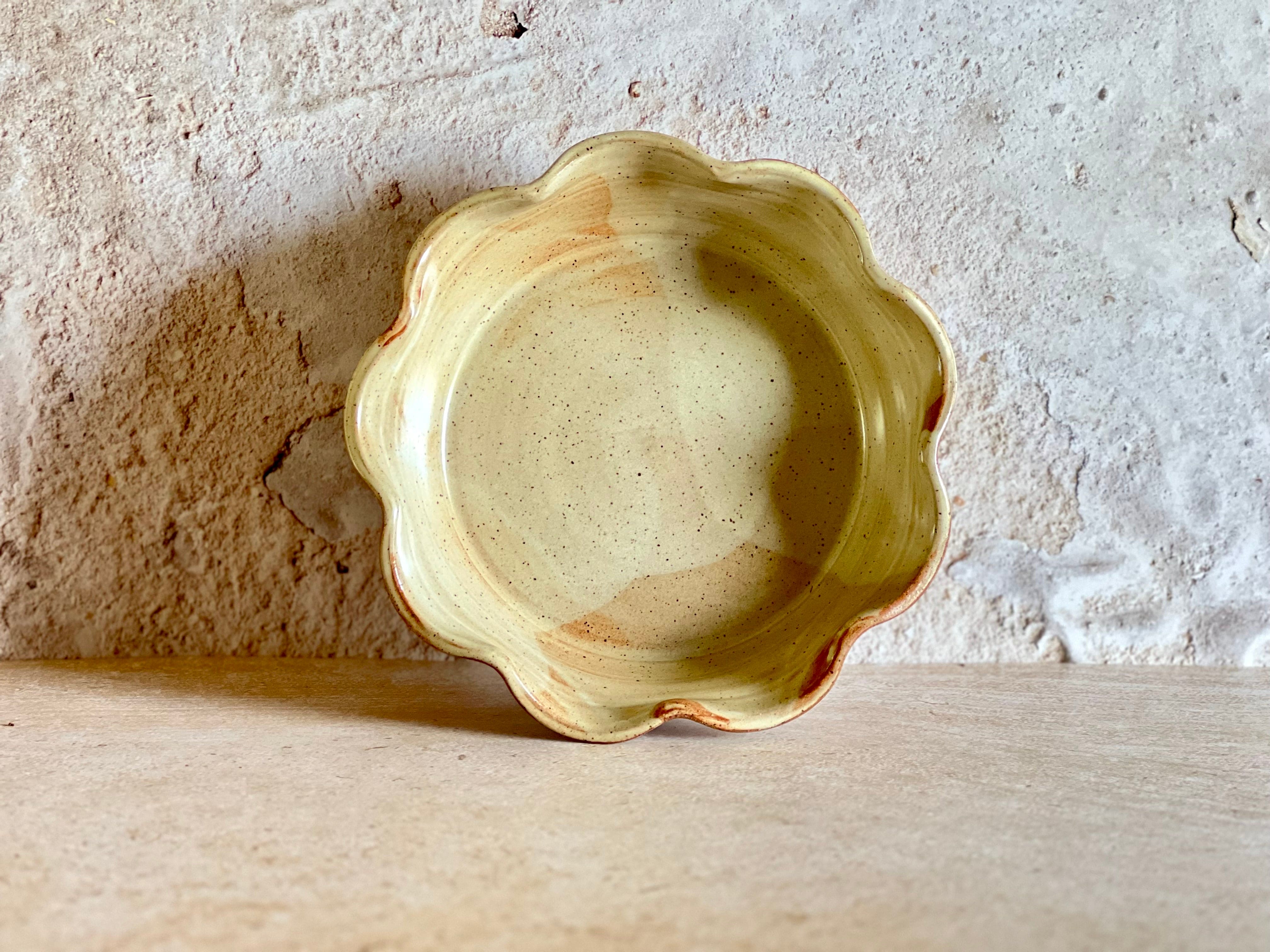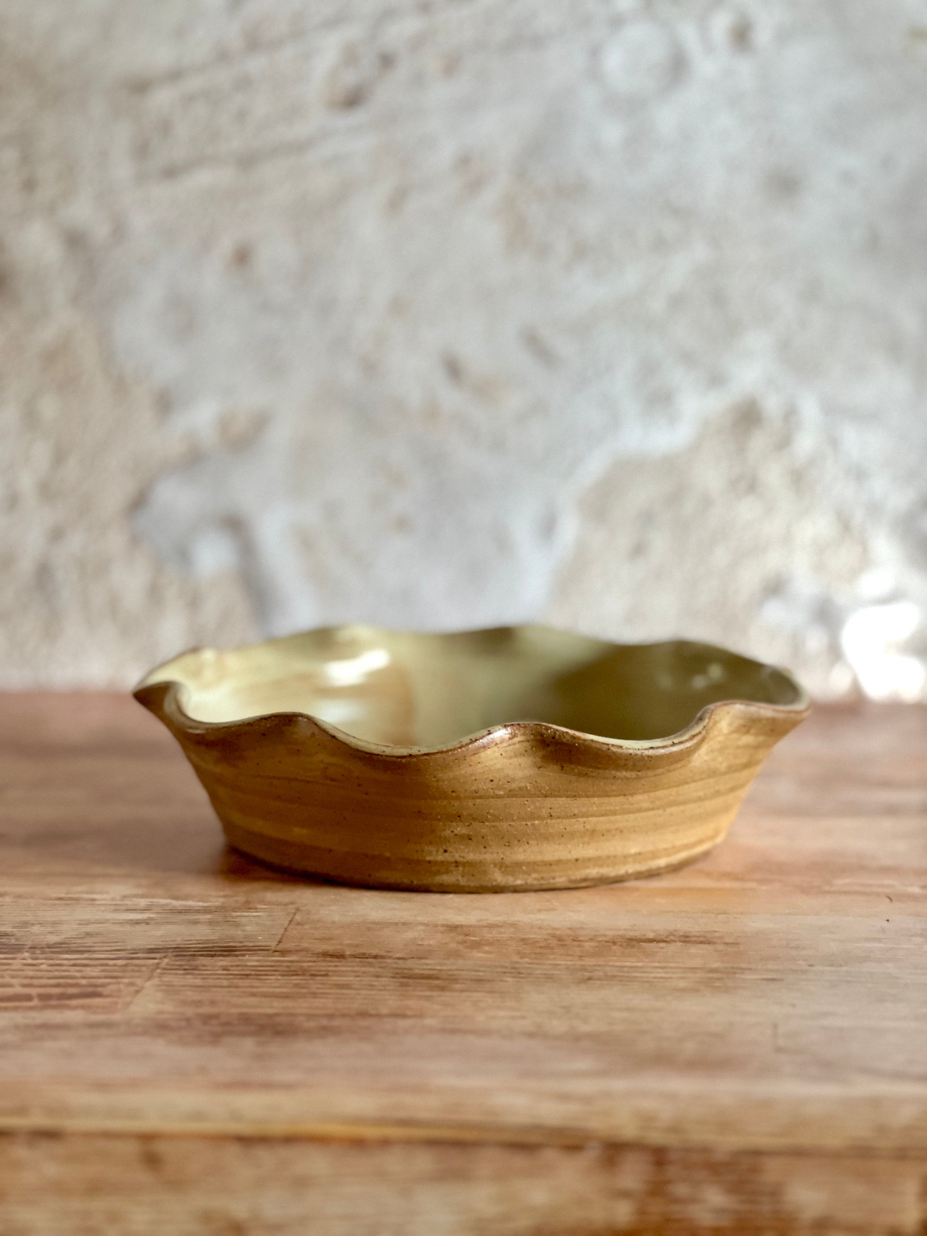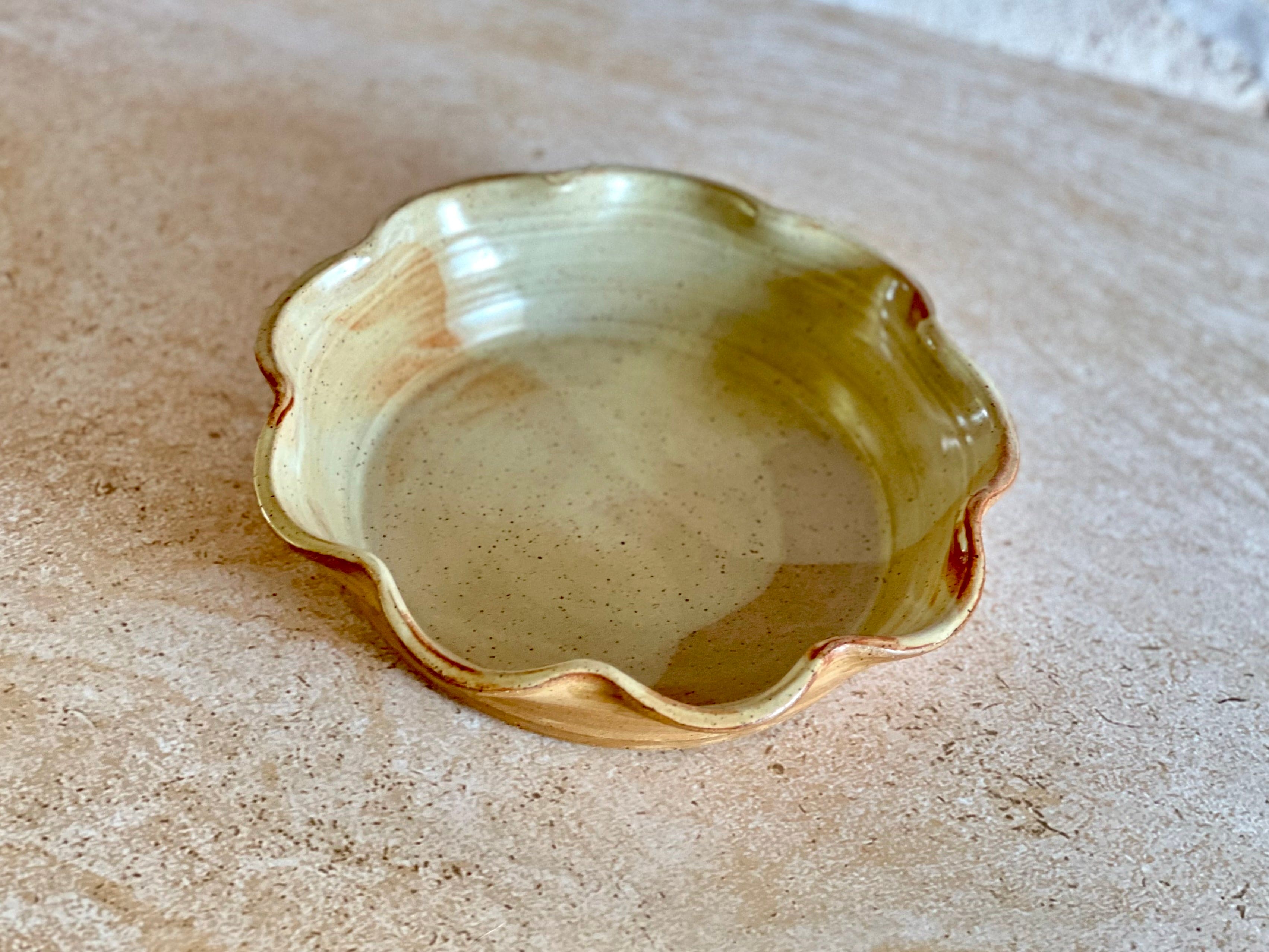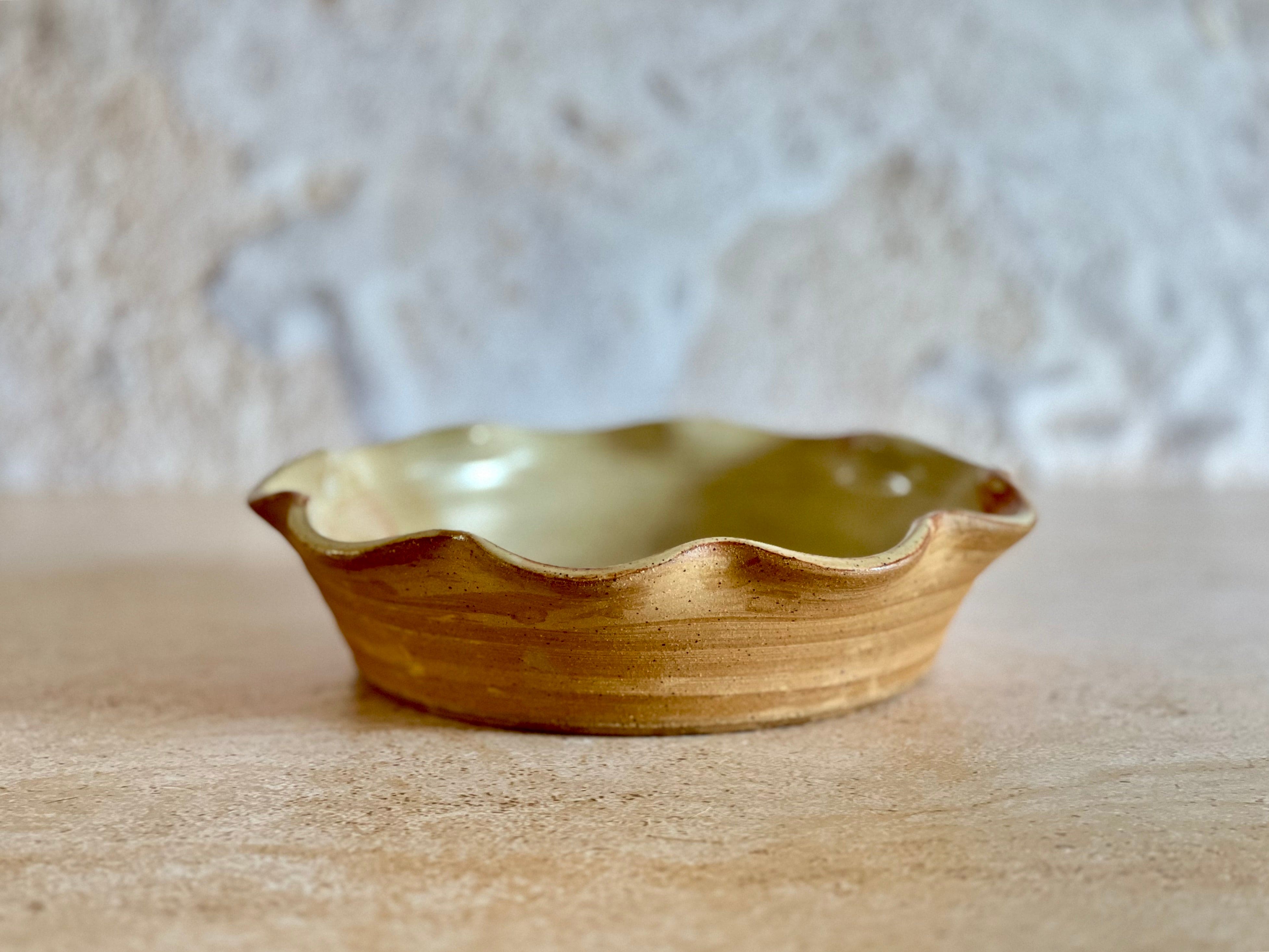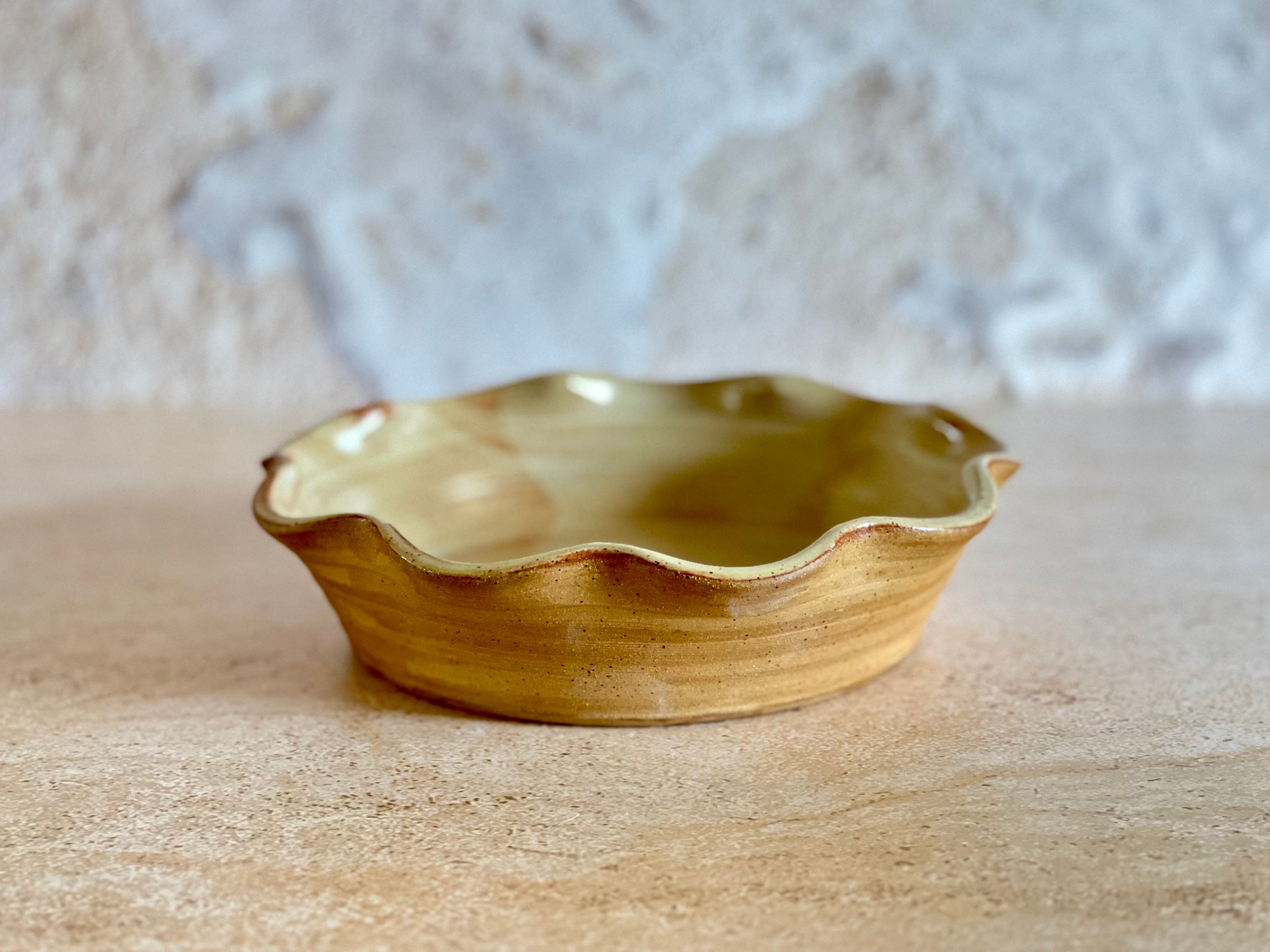 Each of these pie plates is one of a kind, with gentle variations in glaze, rim shape, and carved detail. Thrown and finished by hand, they feature delightful textures and soft earth-toned glazes that feel right at home in a working kitchen.