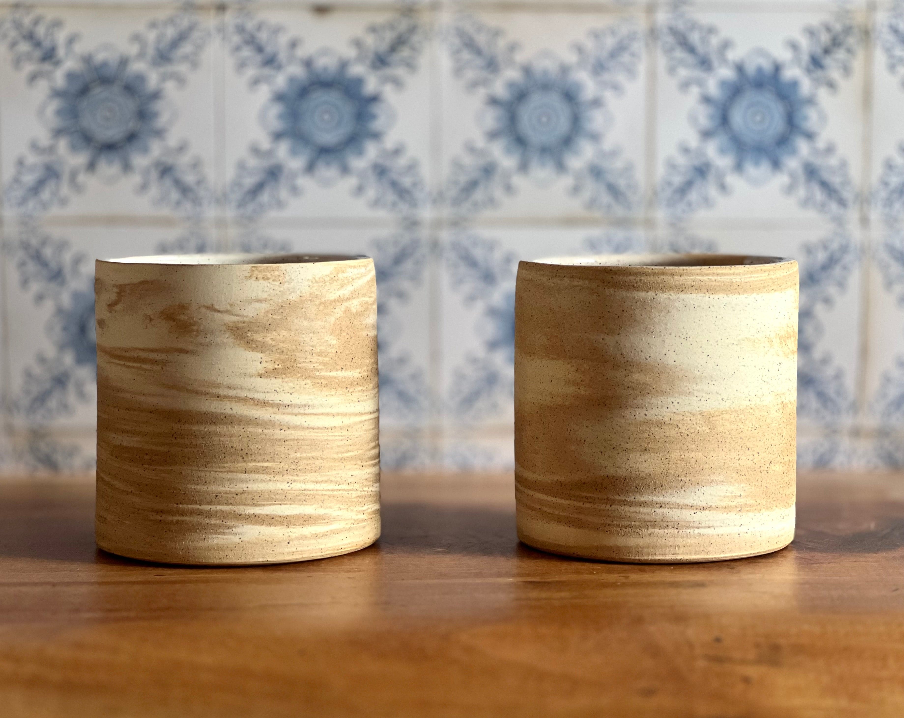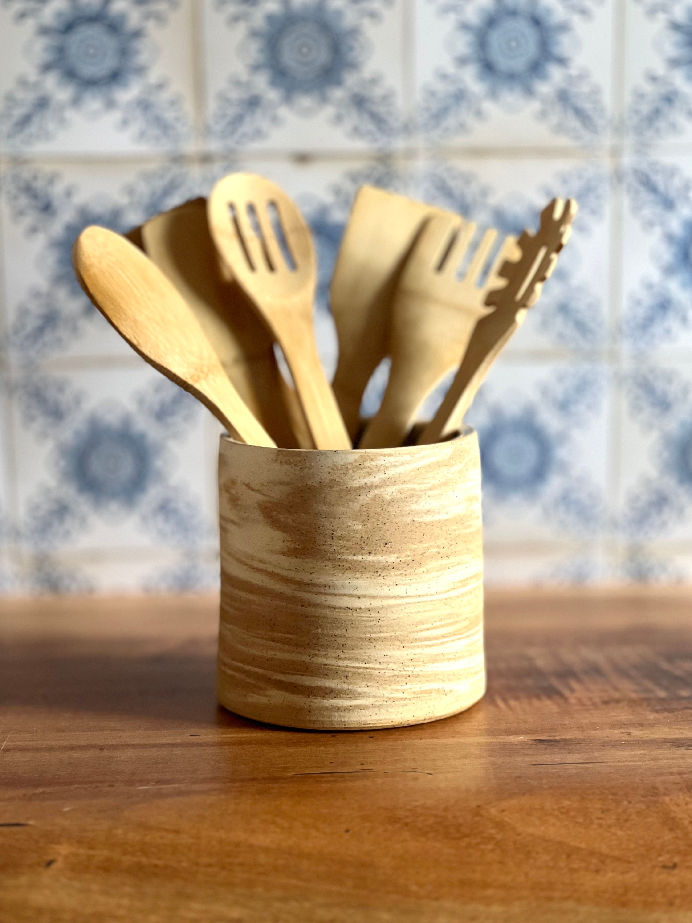 Layers of clay swirl together in a marbled pattern, making each of these wheel-thrown vessels entirely one of a kind. Perfect for wrangling spoons, spatulas, or anything else that needs a home on your countertop.