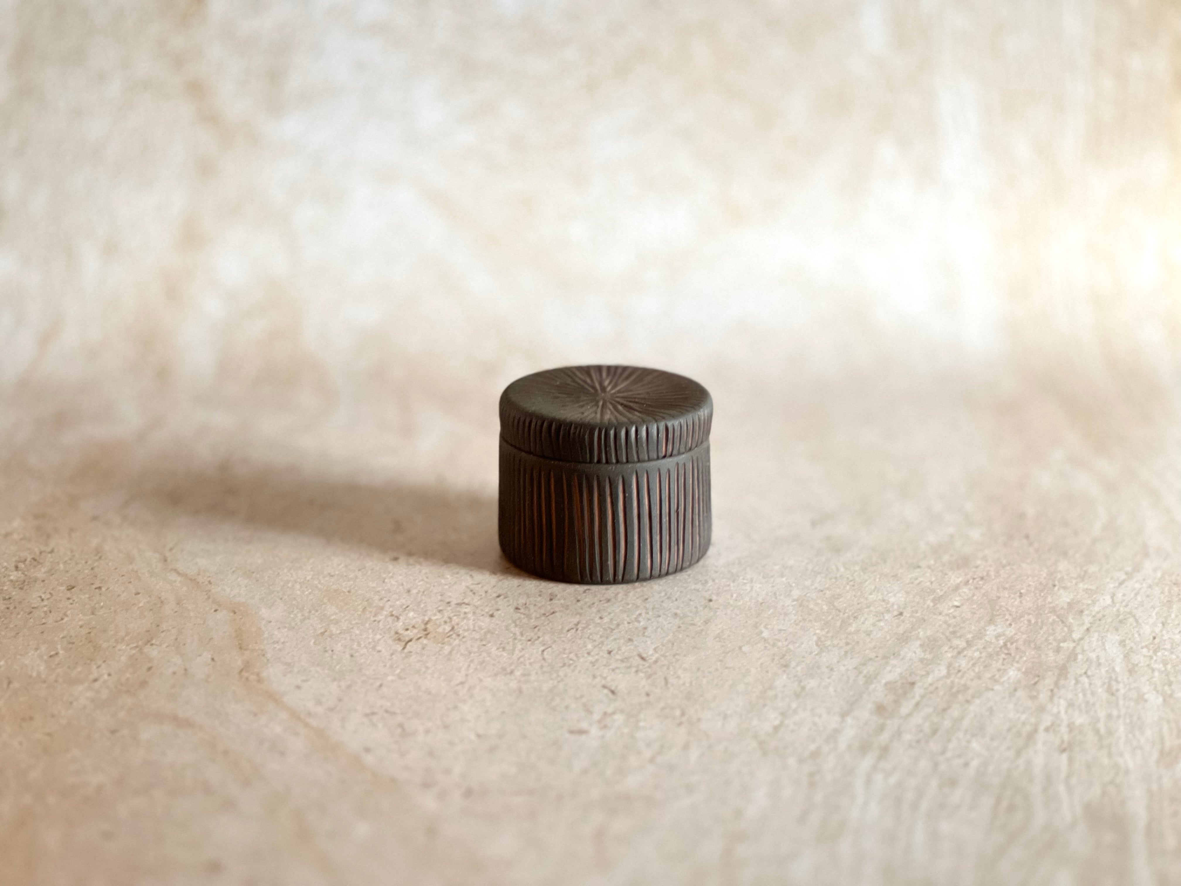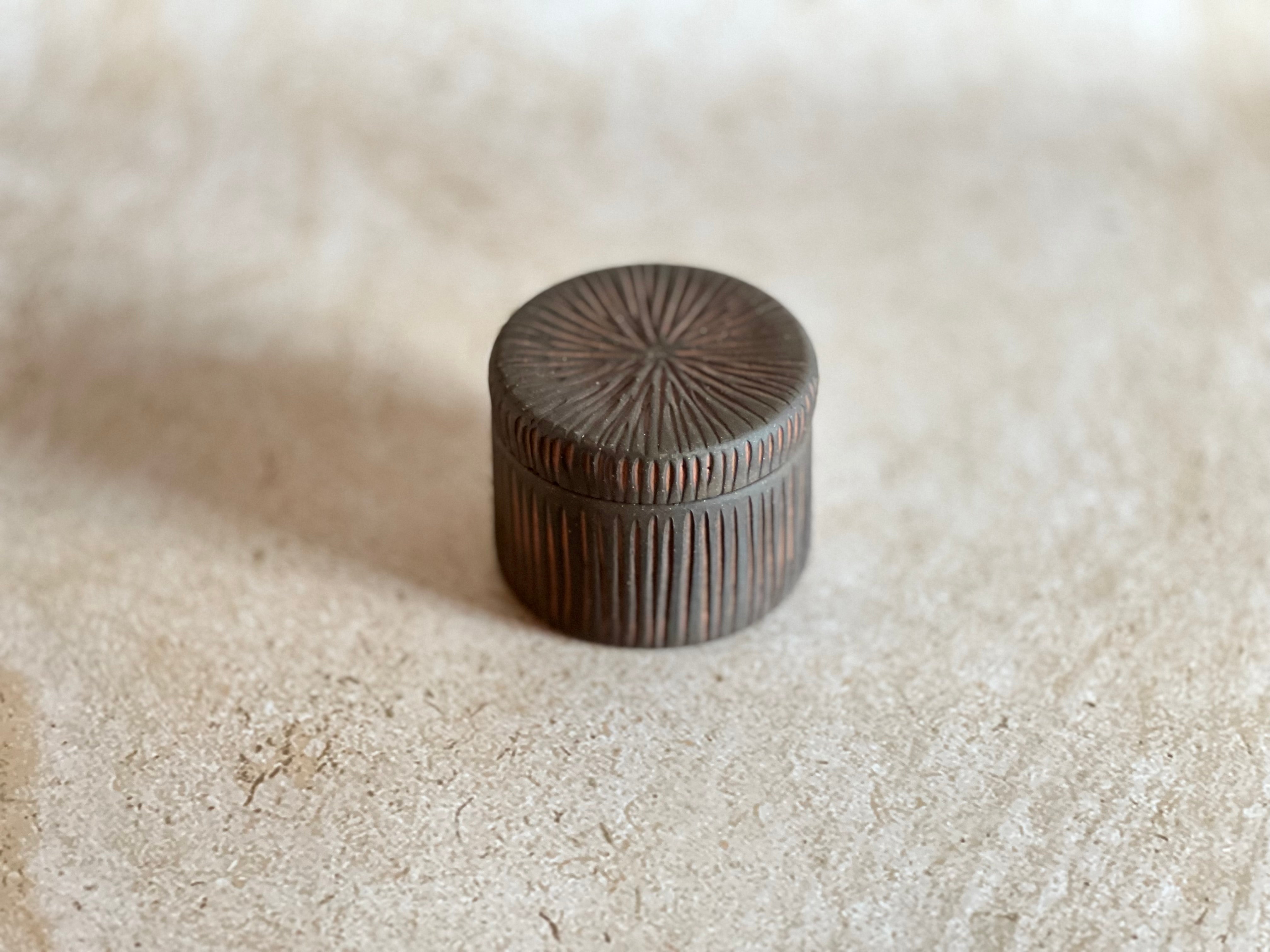 Wheel thrown stoneware. Hand carved inlays of nutty brown stripes alternate over warm raw clay. Matte brown glaze on the inside and mostly raw on the exterior to let the beauty of the clay take center stage.