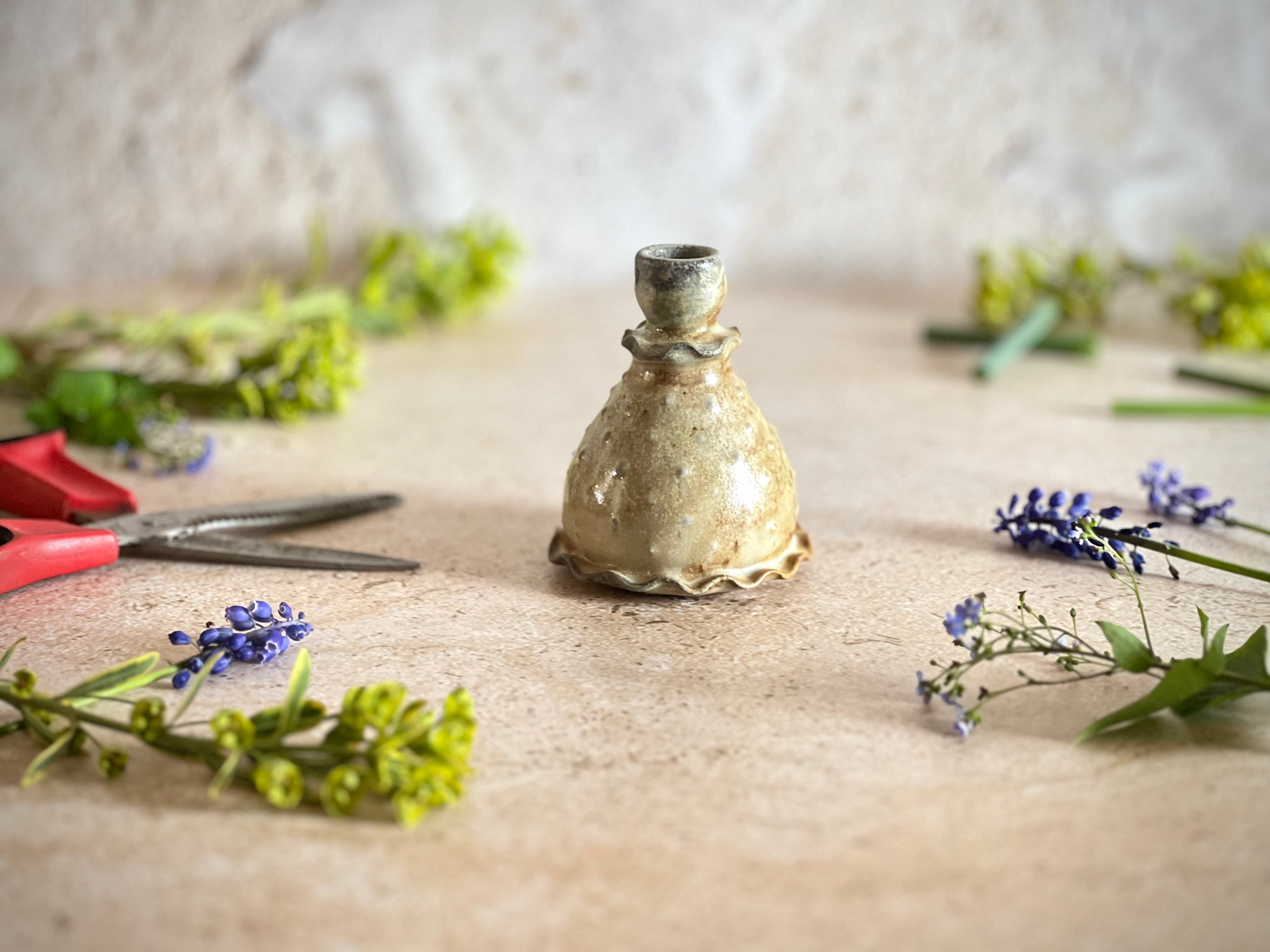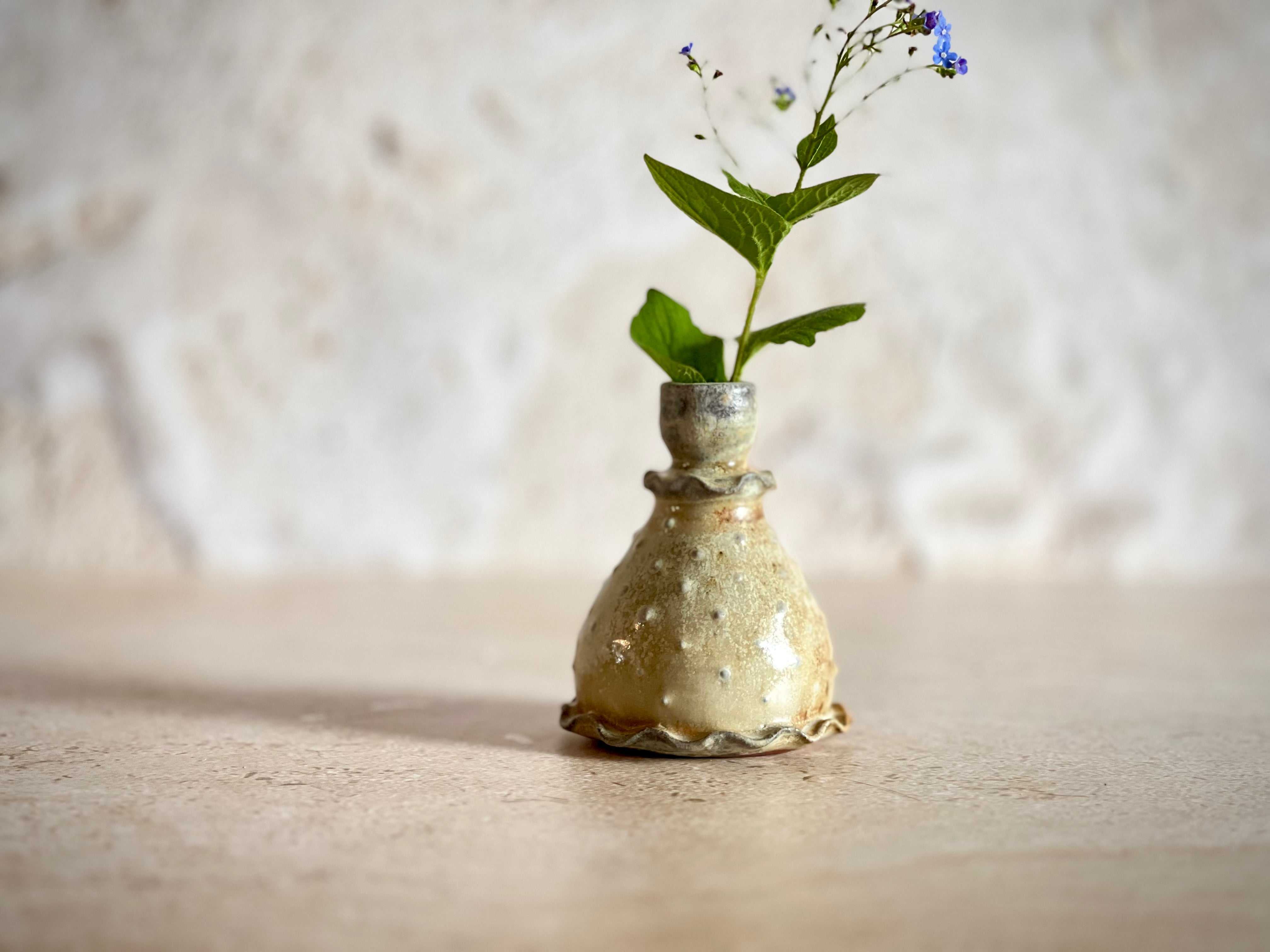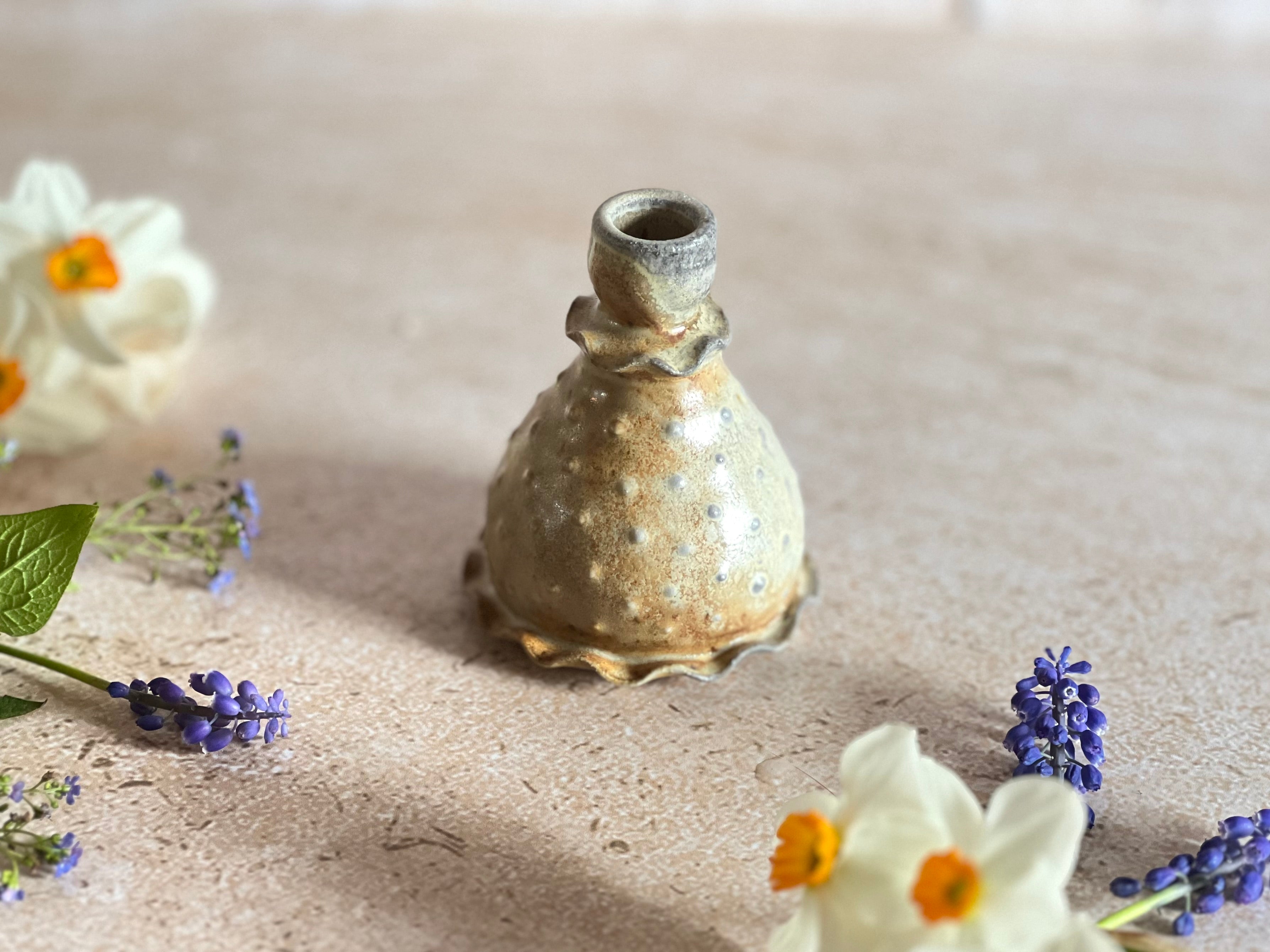 Each of these petite bud vases is one of a kind - formed on the wheel with a playful, intuitive approach and finished with the magic of the wood-firing process. Their size makes them perfect for holding just a stem or two - an easy way to bring a touch of nature to any corner of your home, from windowsill to nightstand. Earthy, textural, and richly varied, each vase holds both fresh and dried stems and serves just as beautifully on its own.