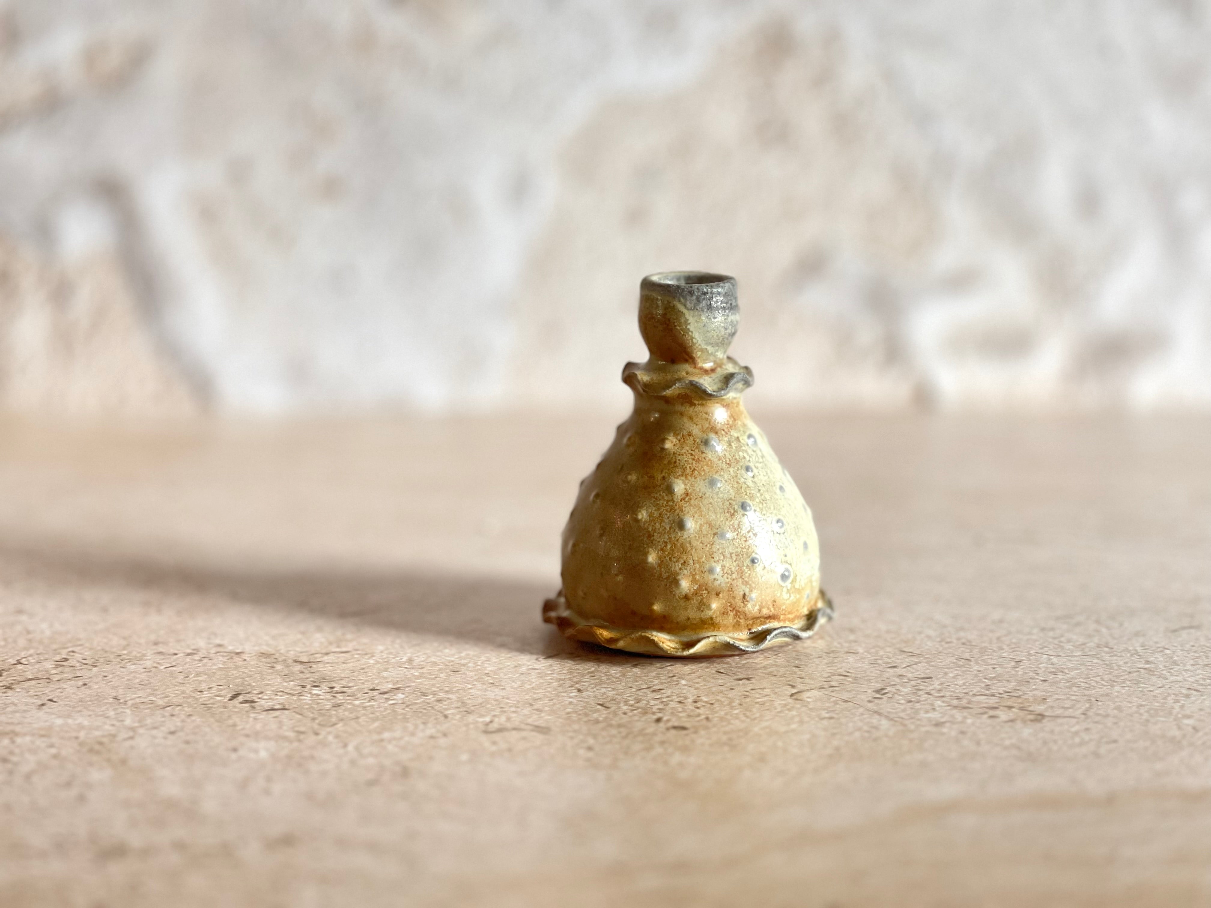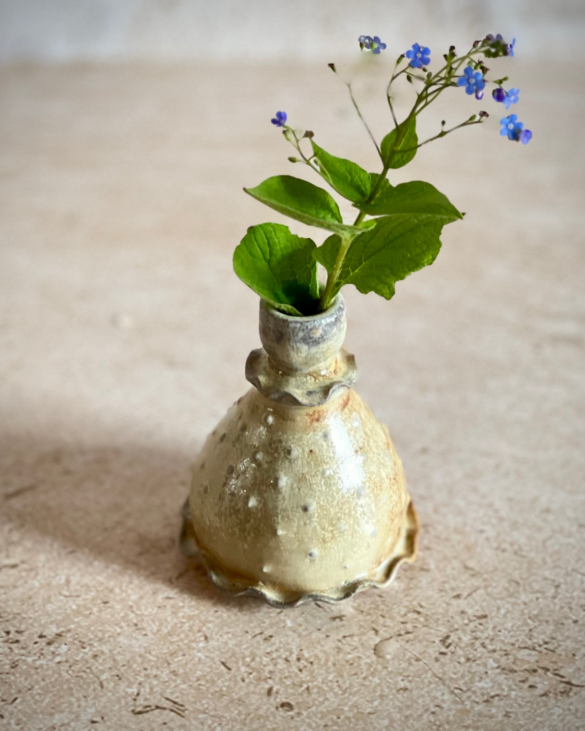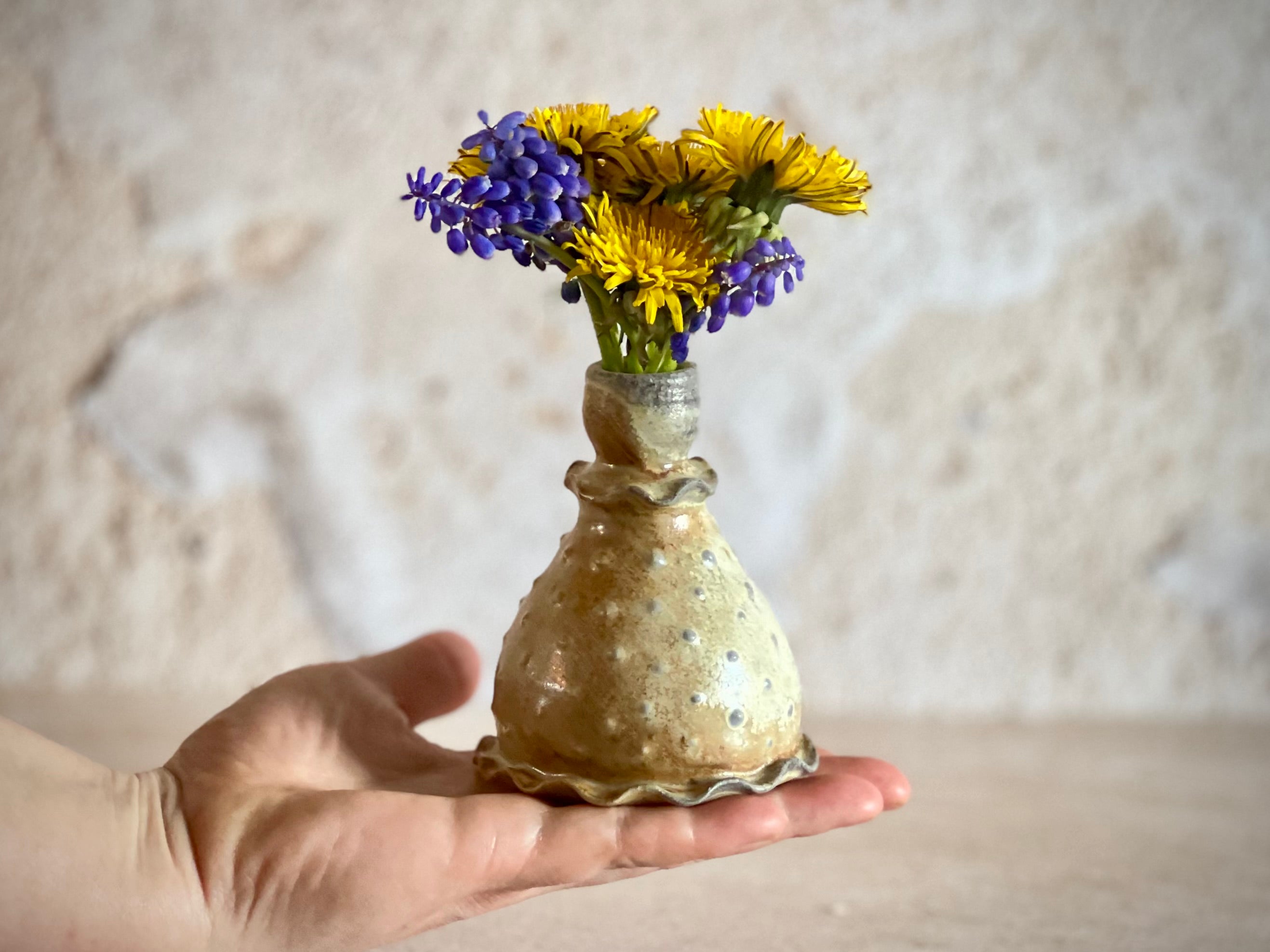 Each of these petite bud vases is one of a kind - formed on the wheel with a playful, intuitive approach and finished with the magic of the wood-firing process. Their size makes them perfect for holding just a stem or two - an easy way to bring a touch of nature to any corner of your home, from windowsill to nightstand. Earthy, textural, and richly varied, each vase holds both fresh and dried stems and serves just as beautifully on its own.