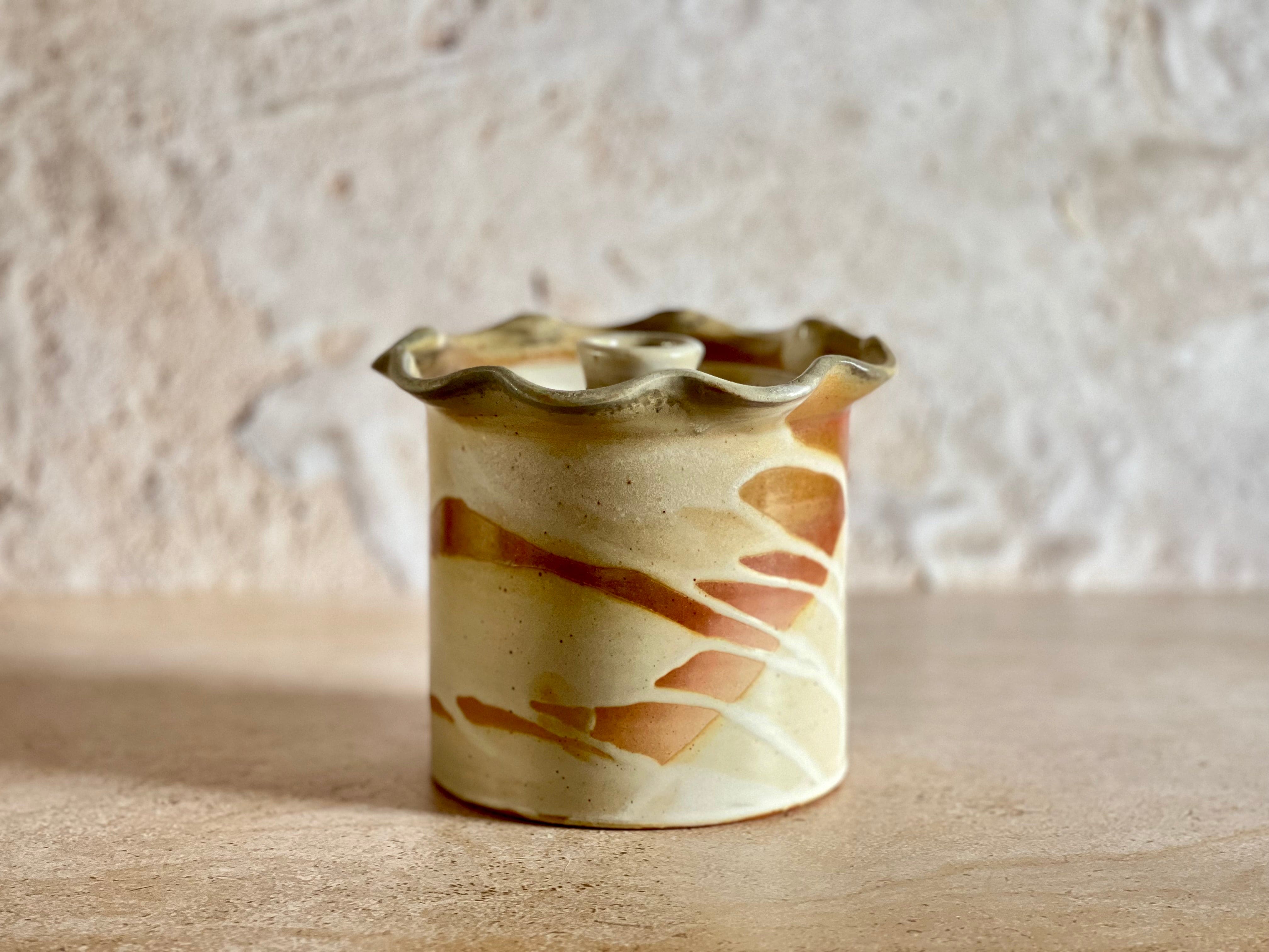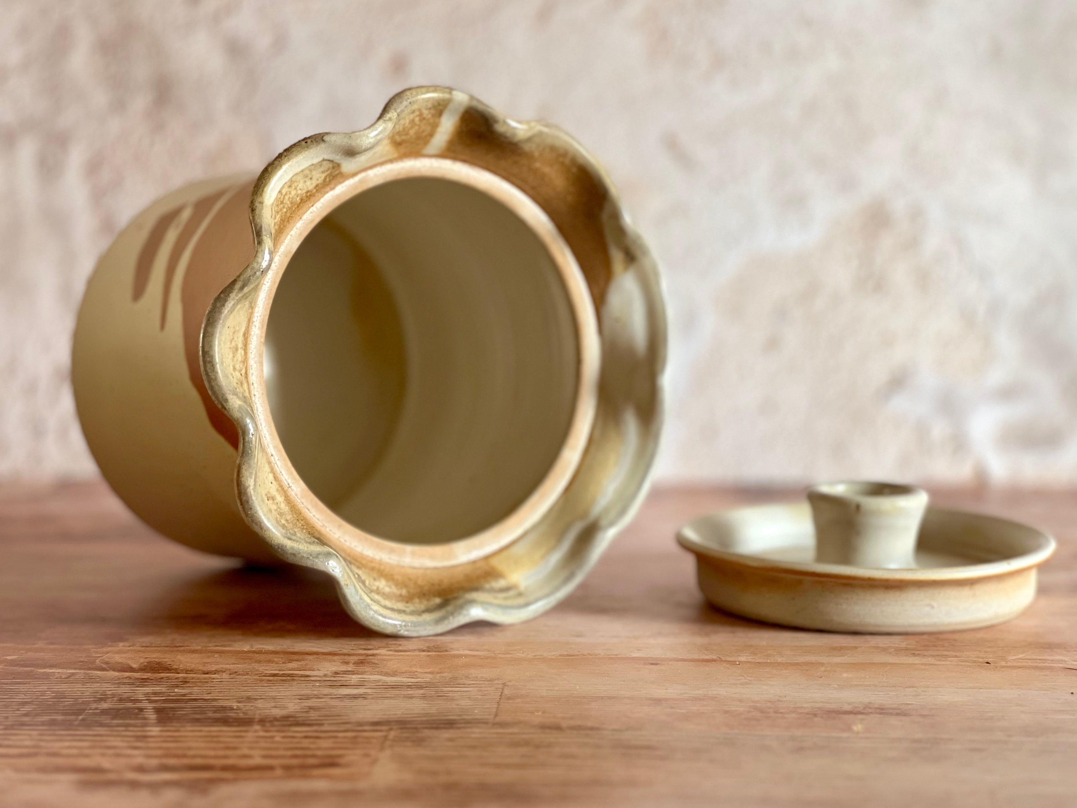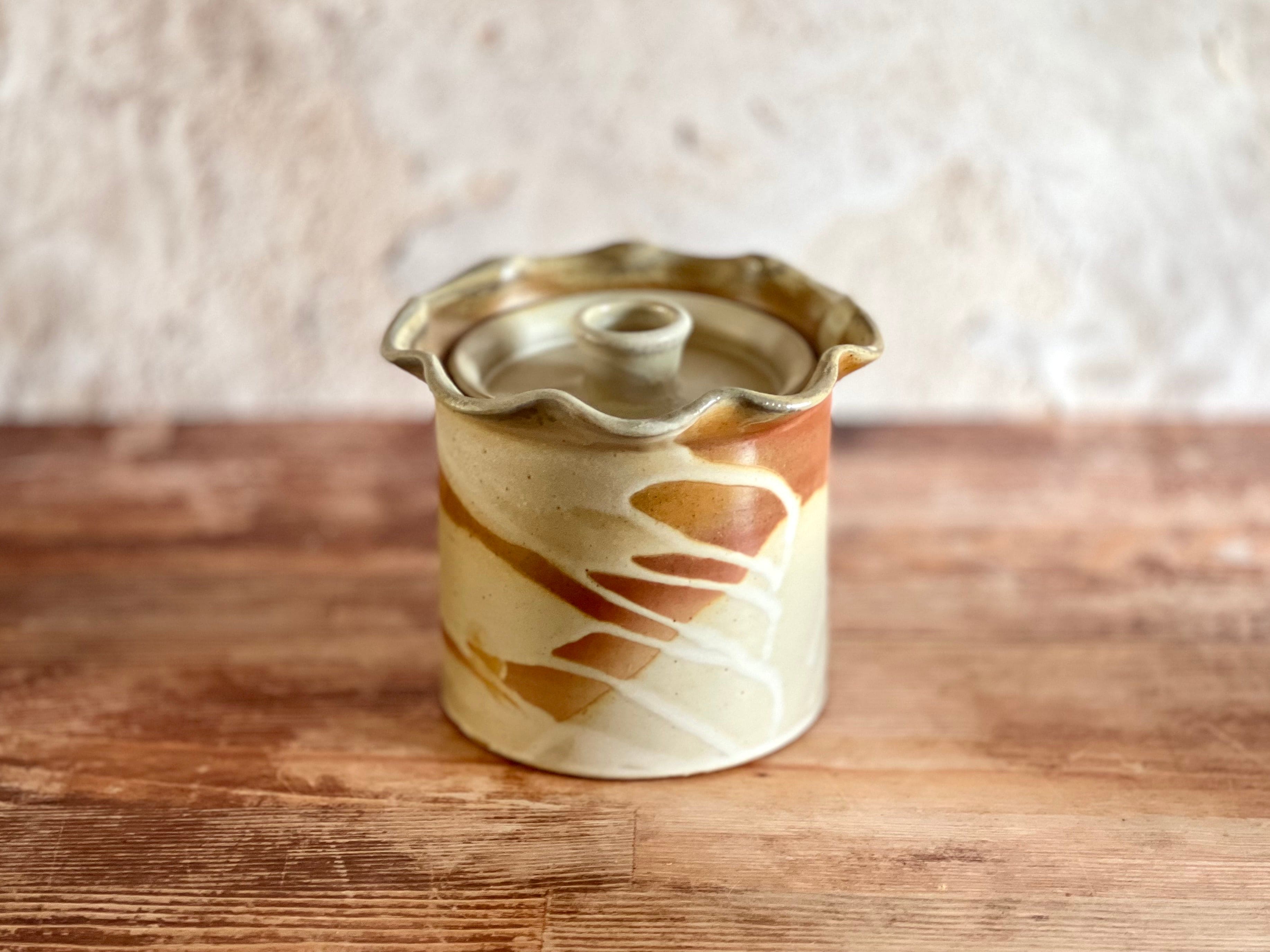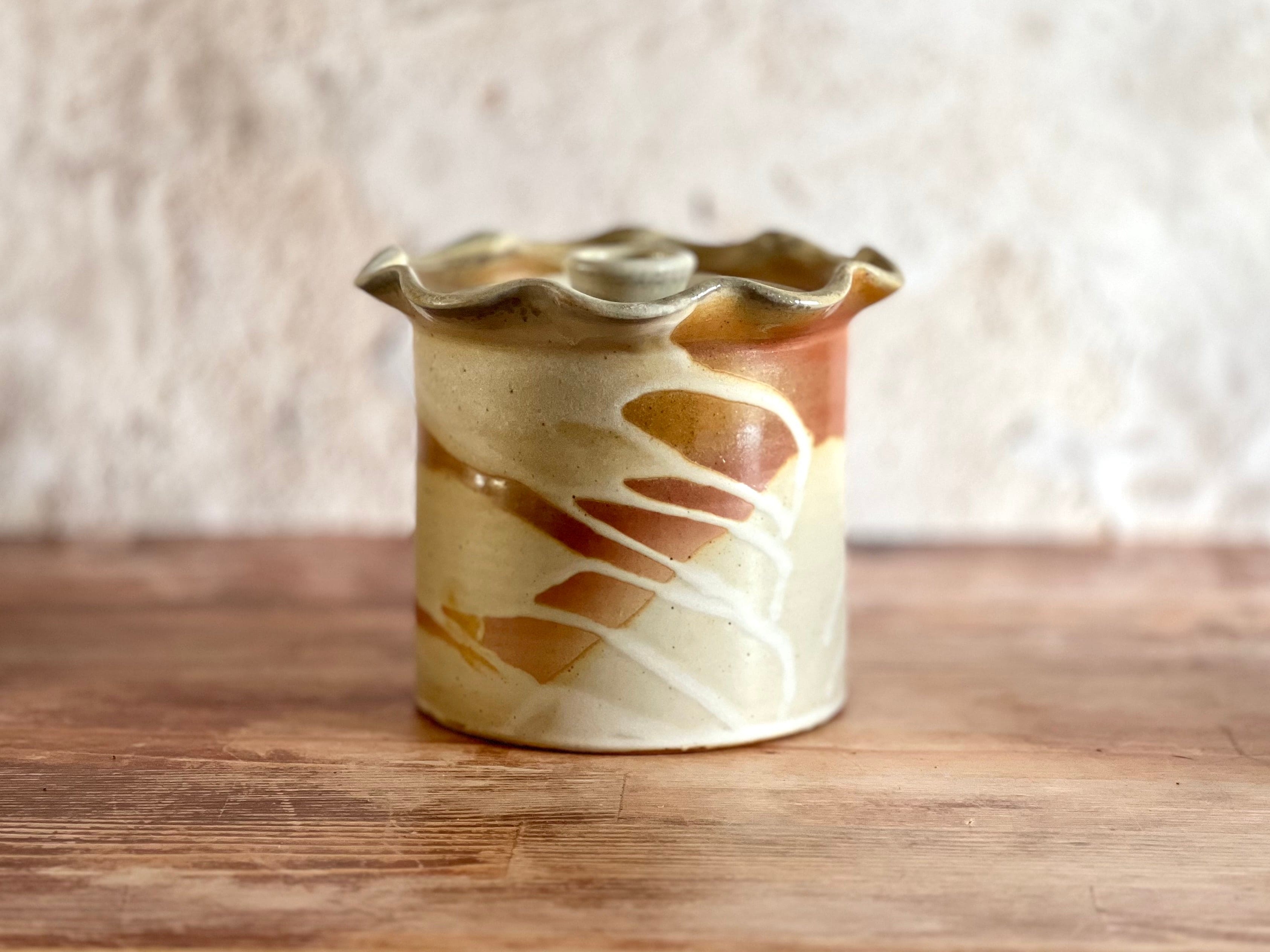 A soft ruffle frames the top of this lidded jar, giving it a sense of movement and presence. The inset lid fits neatly inside, finished with a sturdy handle for easy lifting. The woodfiring process has brought out a subtle depth and warmth to the white glaze splashed over the surface.