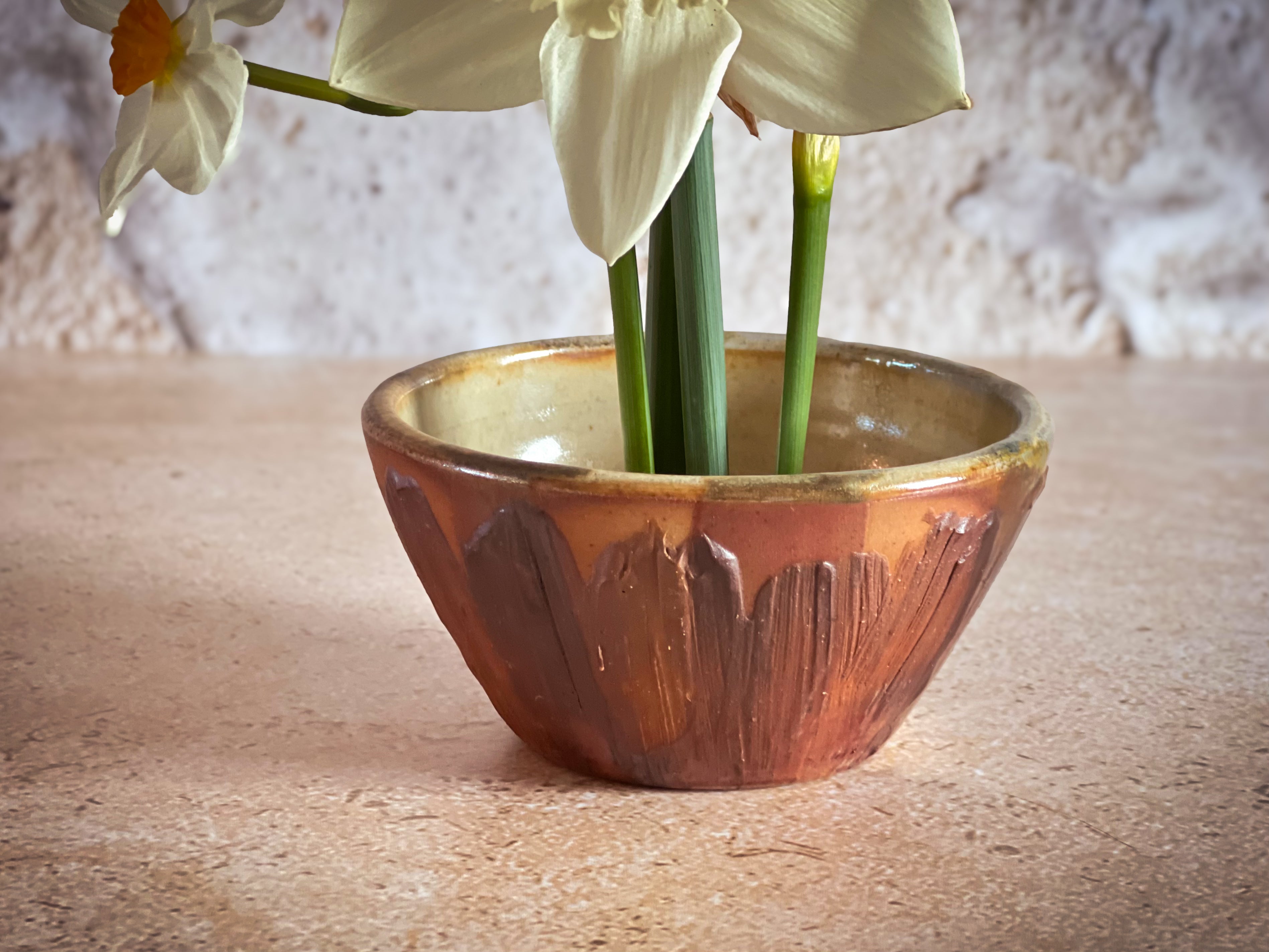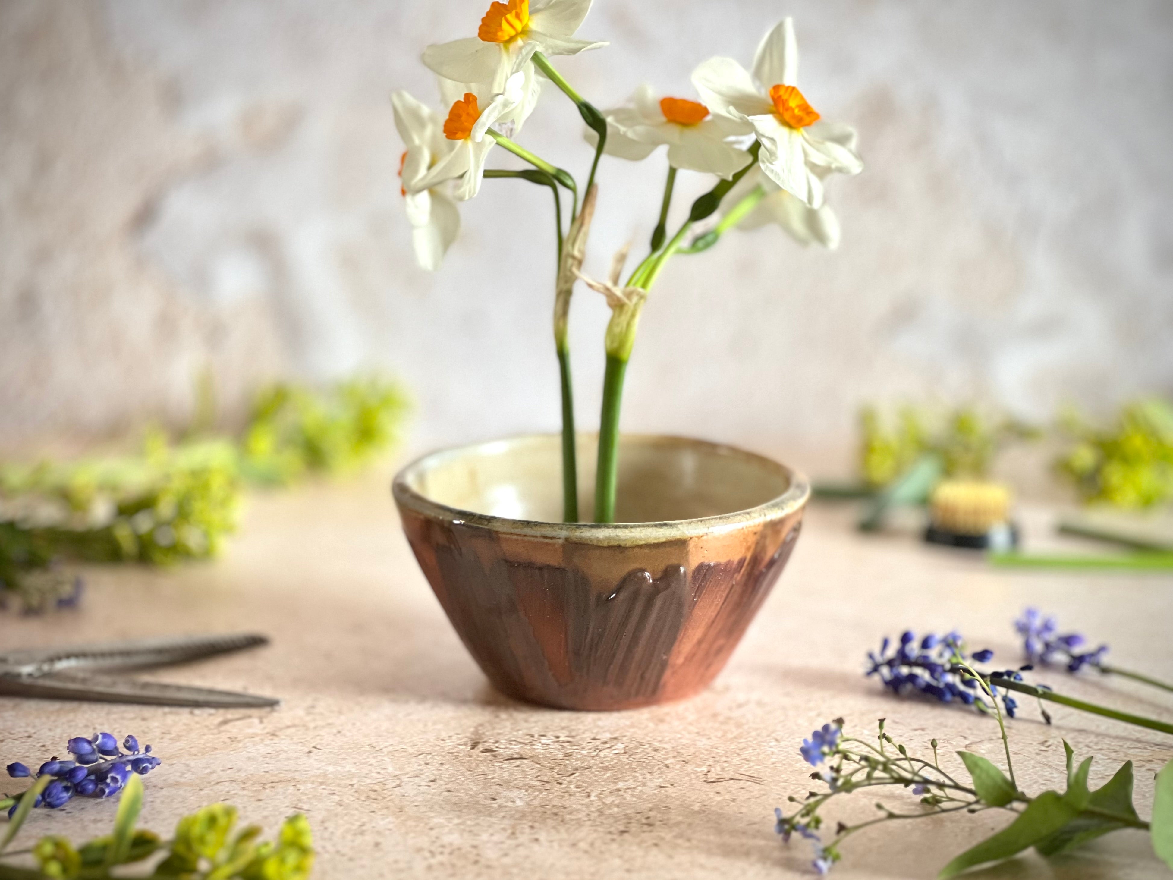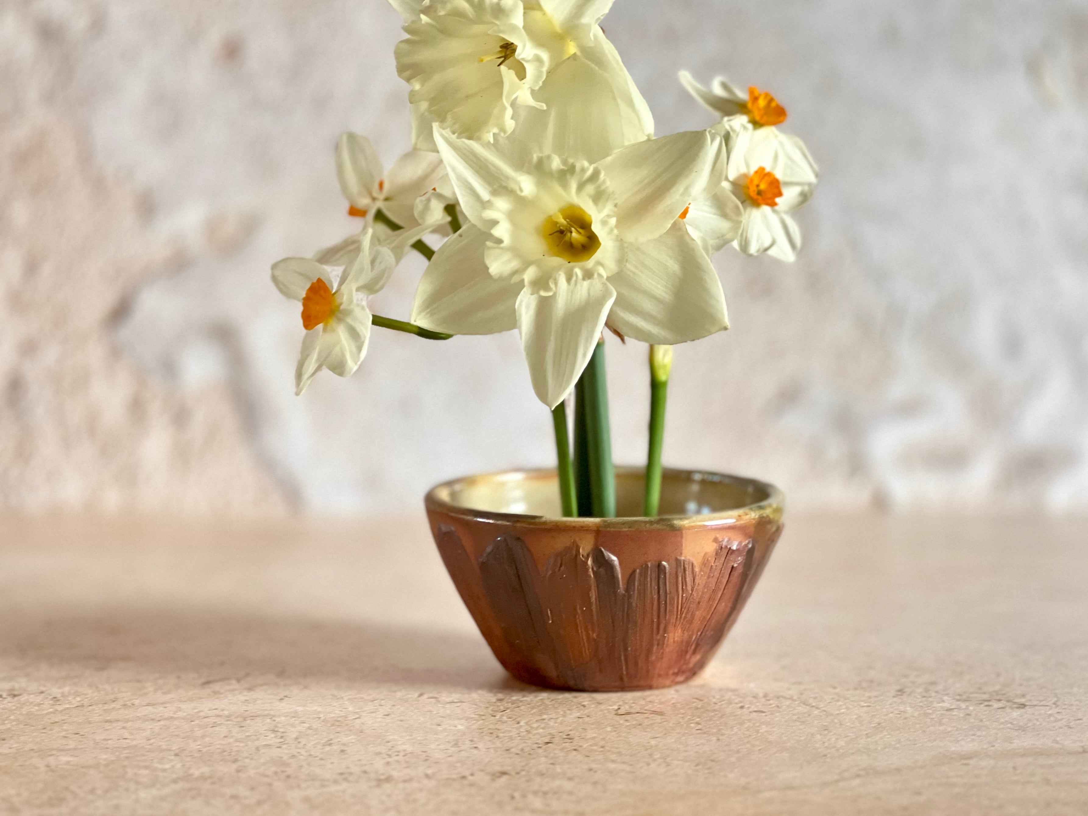 Although I created these with ikebana (a style of flower arranging) in mind, these small hand-thrown bowls are quiet multitaskers. Each one is unique, with subtle variations in glaze and form. Use them for simple flower arranging with a frog (available separately), or let them serve as a favorite dish for snacks, salt, rings, or anything small and special. Each is one-of-a-kind.