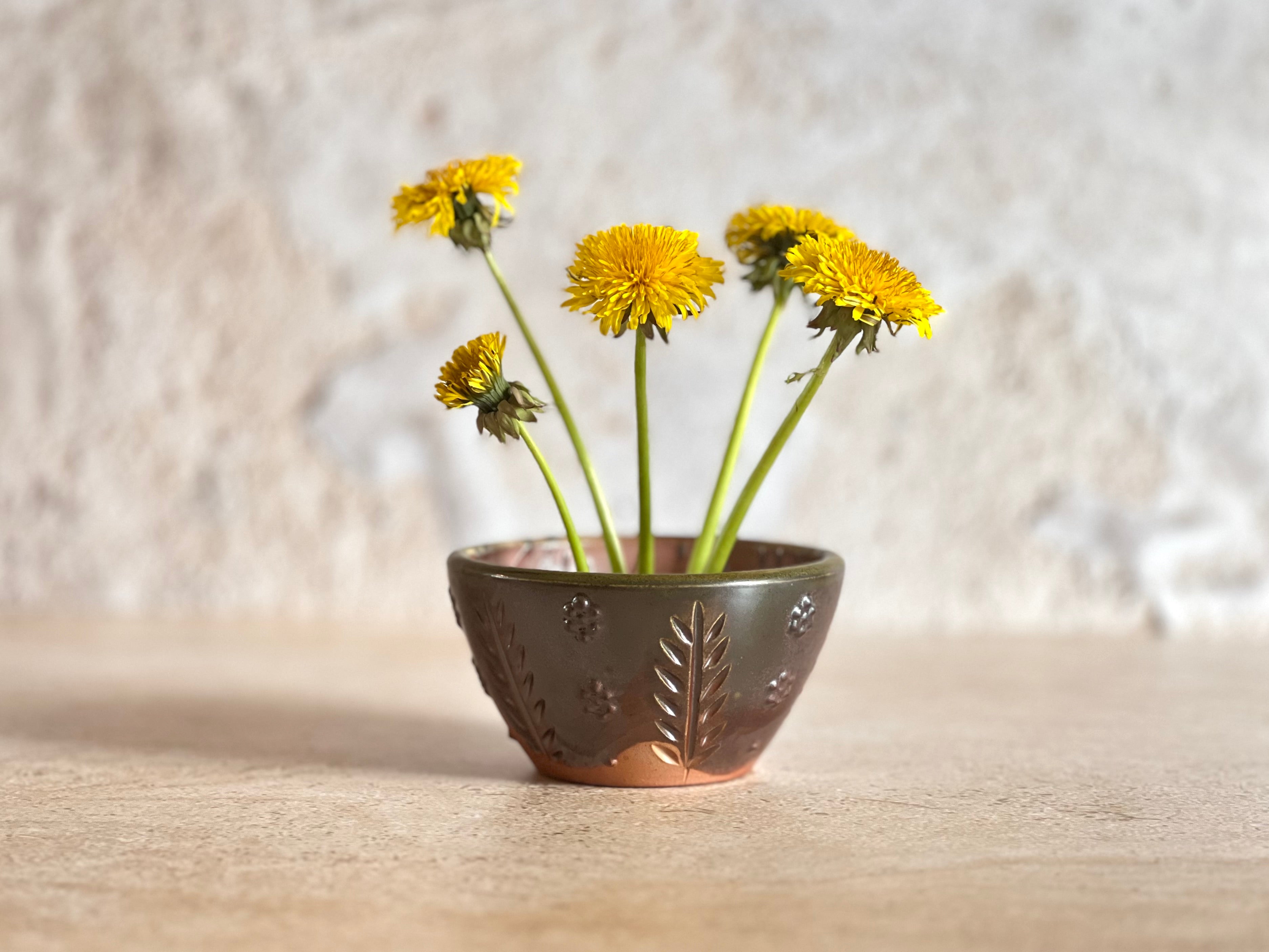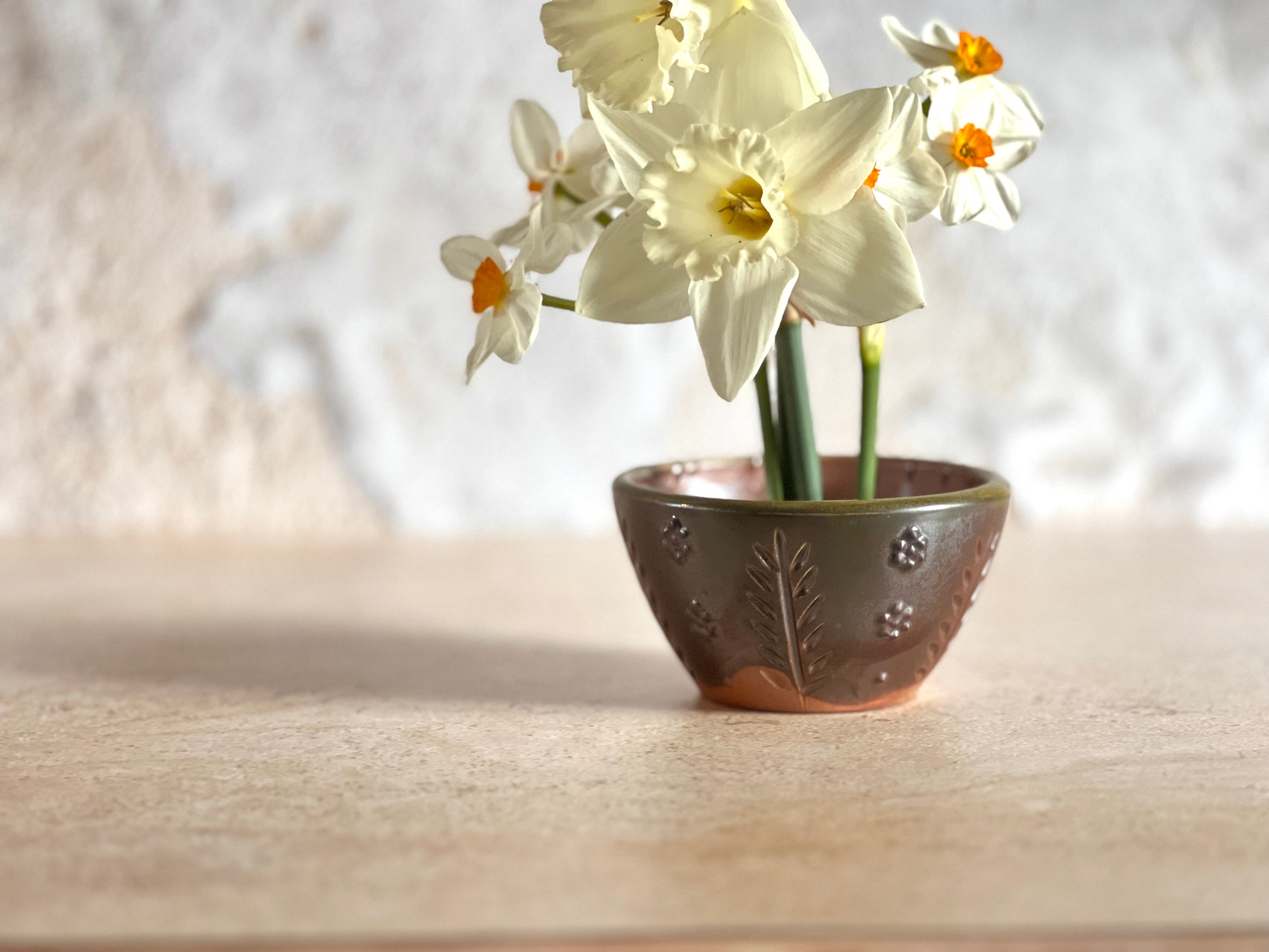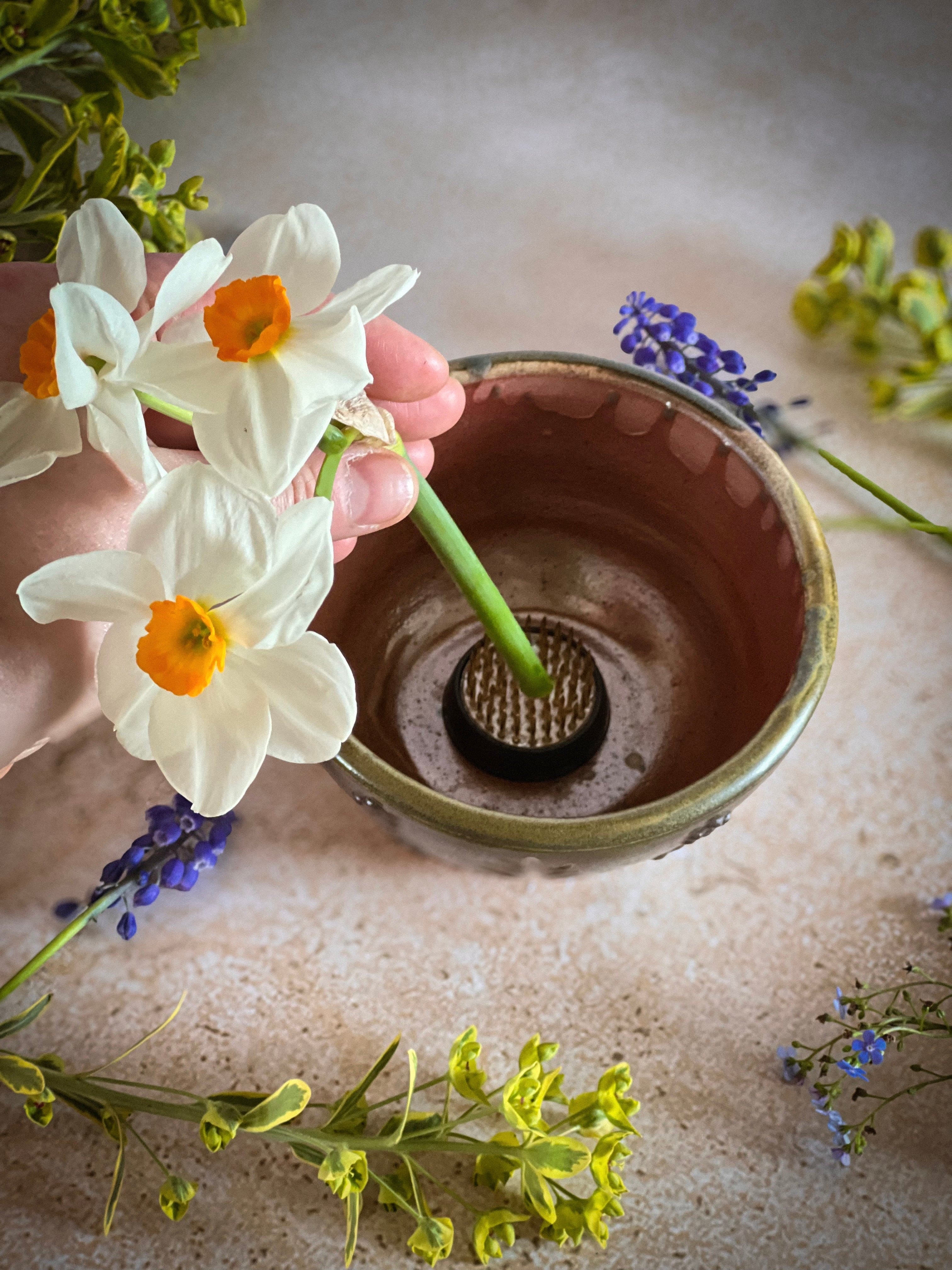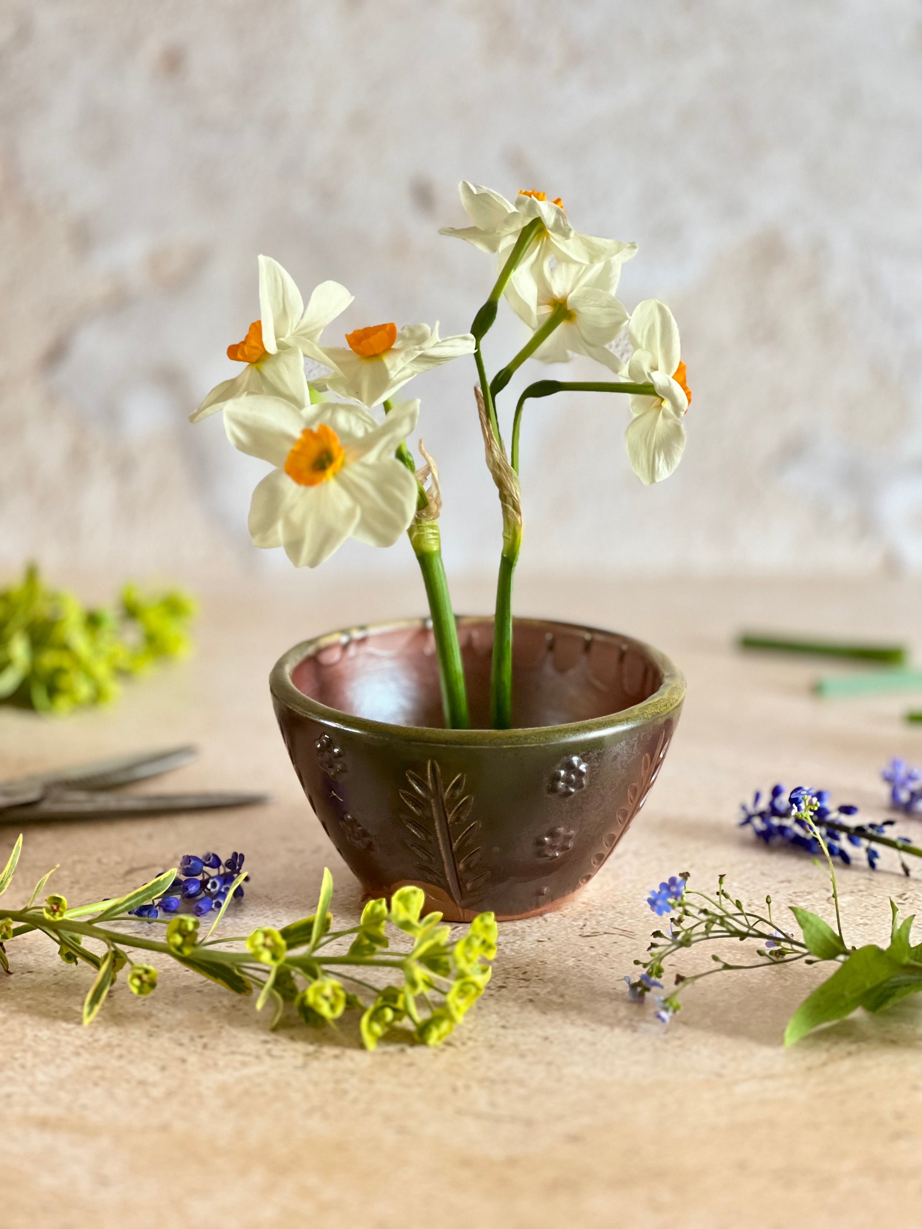 Although I created these with ikebana (a style of flower arranging) in mind, these small hand-thrown bowls are quiet multitaskers. Each one is unique, with subtle variations in glaze and form. Use them for simple flower arranging with a frog (available separately), or let them serve as a favorite dish for snacks, salt, rings, or anything small and special. Each is one-of-a-kind.