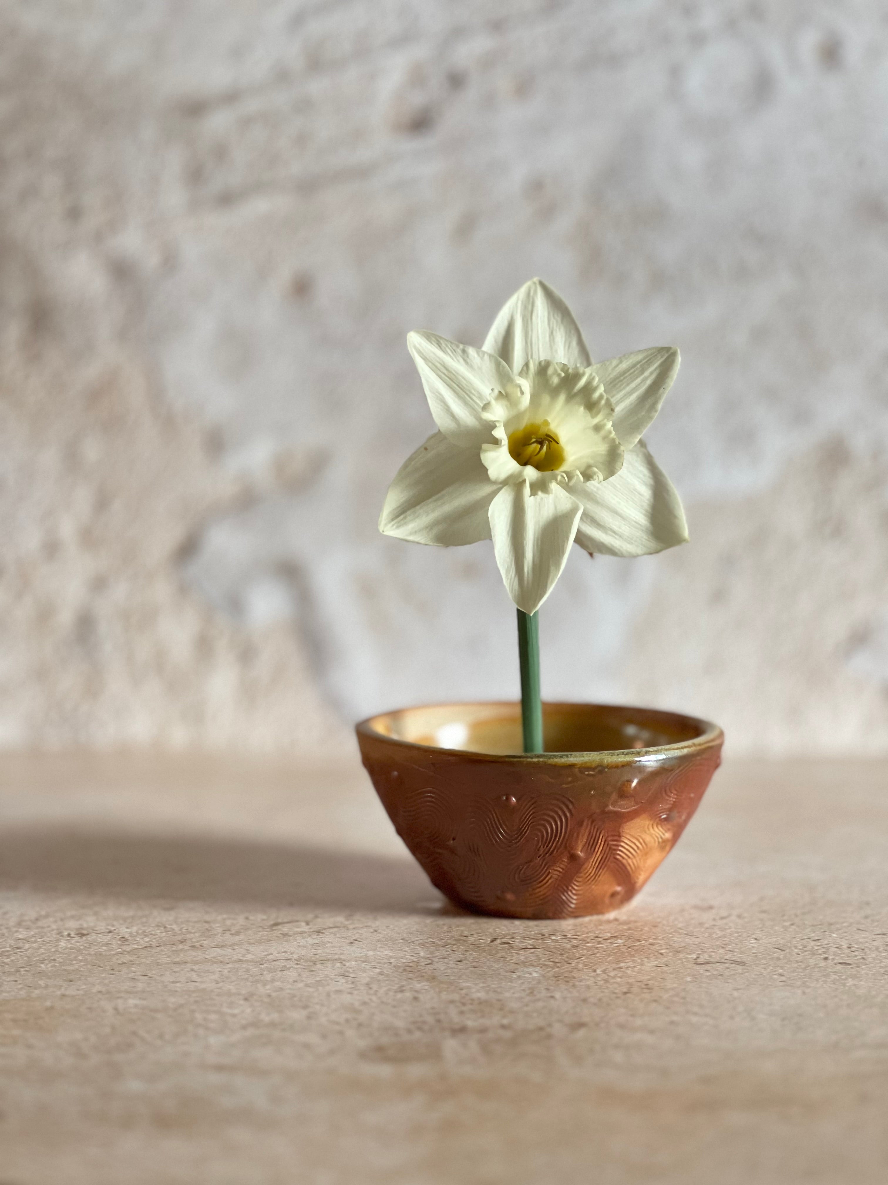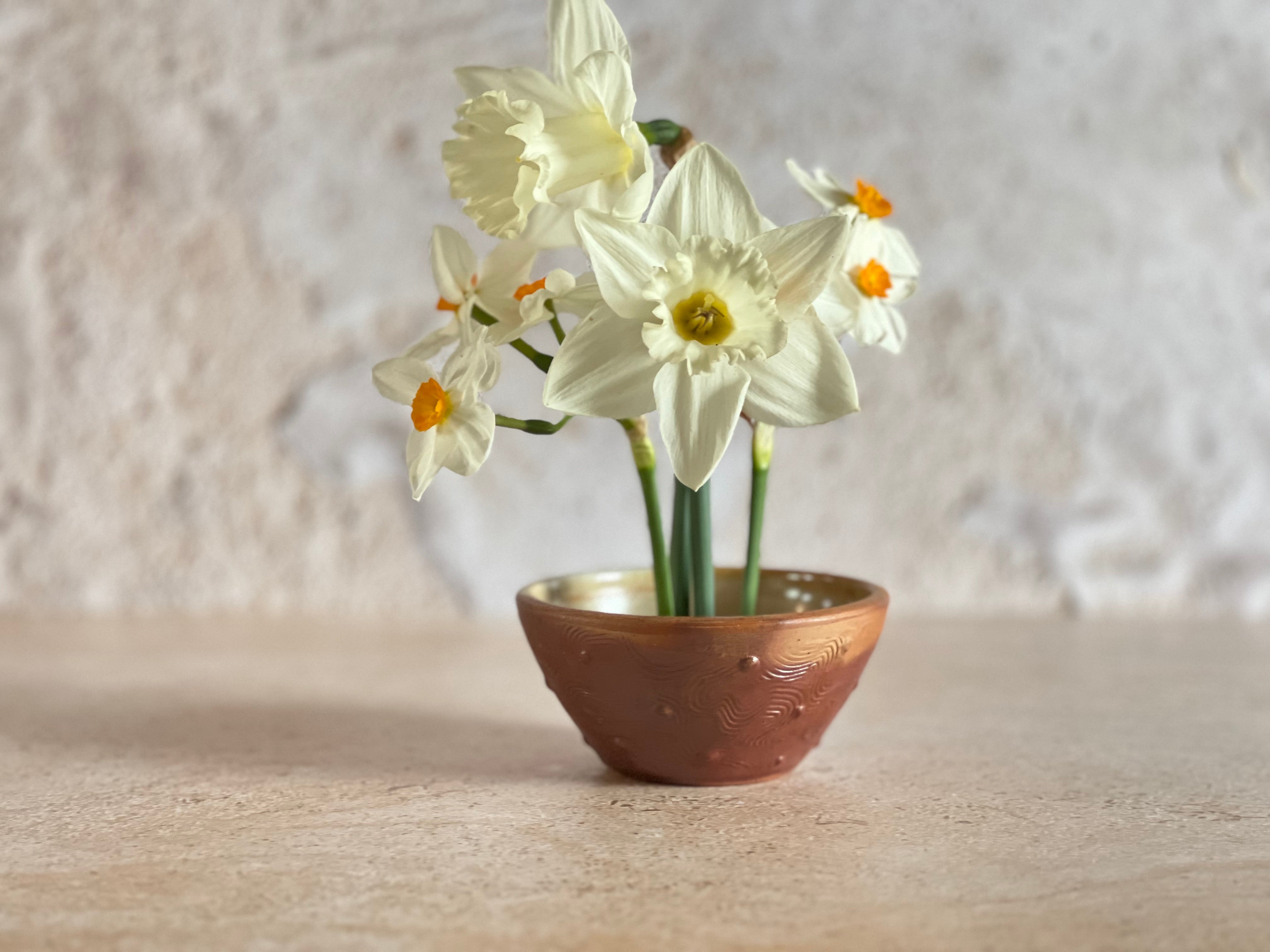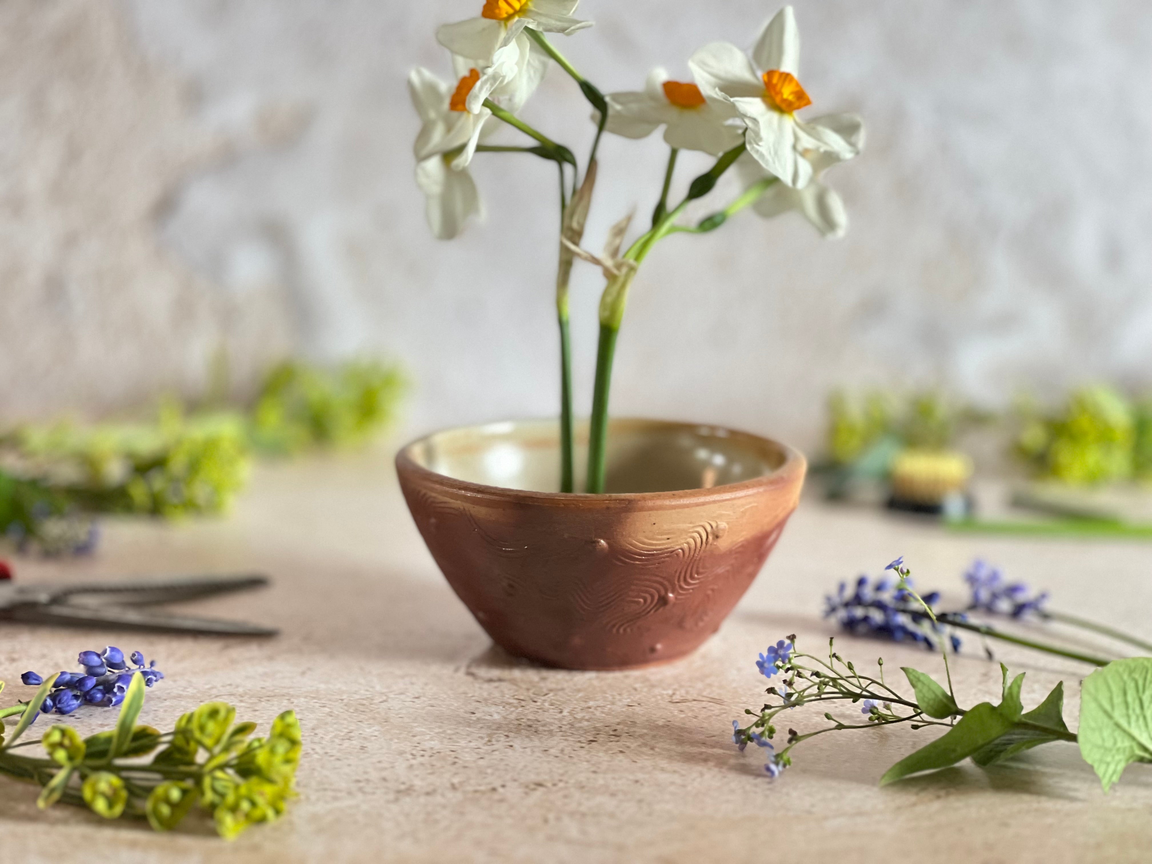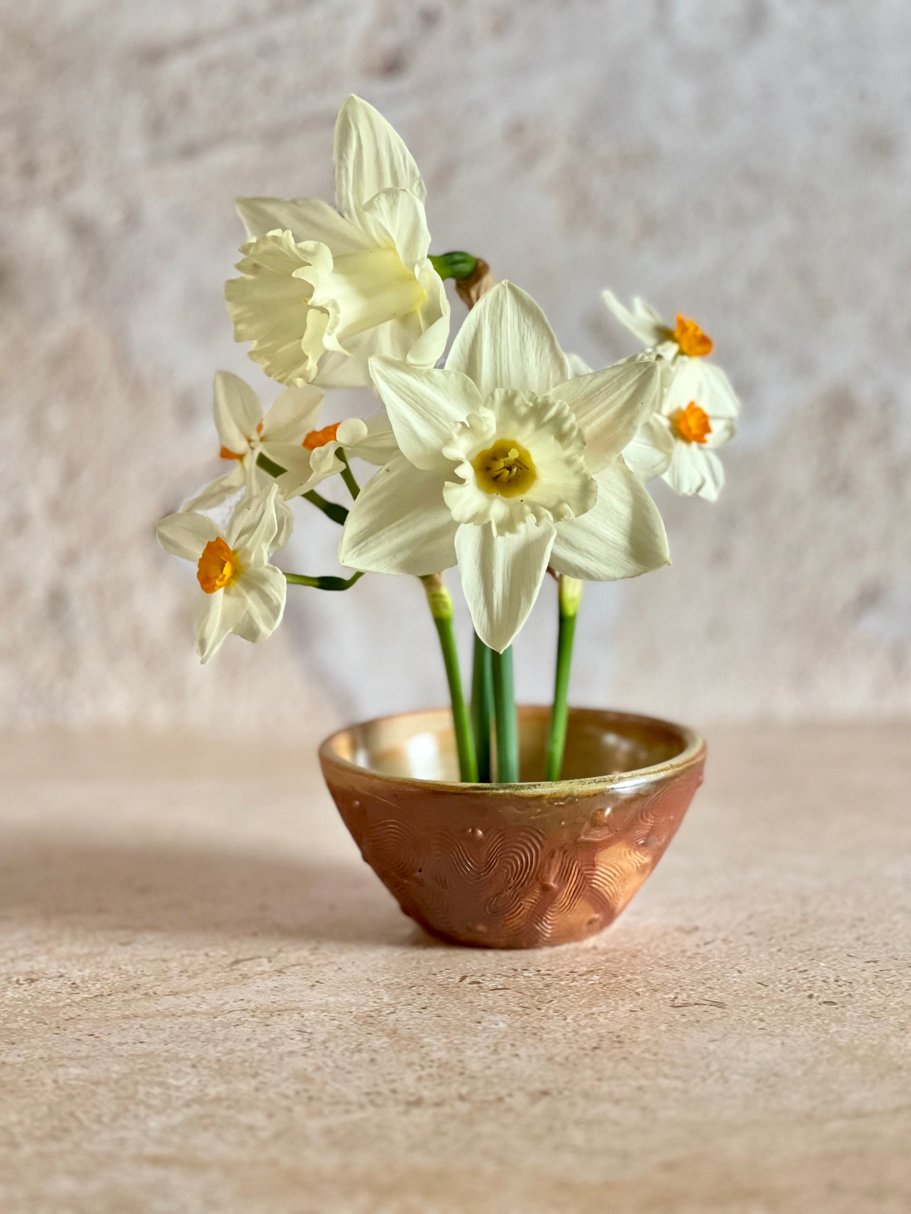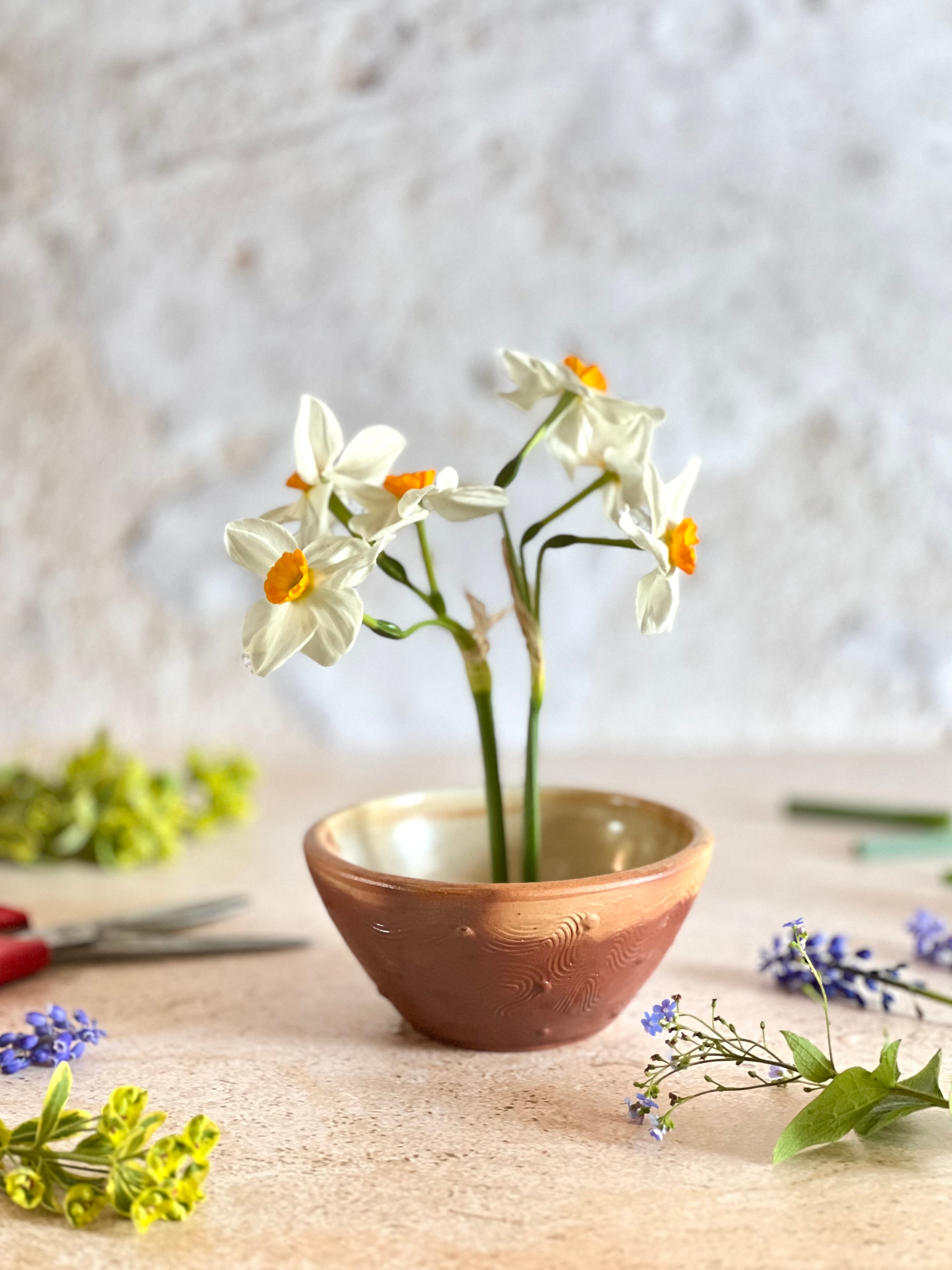 Although I created these with ikebana (a style of flower arranging) in mind, these small hand-thrown bowls are quiet multitaskers. Each one is unique, with subtle variations in glaze and form. Use them for simple flower arranging with a frog (available separately), or let them serve as a favorite dish for snacks, salt, rings, or anything small and special. Each is one-of-a-kind.