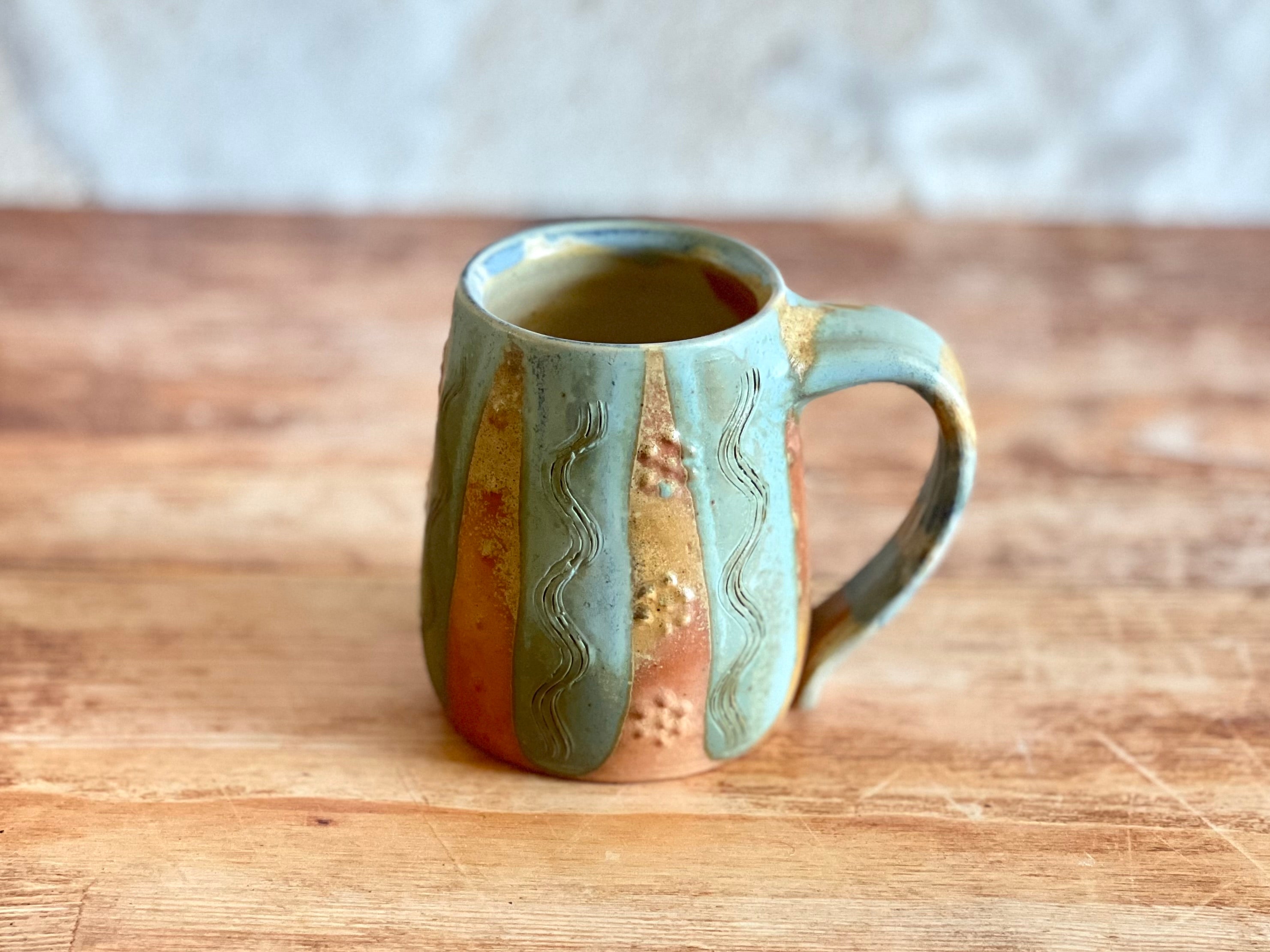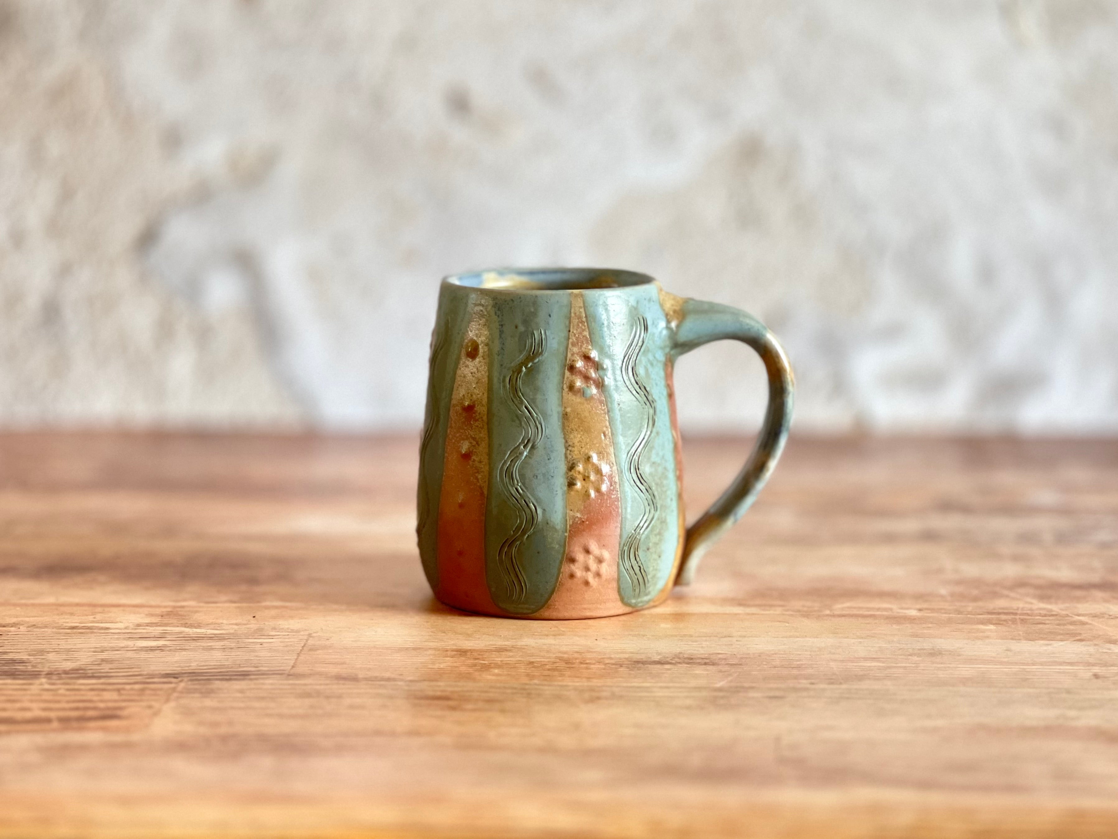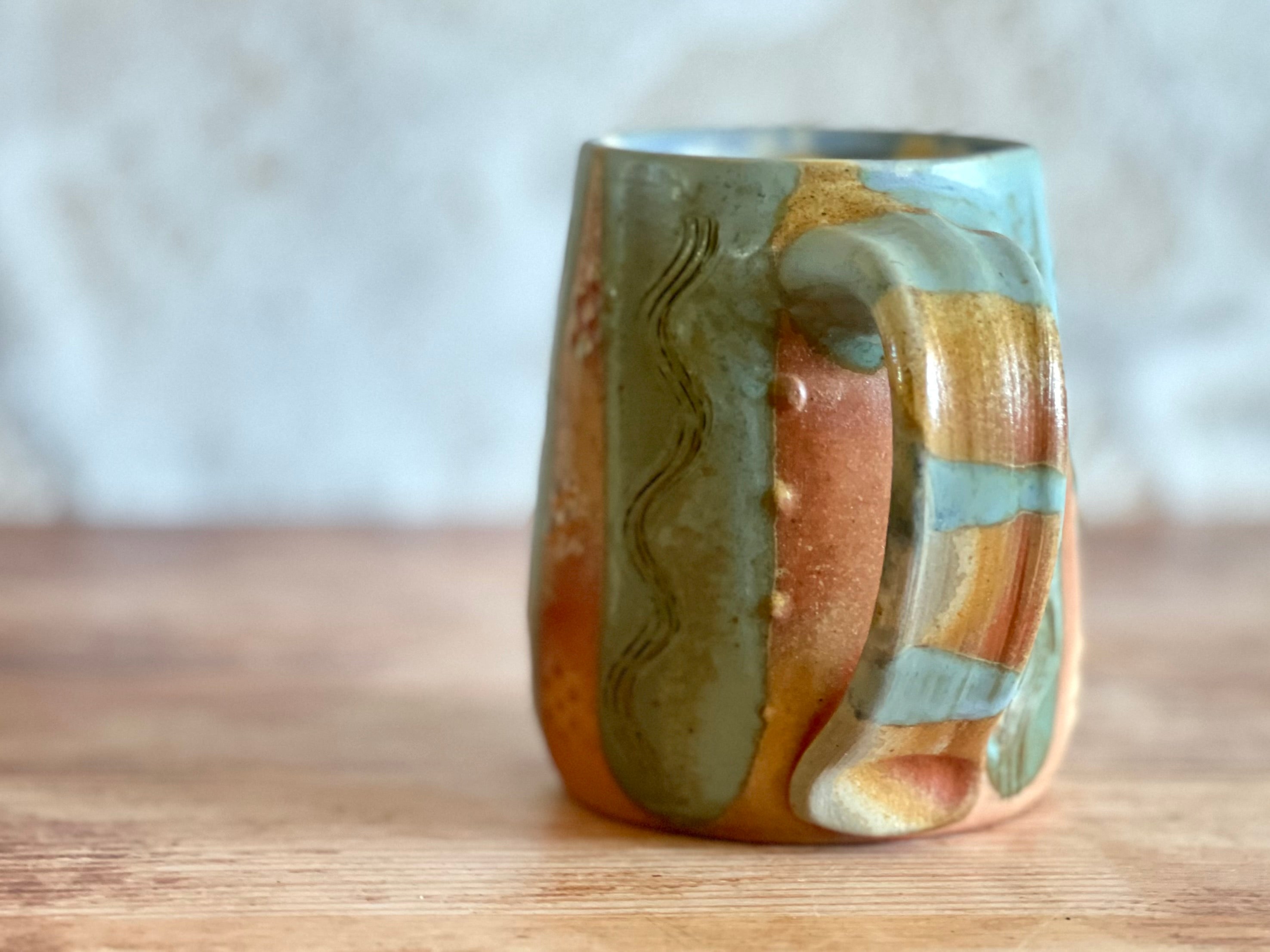 Each of these mugs is one of a kind, shaped by hand and finished in the wood kiln. No two are alike - each bears its own patterns of flame, glaze, and texture, shaped by both the making and the fire. Sturdy in the hand and made to be used, these pieces bring a little something special to the everyday.