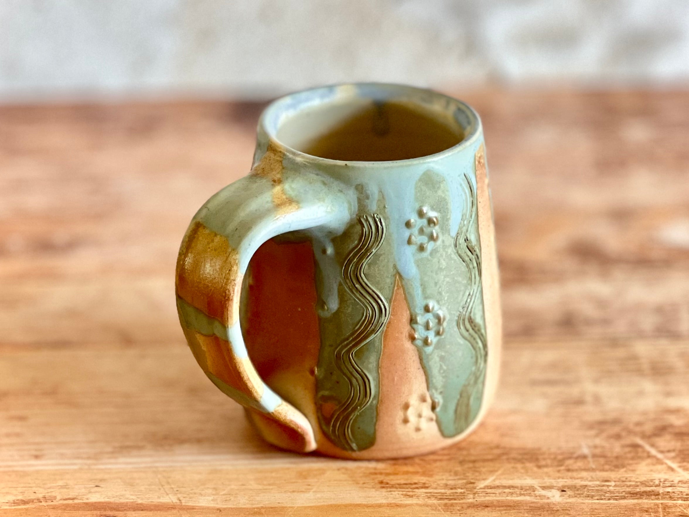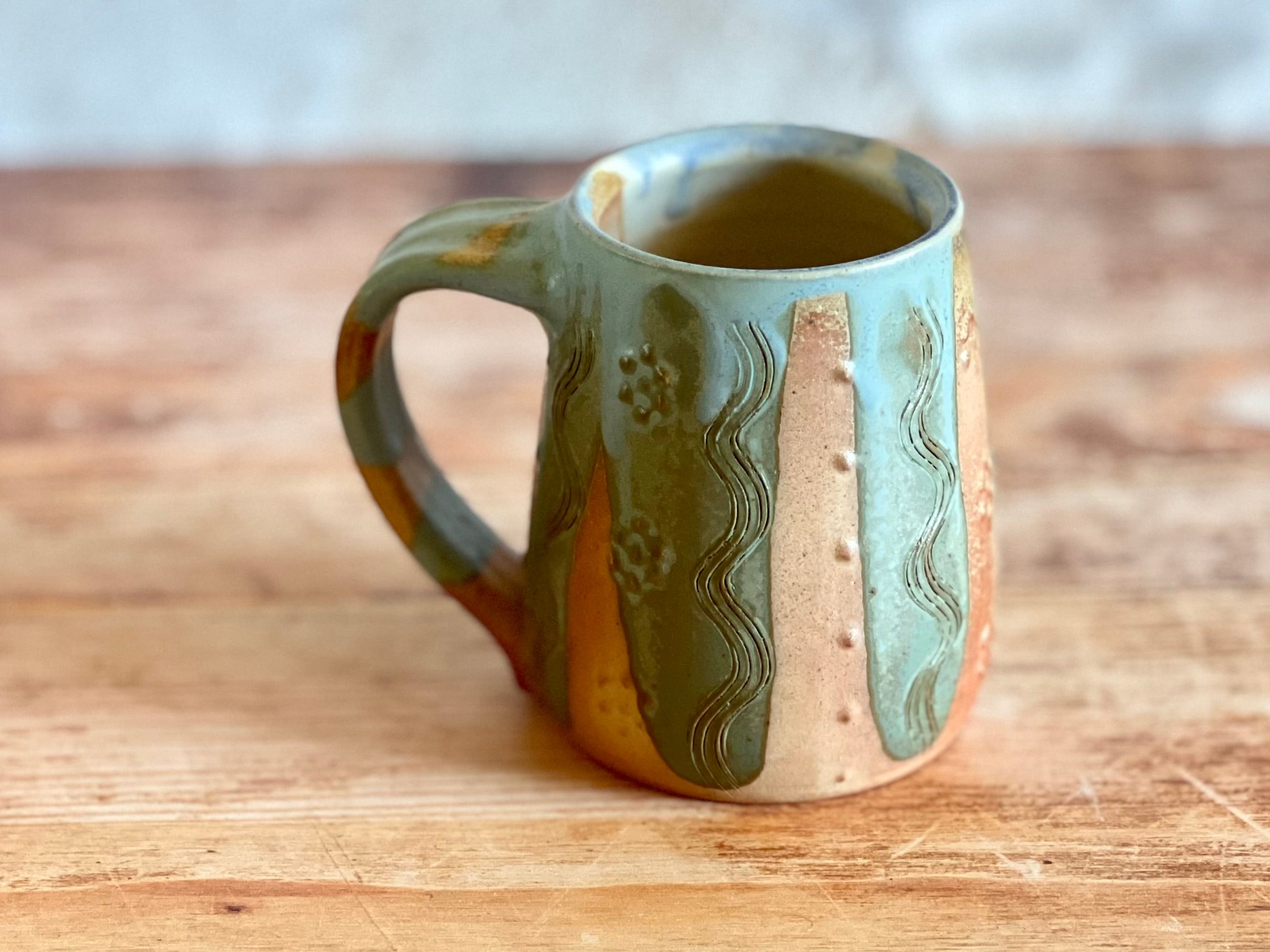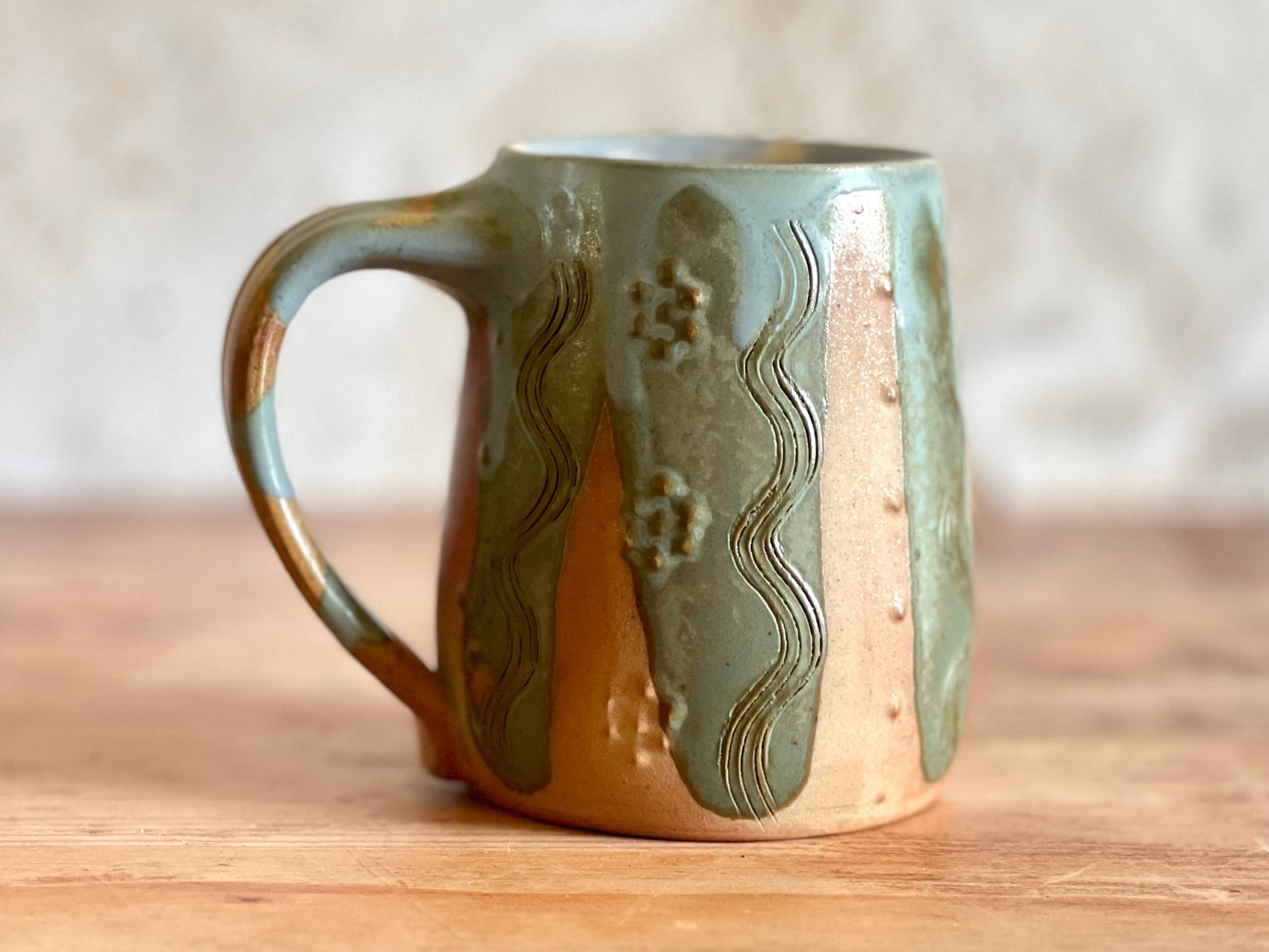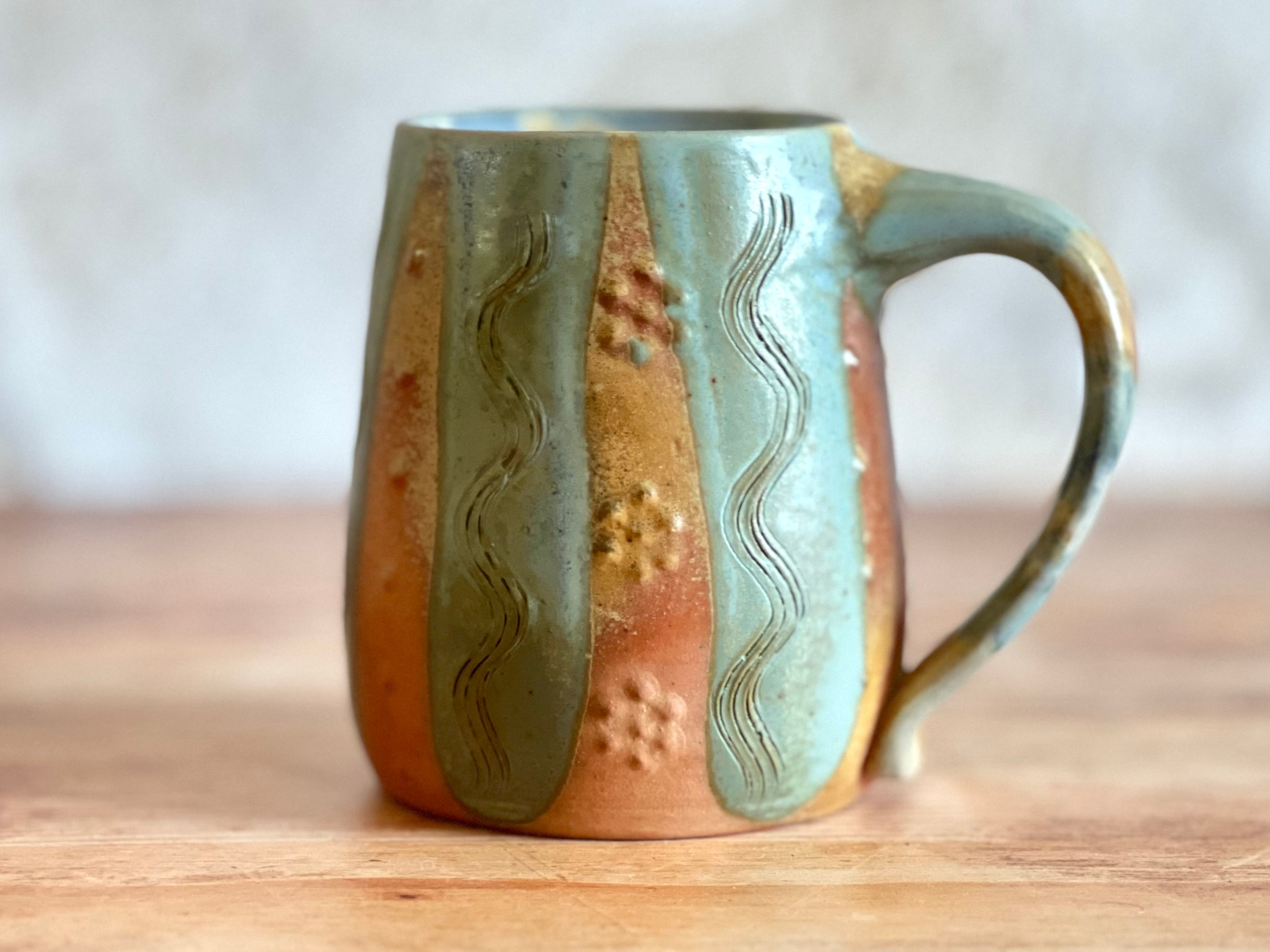 Each of these mugs is one of a kind, shaped by hand and finished in the wood kiln. No two are alike - each bears its own patterns of flame, glaze, and texture, shaped by both the making and the fire. Sturdy in the hand and made to be used, these pieces bring a little something special to the everyday.