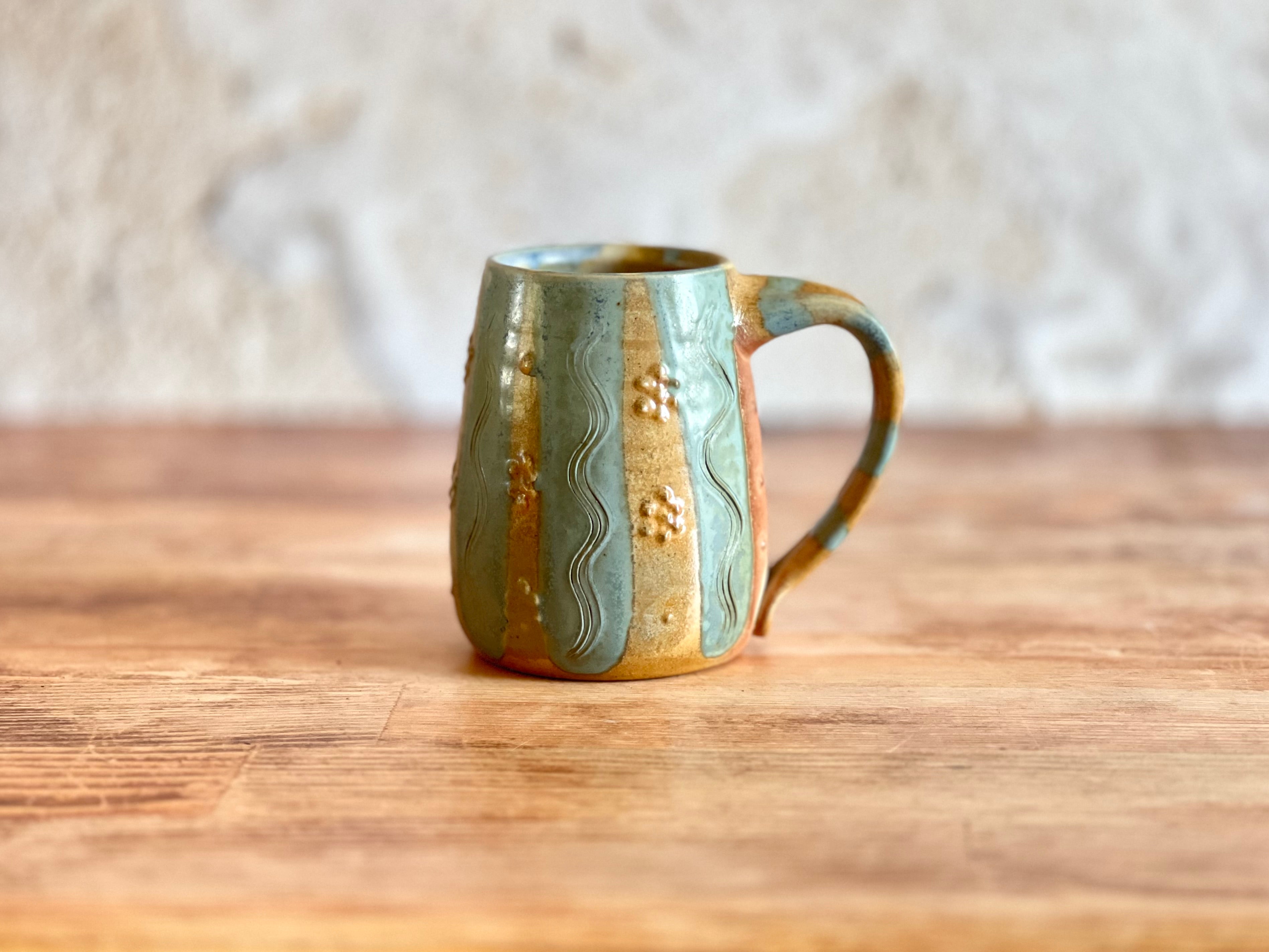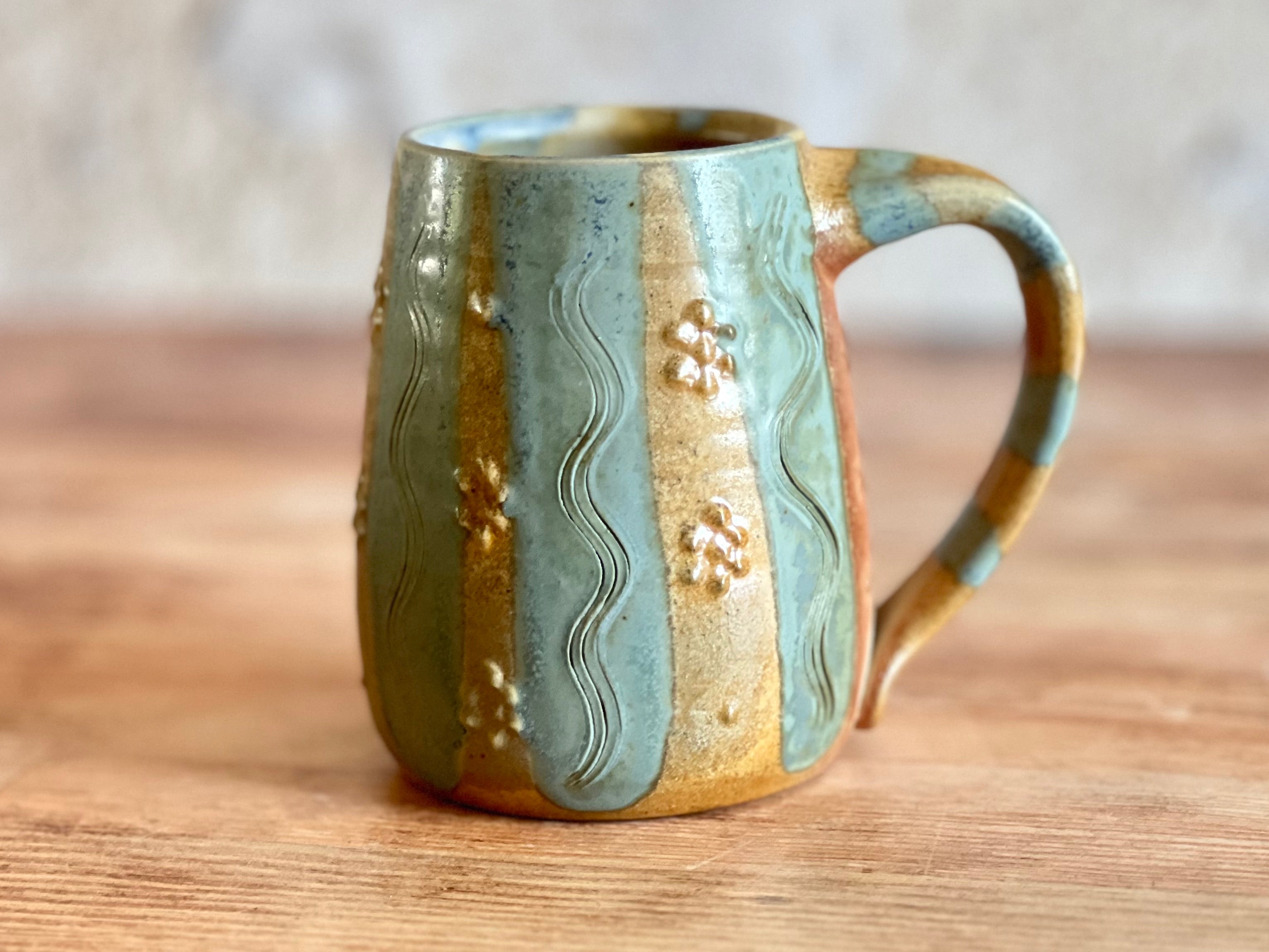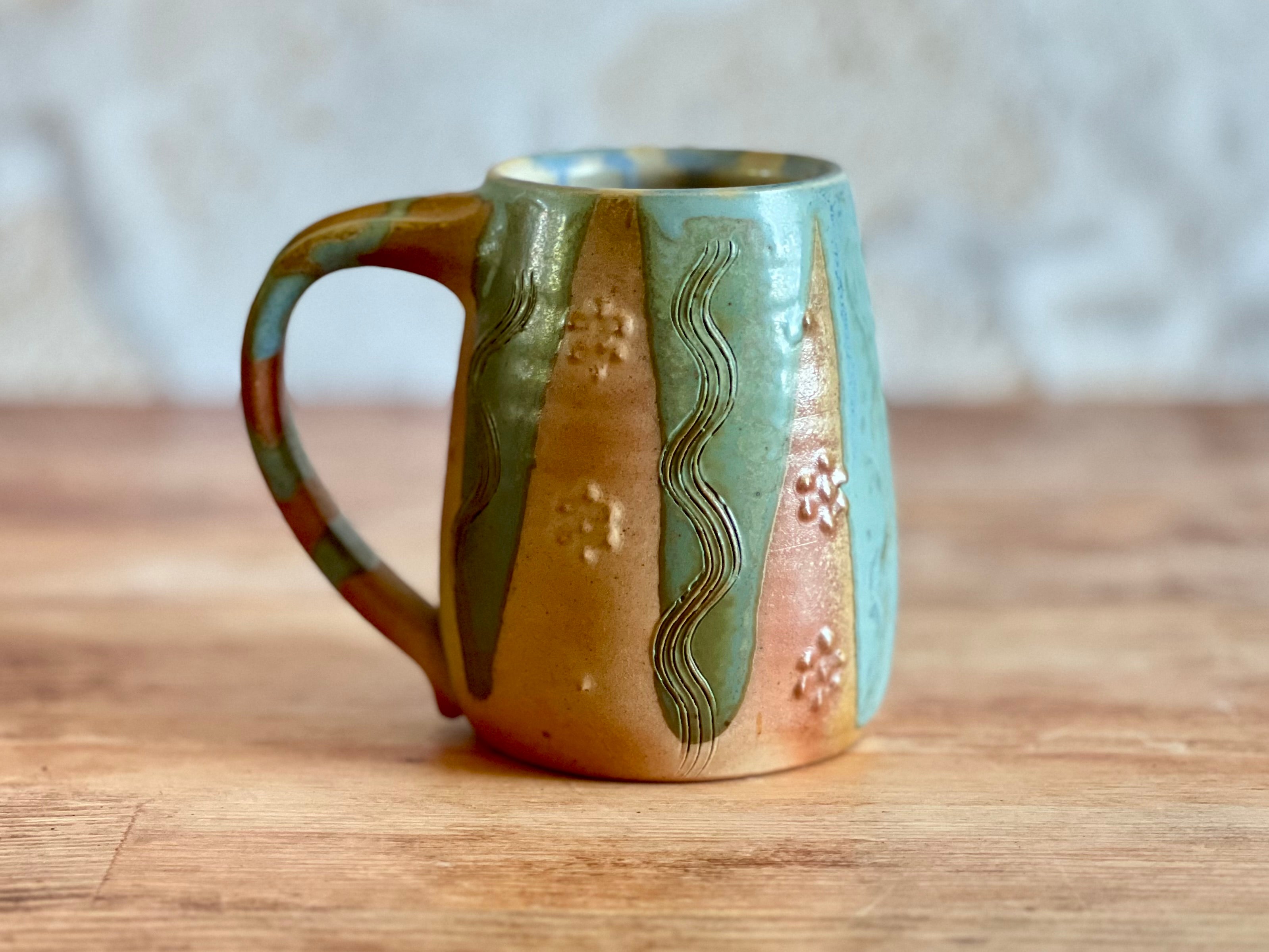 Each of these mugs is one of a kind, shaped by hand and finished in the wood kiln. No two are alike - each bears its own patterns of flame, glaze, and texture, shaped by both the making and the fire. Sturdy in the hand and made to be used, these pieces bring a little something special to the everyday.