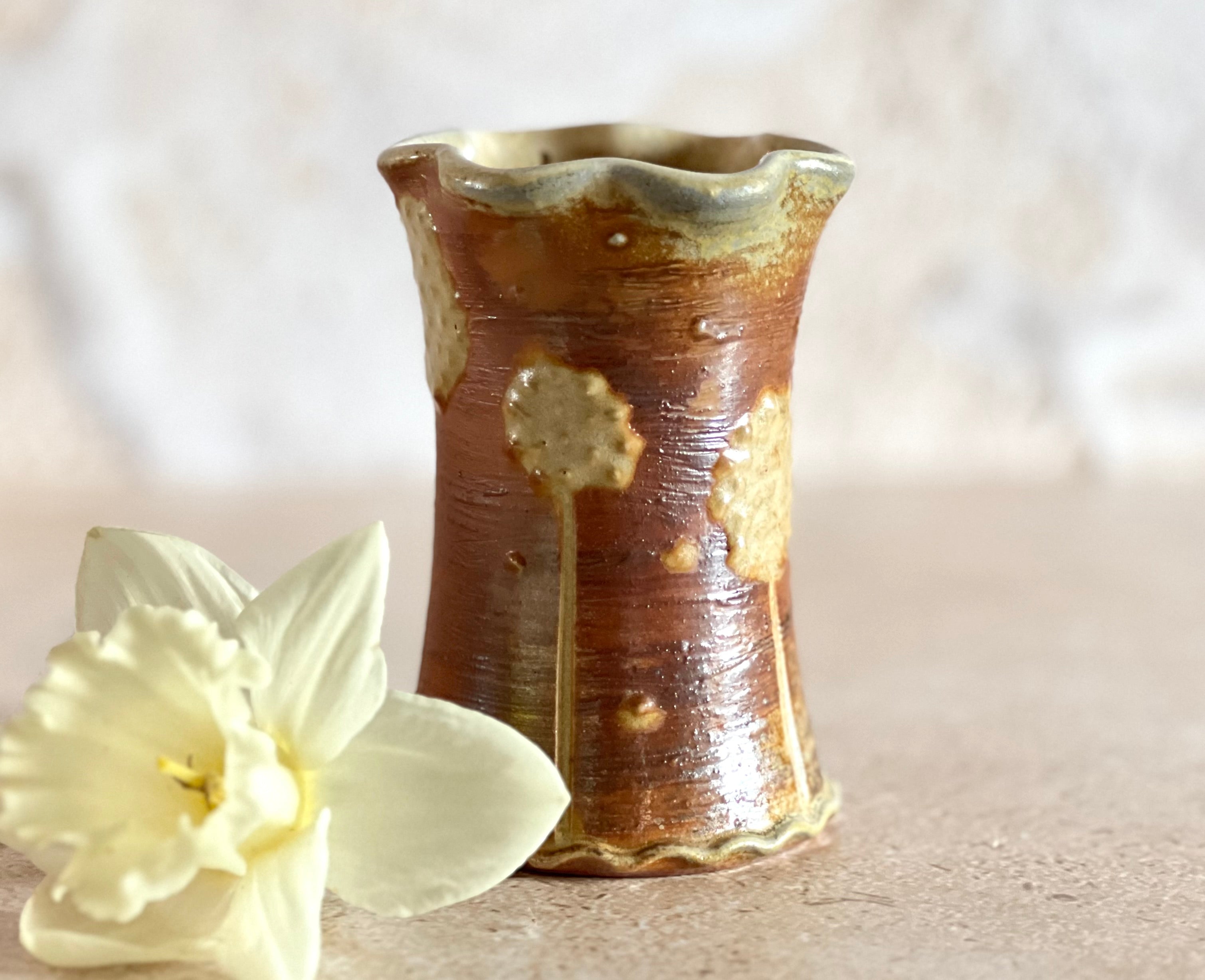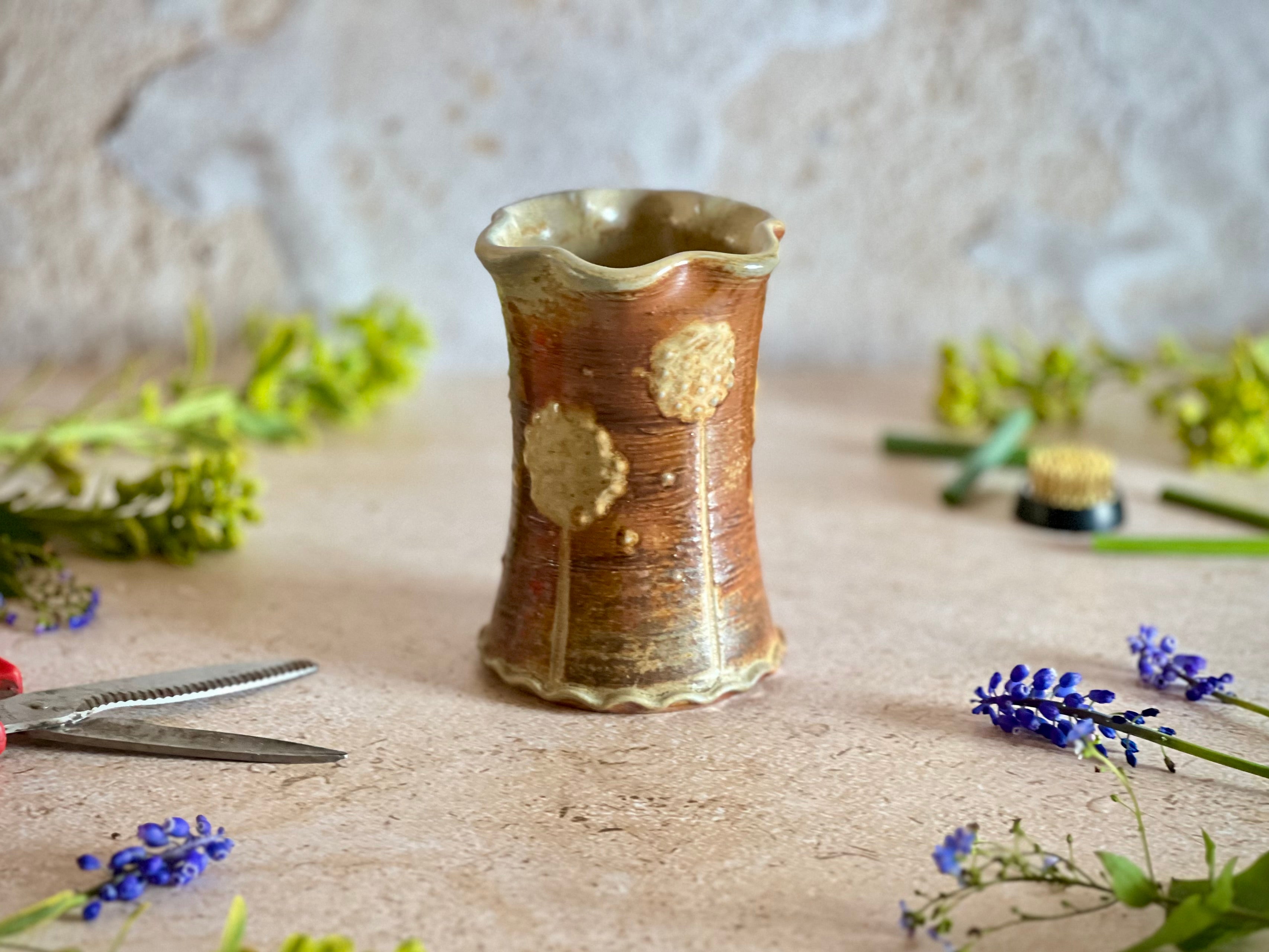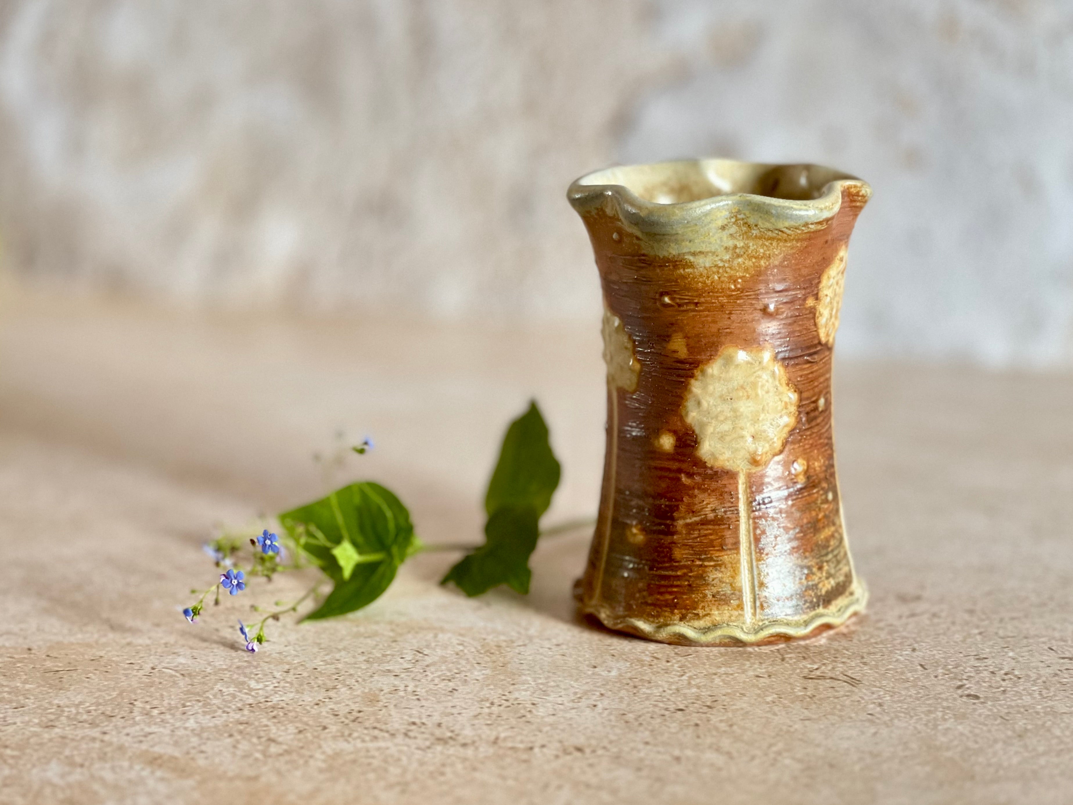 Textured blooms rise up the surface of this vase like dandelions just on the edge of letting go - soft, simple, full of quiet energy and potential. The wood firing swept warm golden hues across the surface, while the wavy rim and carved foot finish it with a playful touch.