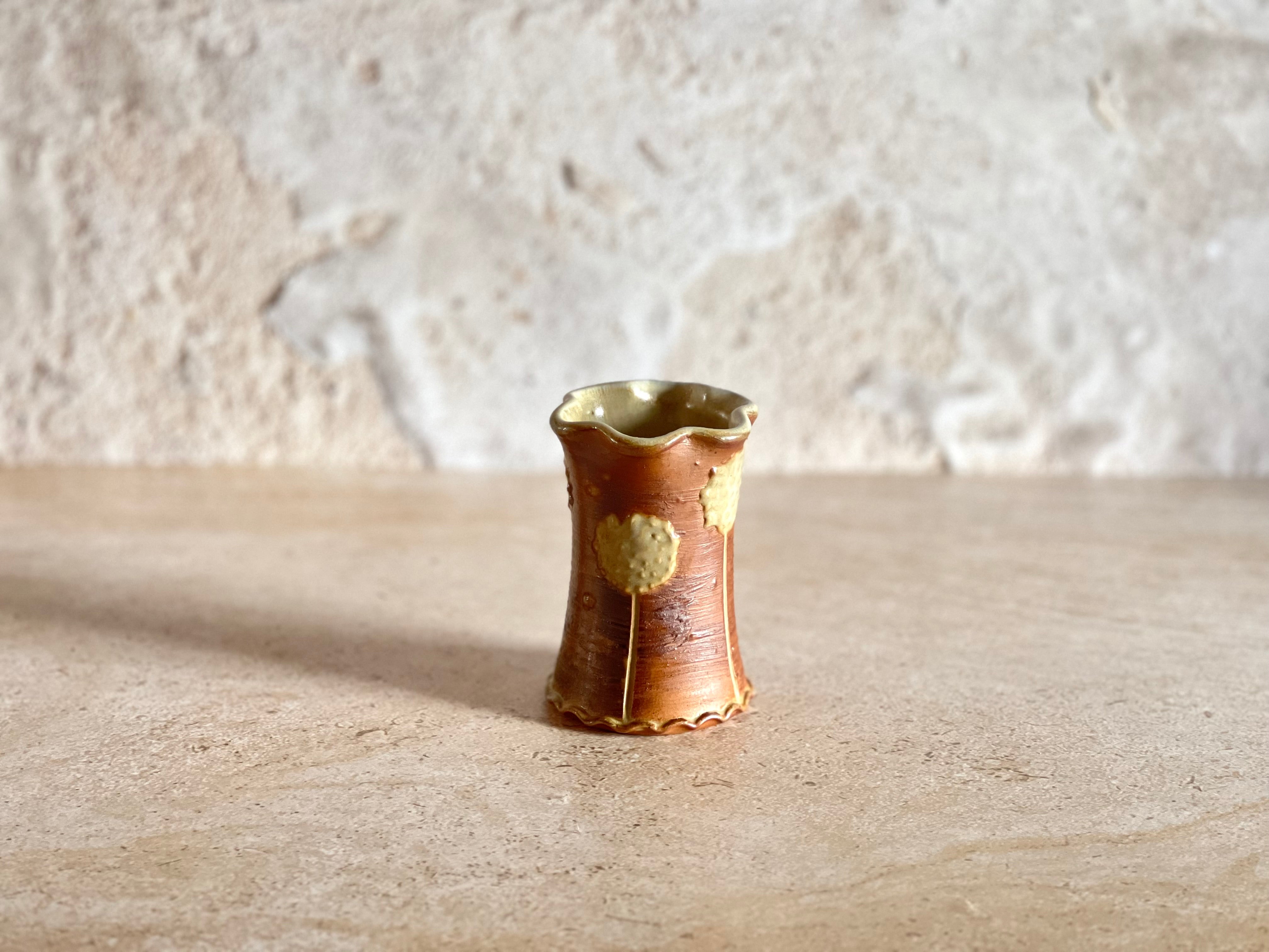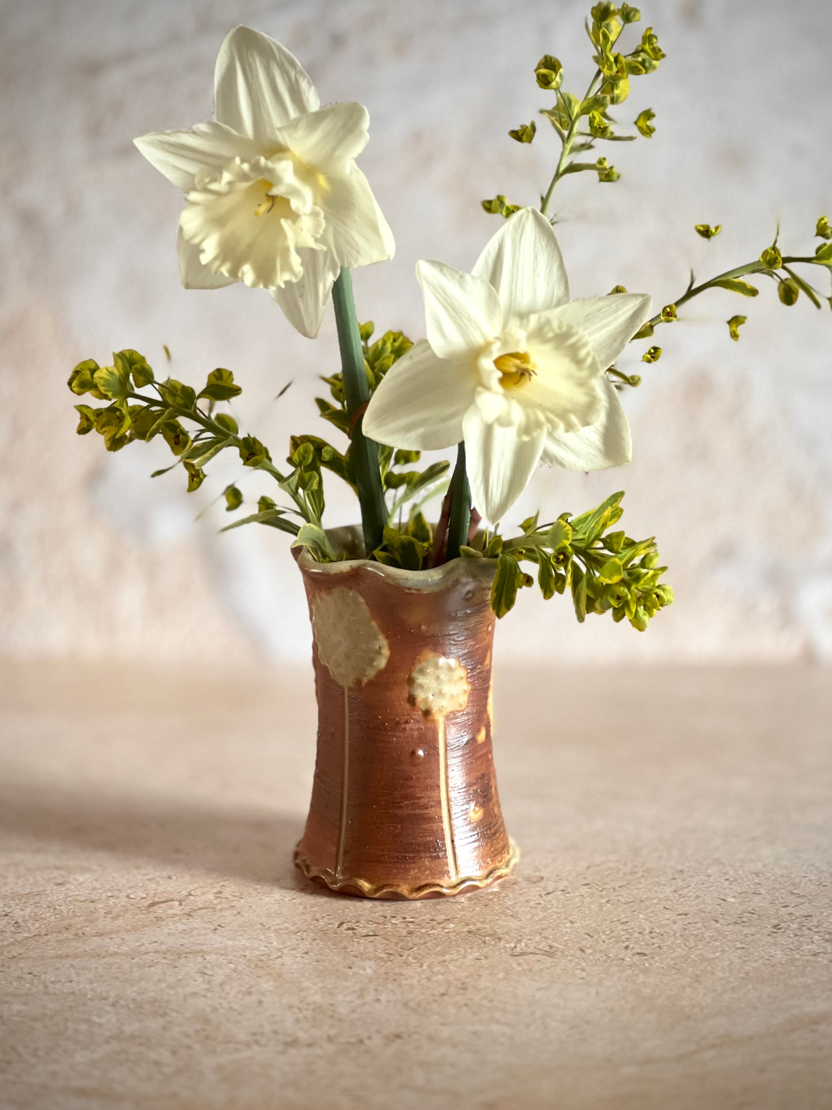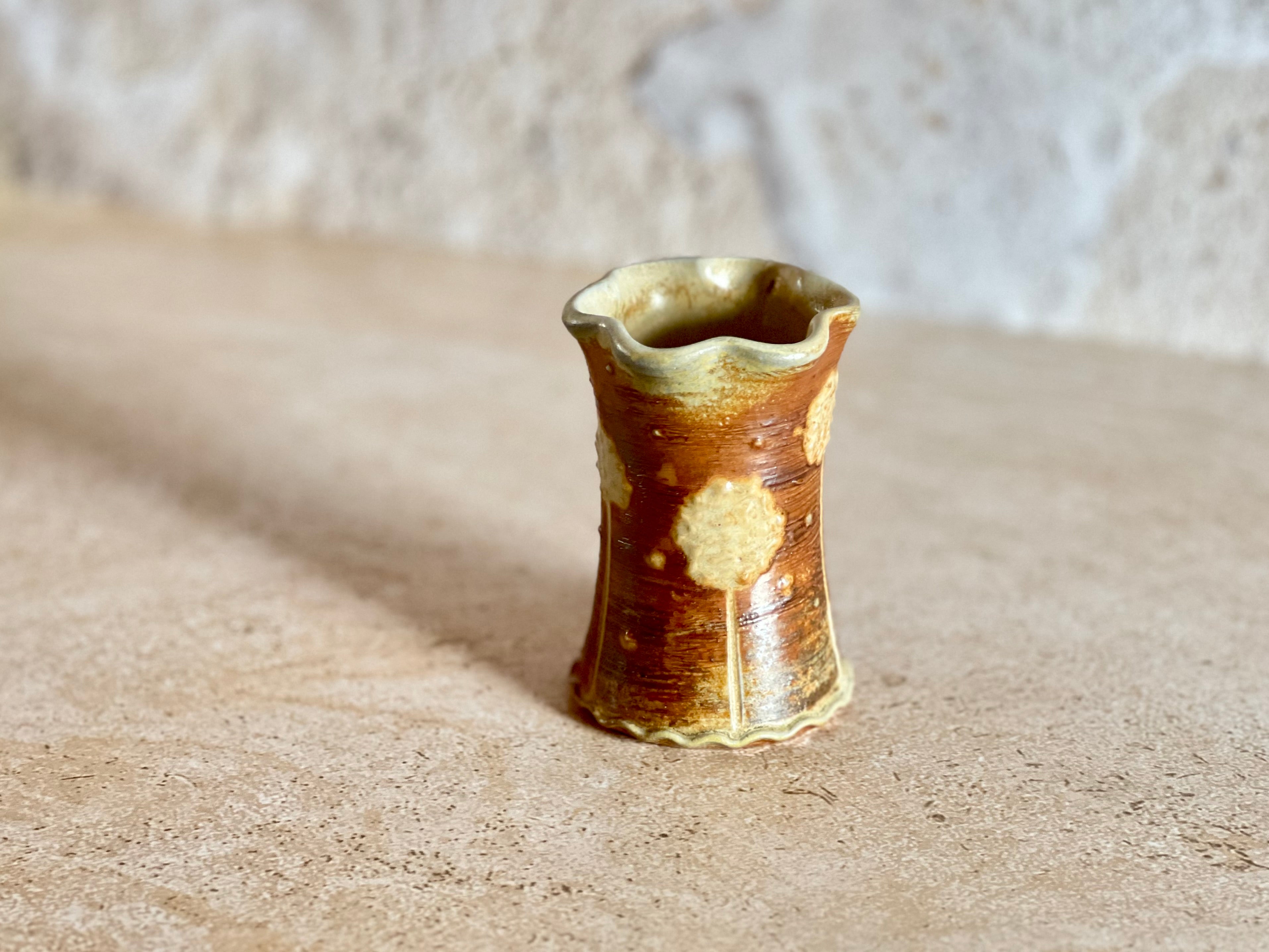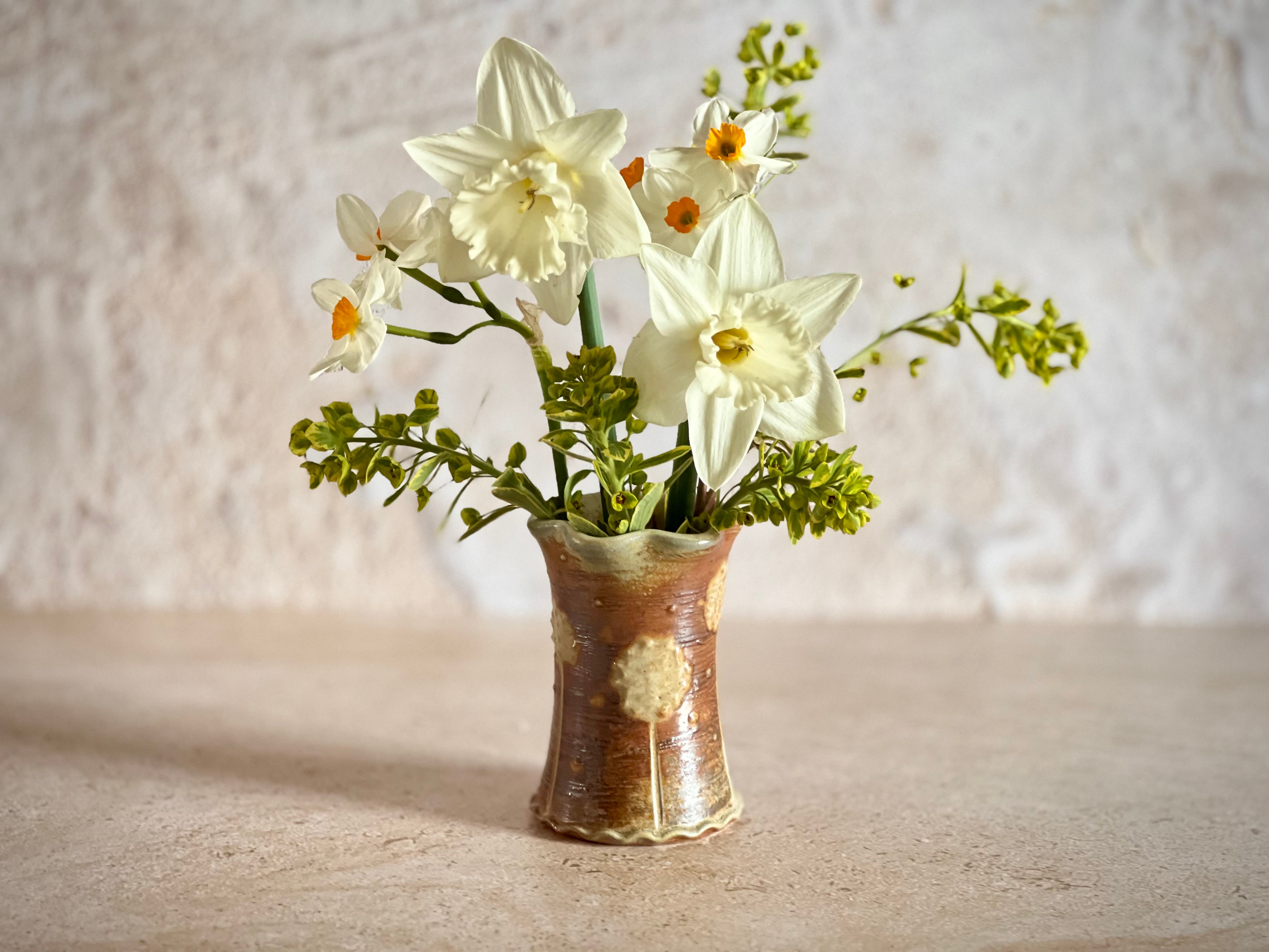 Textured blooms rise up the surface of this vase like dandelions just on the edge of letting go - soft, simple, full of quiet energy and potential. The wood firing swept warm golden hues across the surface, while the wavy rim and carved foot finish it with a playful touch.