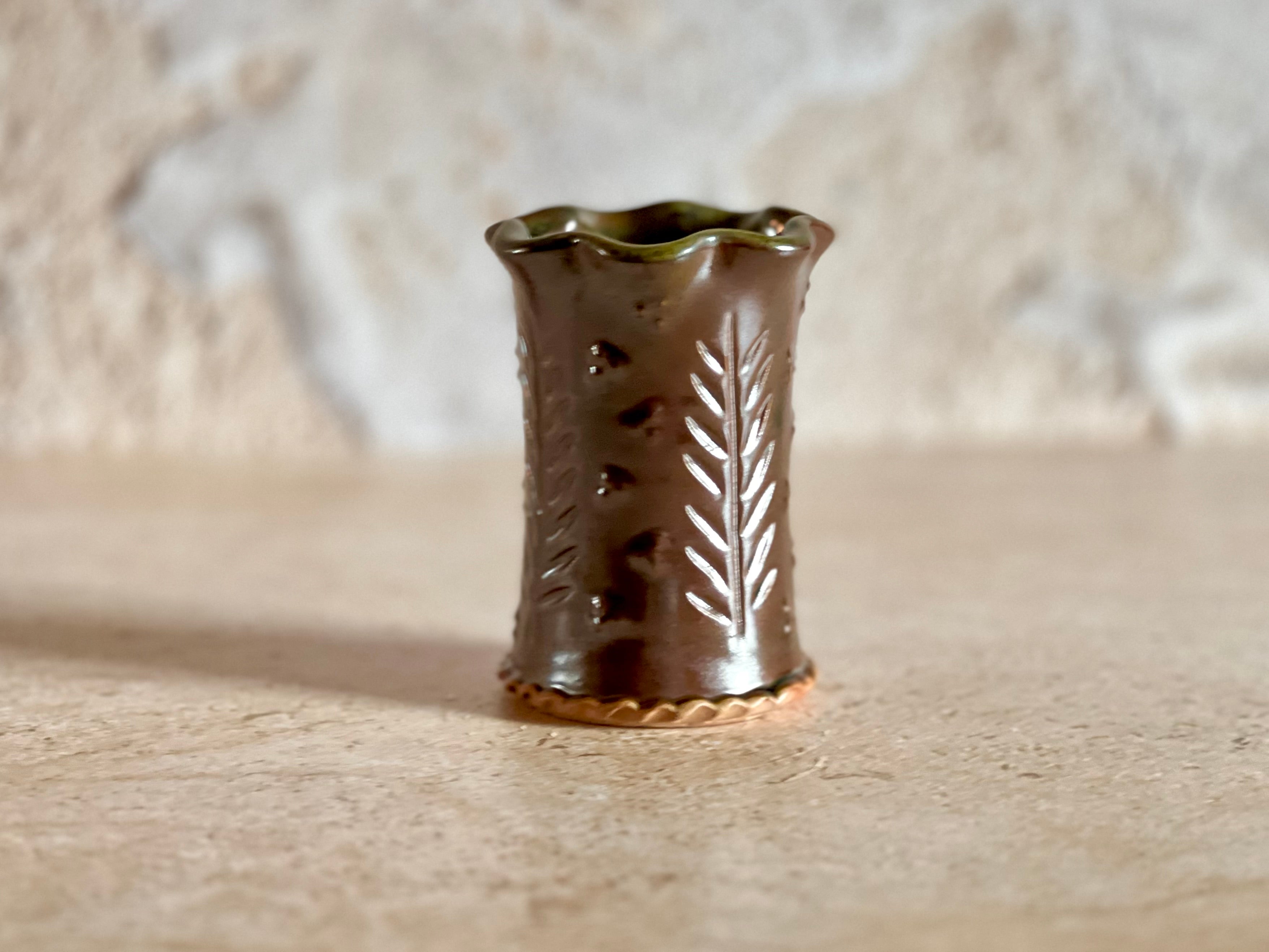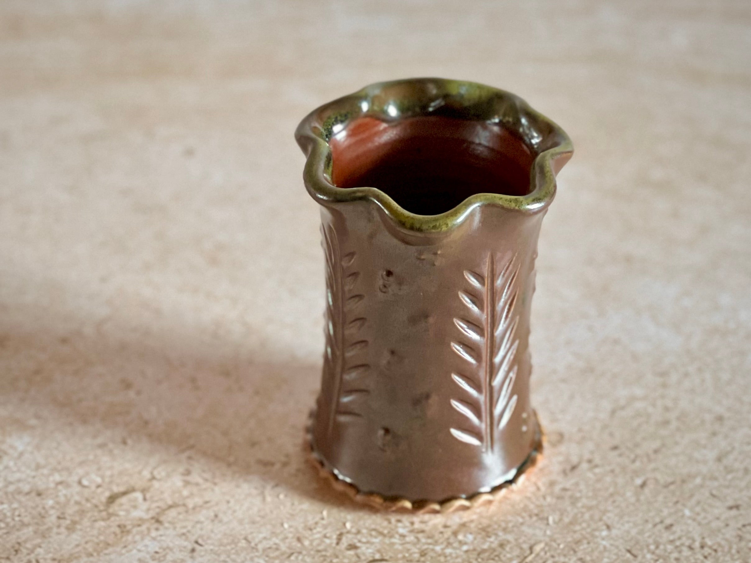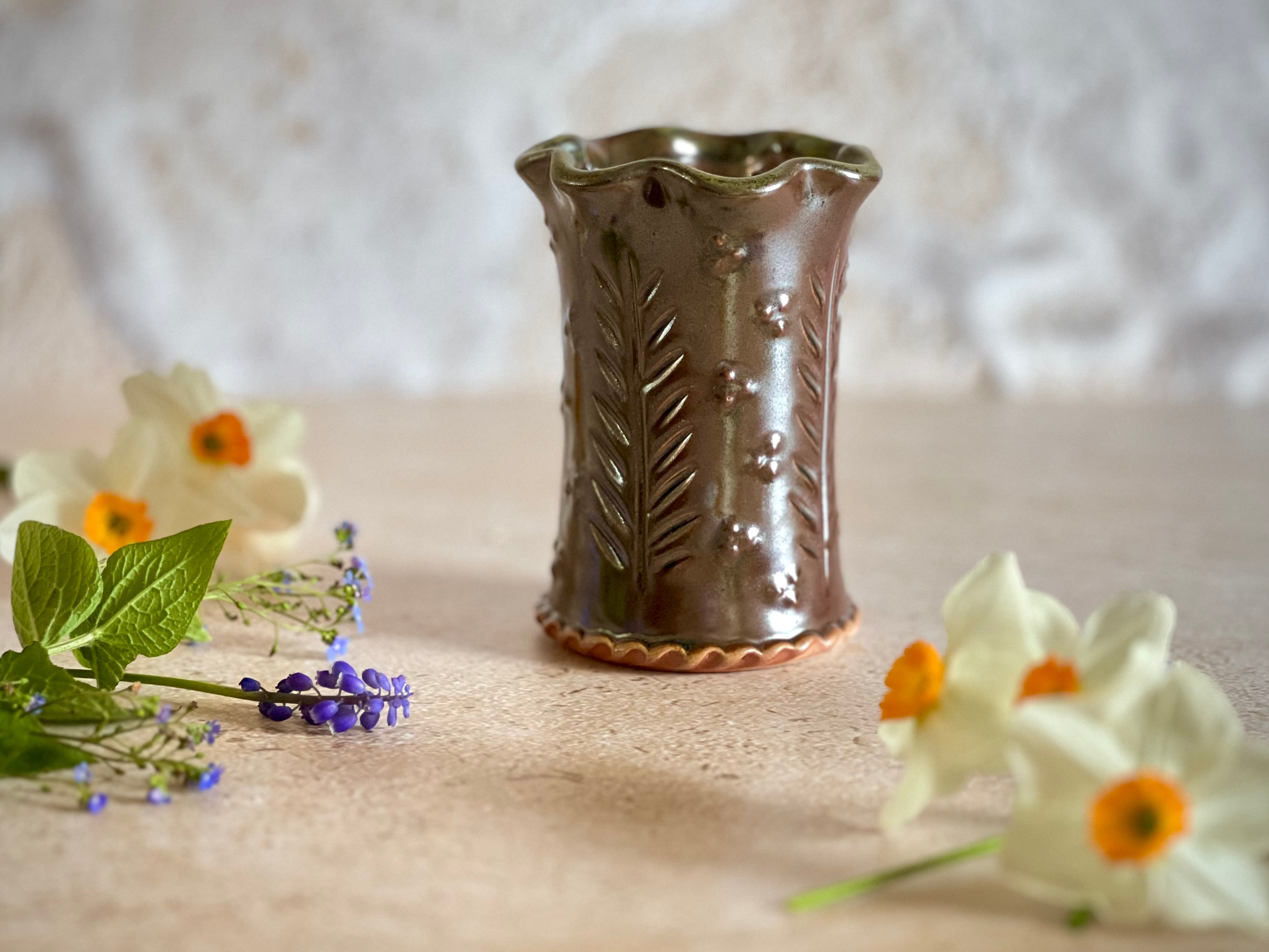 This vase has a quiet shimmer, with a bronzy brown surface that shifts in the light—hinting at green along the carved stems and berries. The glaze pools and breaks across every texture, giving depth to the decoration and a softness to the shine. Finished with a wavy rim and a scalloped foot for just a little extra movement.