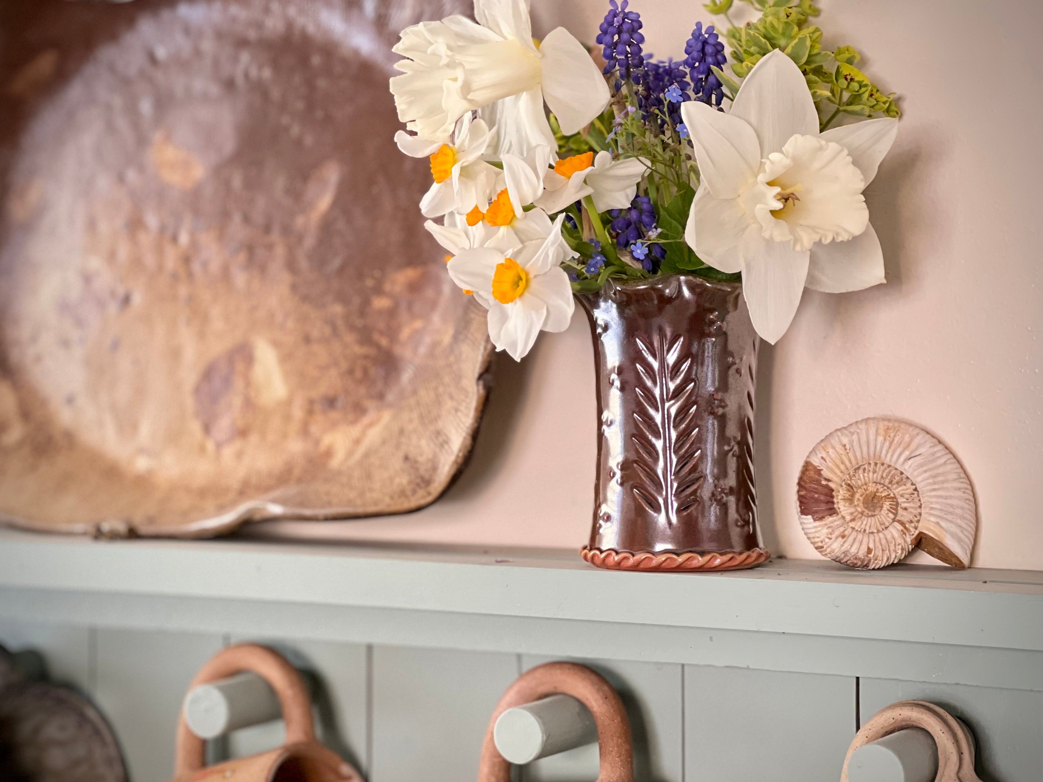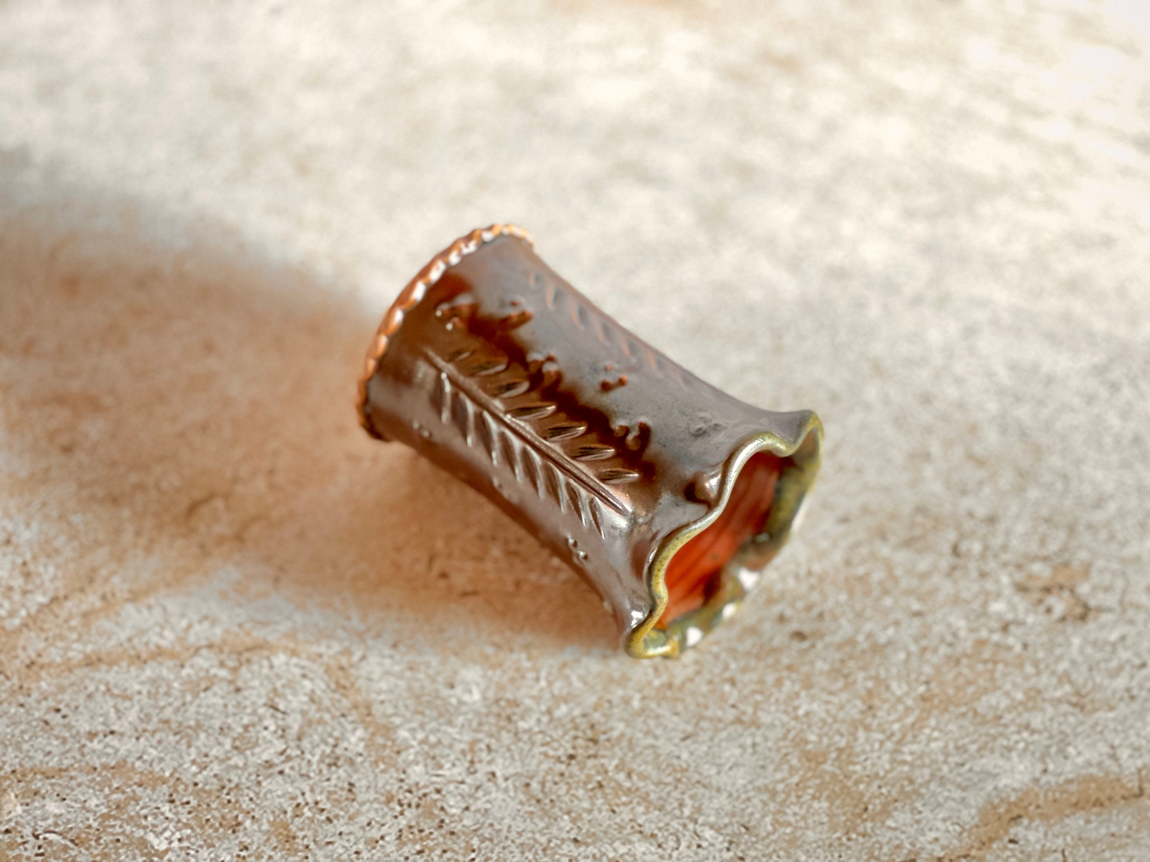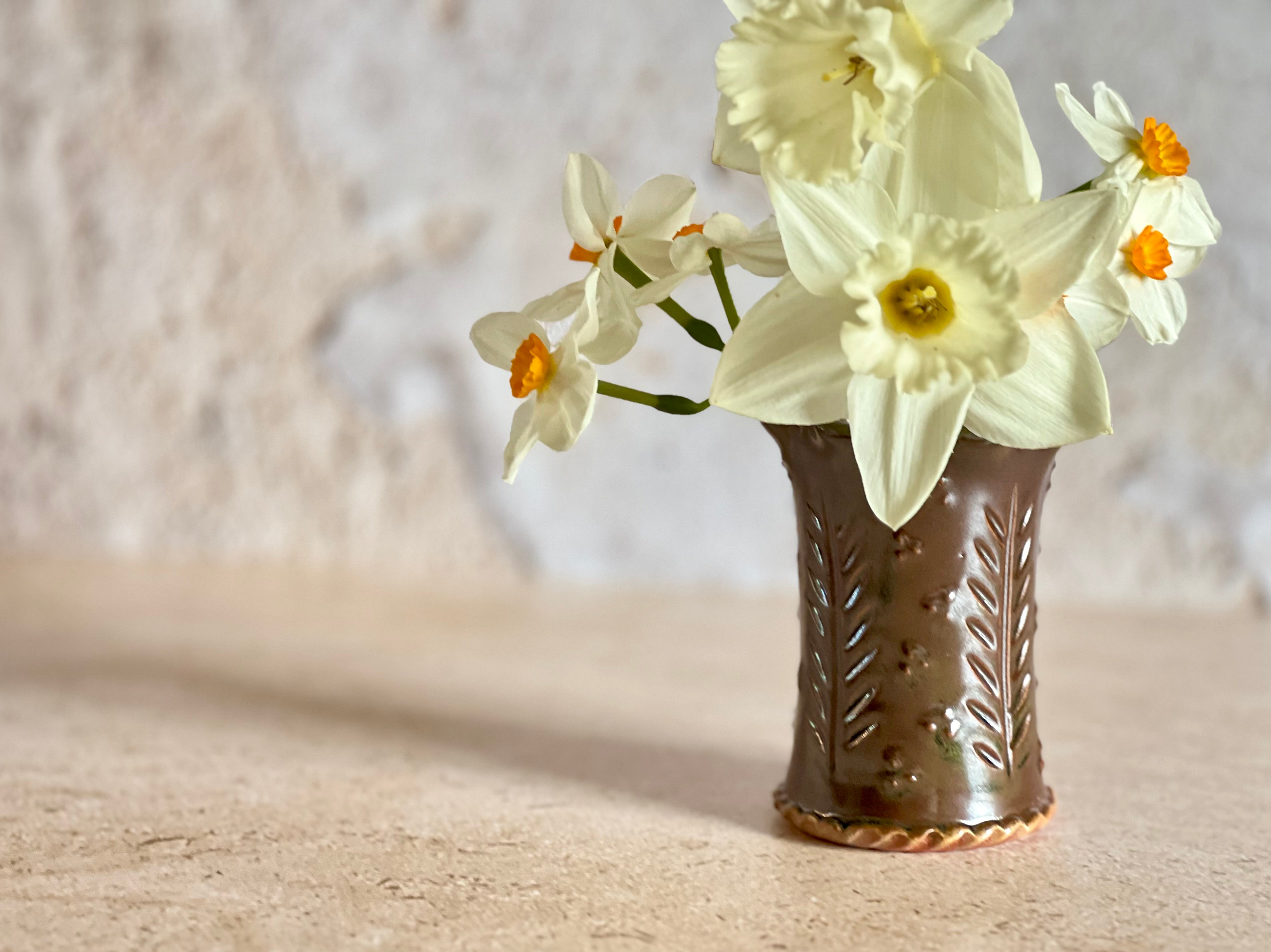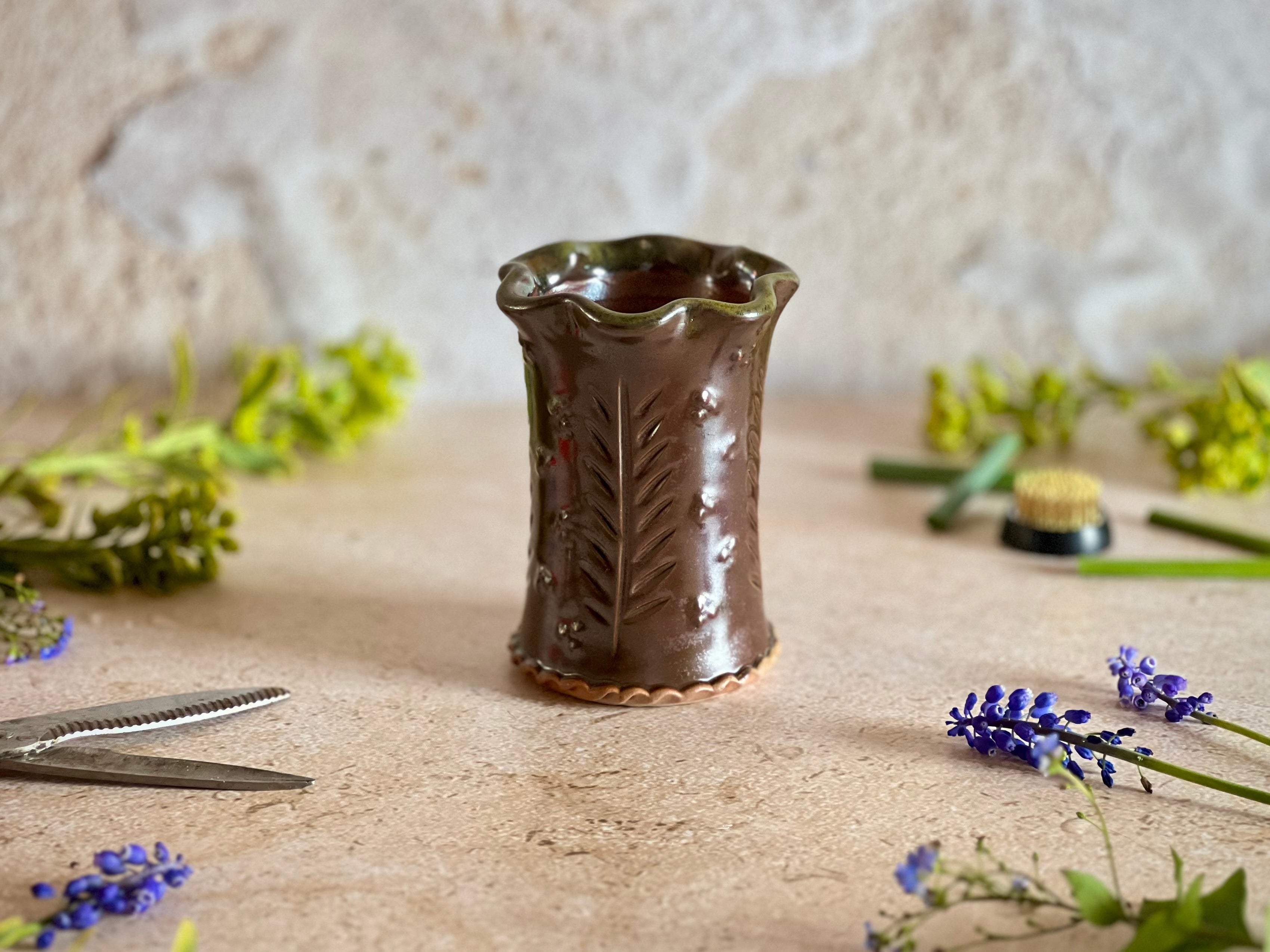 This vase has a quiet shimmer, with a bronzy brown surface that shifts in the light—hinting at green along the carved stems and berries. The glaze pools and breaks across every texture, giving depth to the decoration and a softness to the shine. Finished with a wavy rim and a scalloped foot for just a little extra movement.