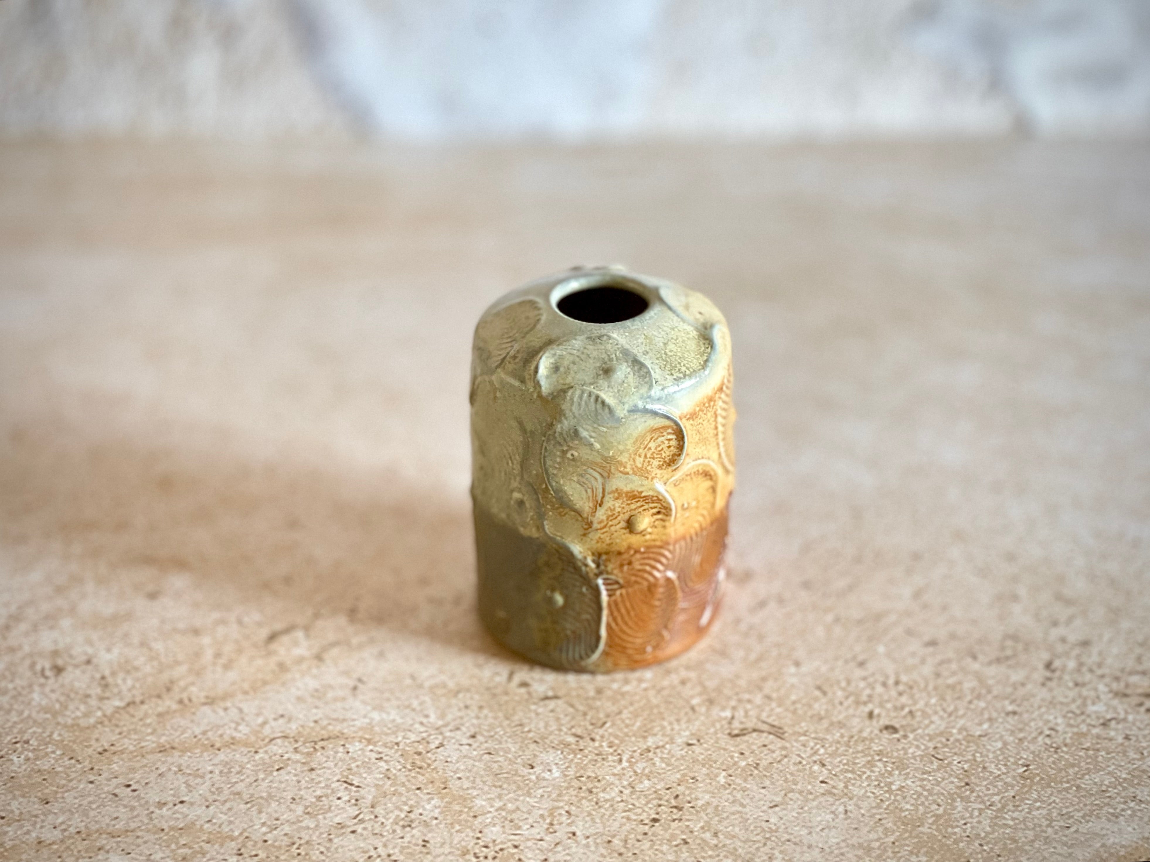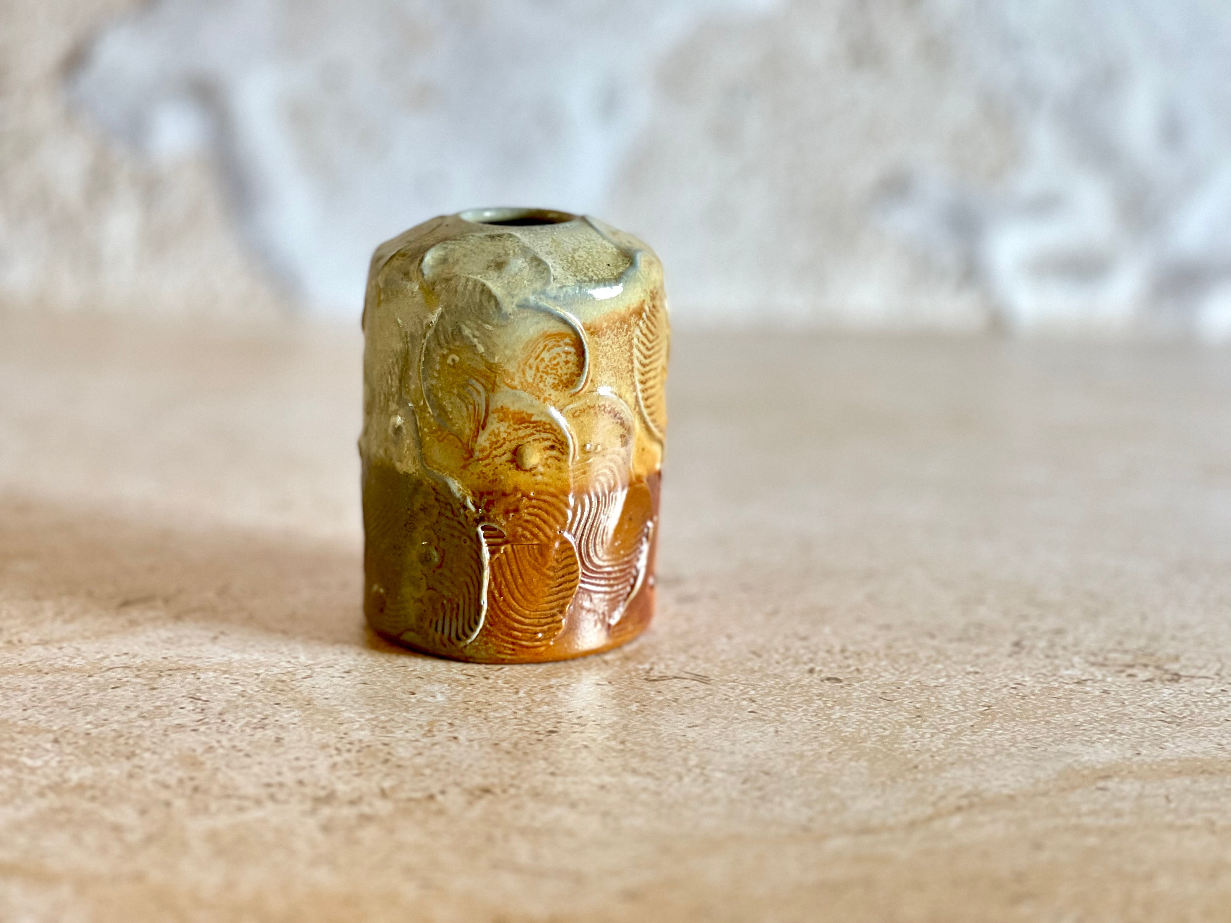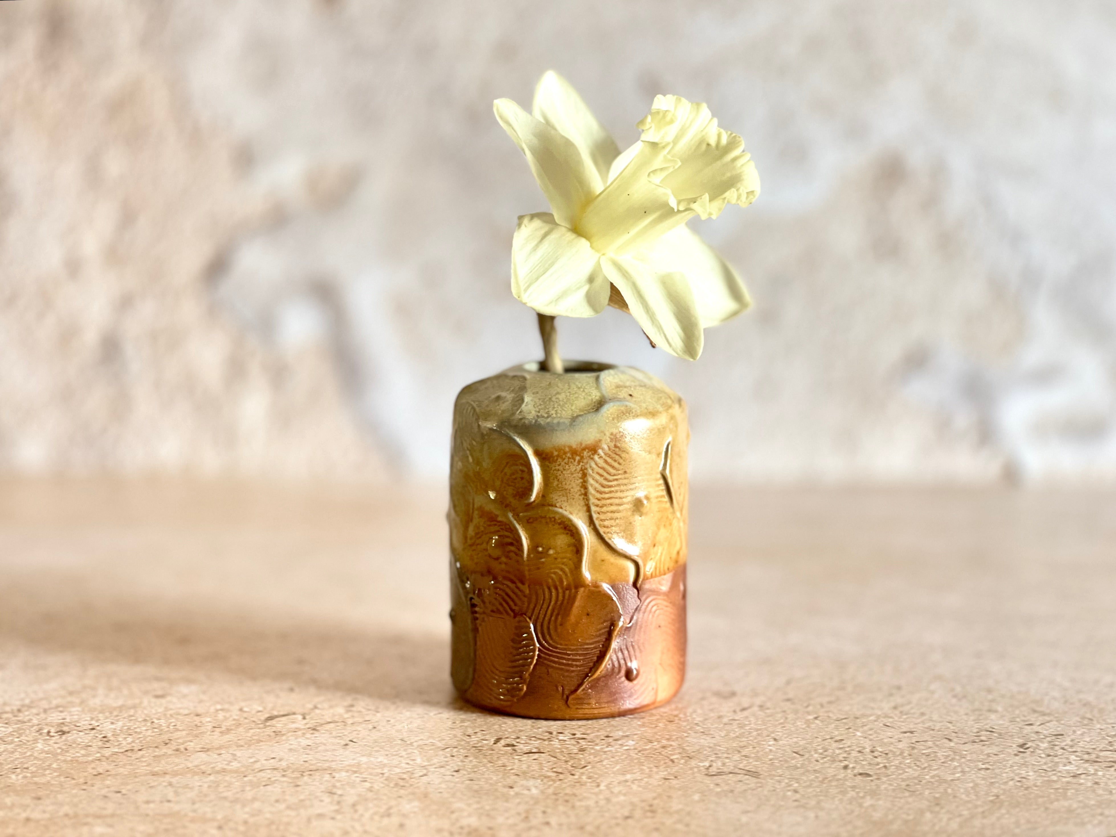 This piece has a quiet strength to it. Textured with layered, rhythmic patterns that catch the light and guide the eye, the wood firing brought out a golden blush that deepens to rich ember tones near the base, and subtle ash effects soften the transitions. Compact in size, but full of presence, it’s perfect on its own or holding a single, sculptural stem.