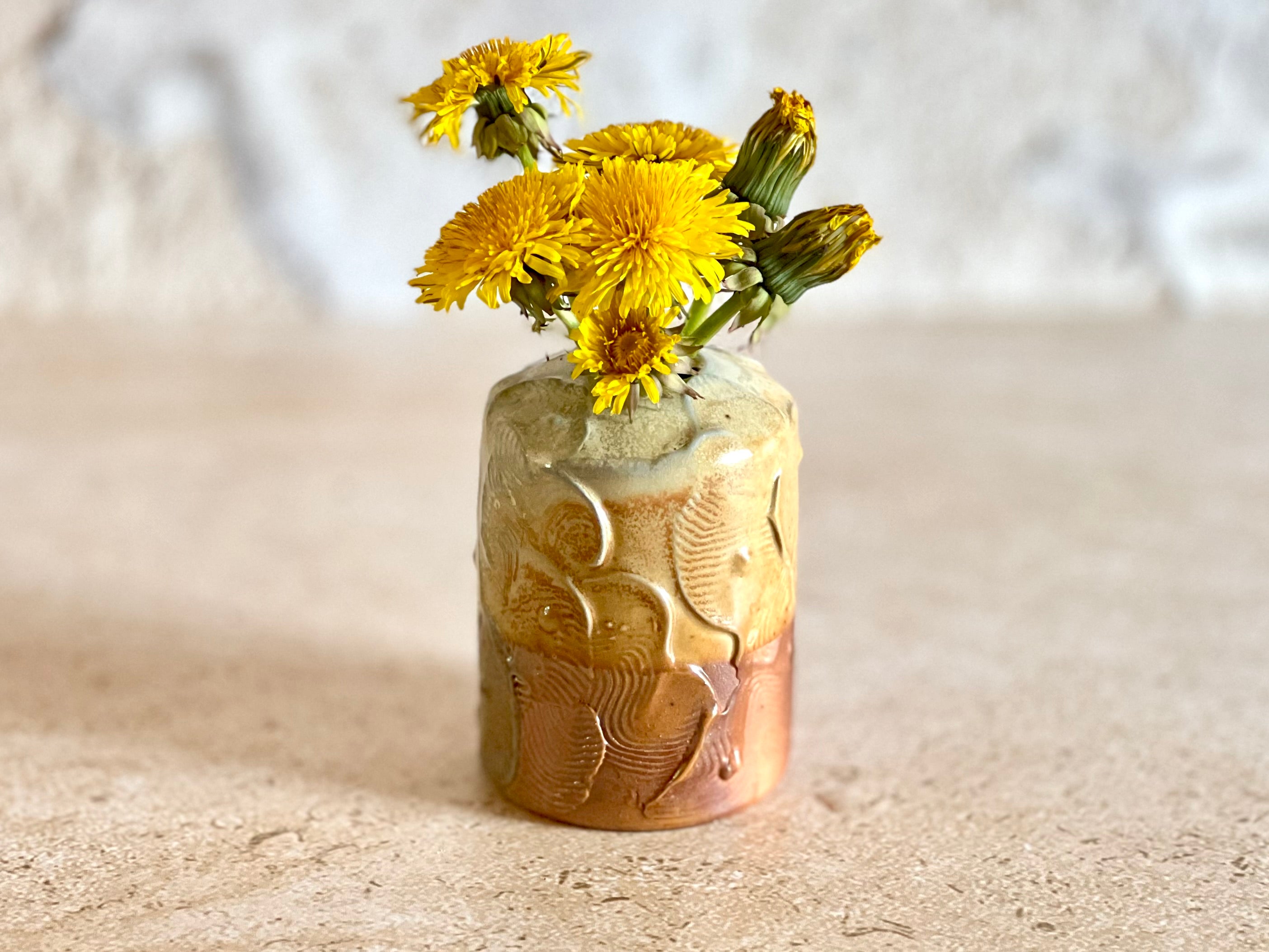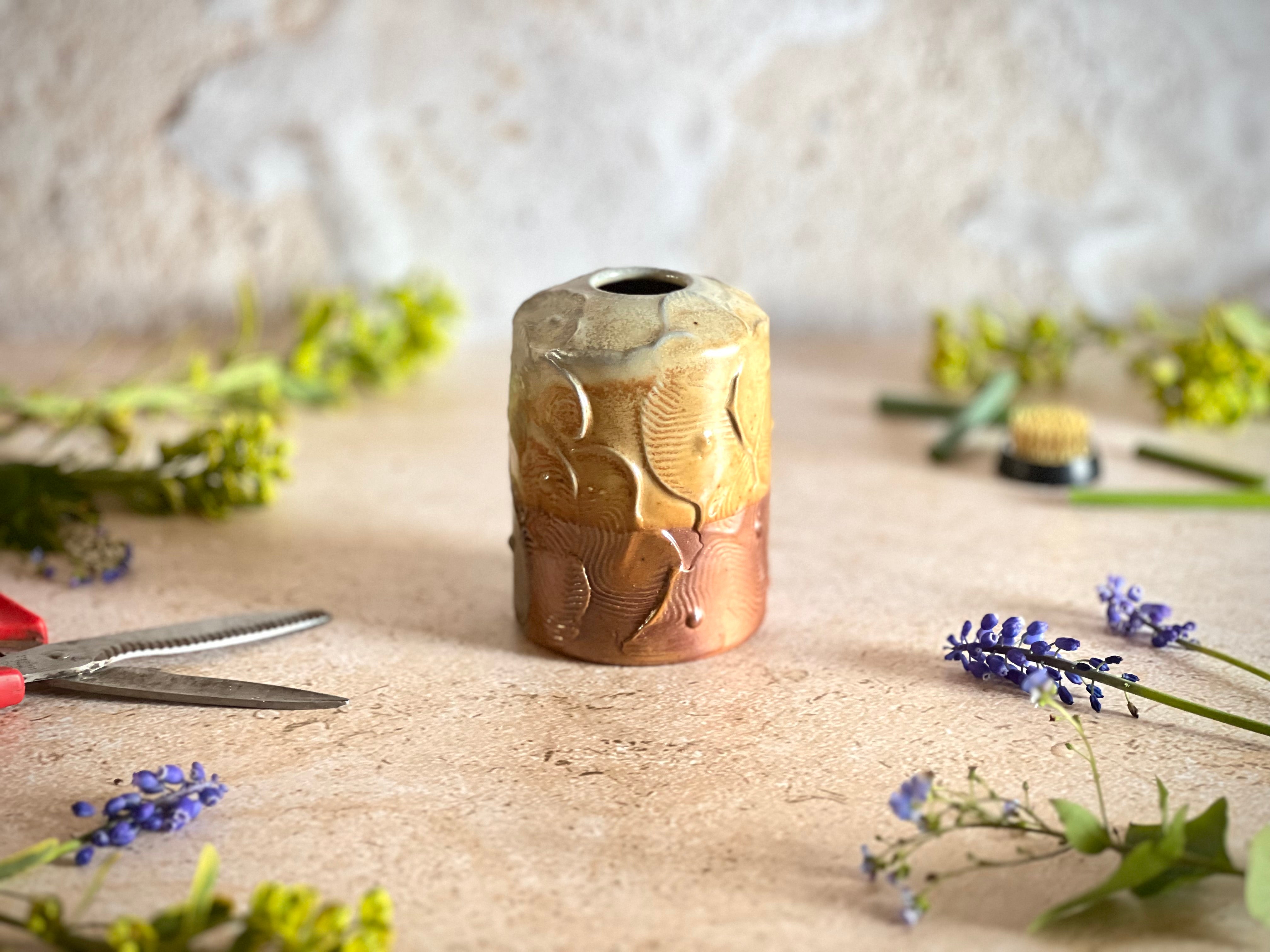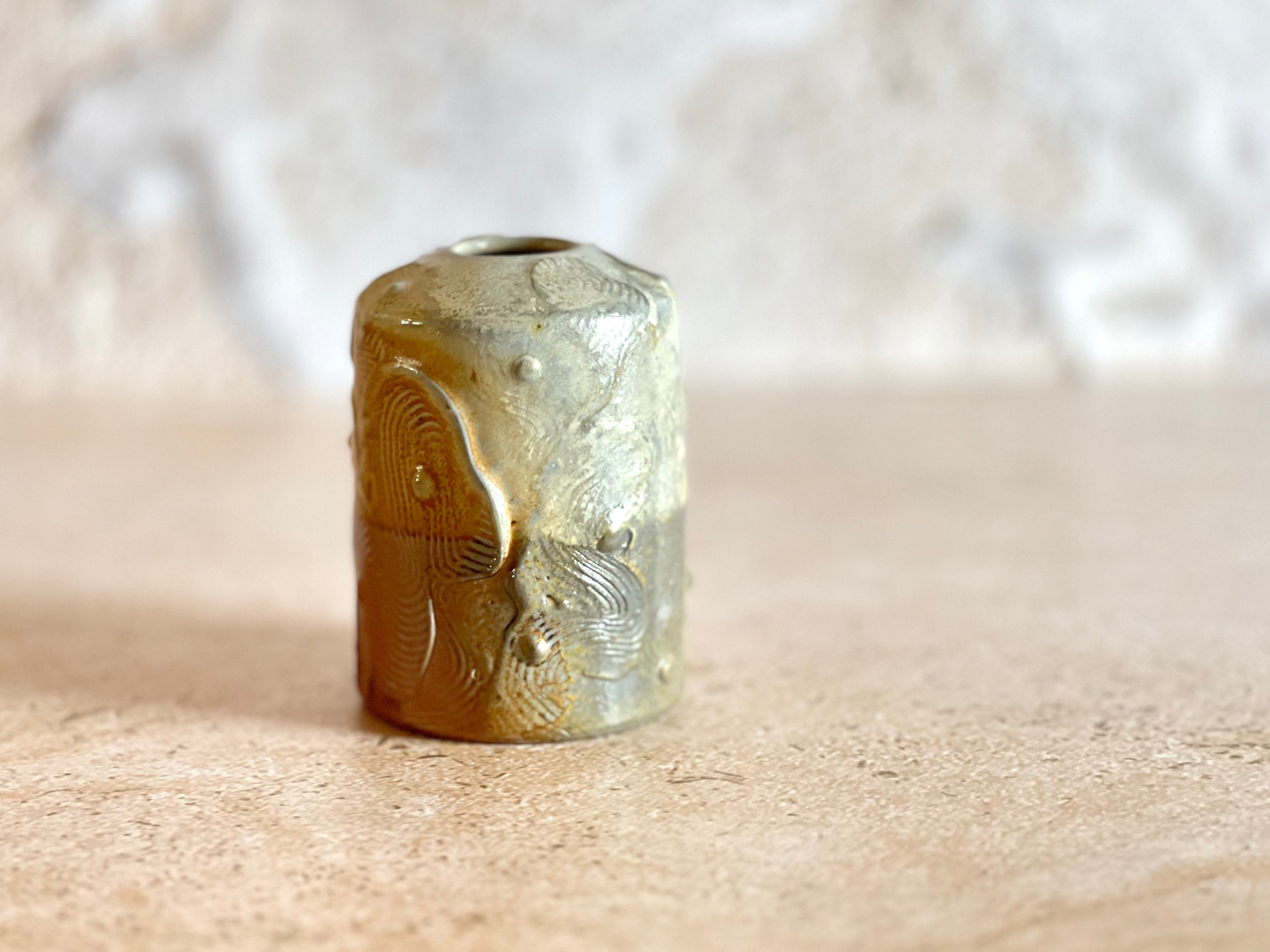 This piece has a quiet strength to it. Textured with layered, rhythmic patterns that catch the light and guide the eye, the wood firing brought out a golden blush that deepens to rich ember tones near the base, and subtle ash effects soften the transitions. Compact in size, but full of presence, it’s perfect on its own or holding a single, sculptural stem.